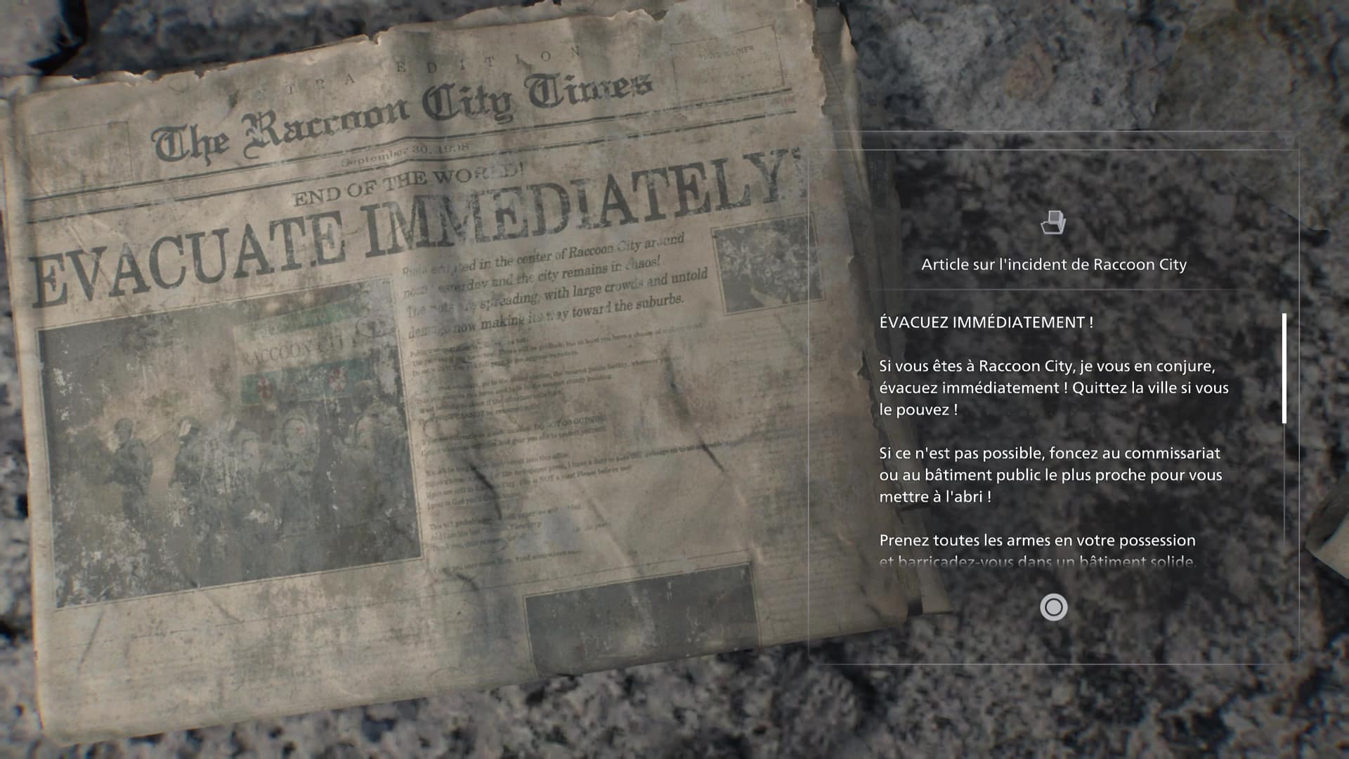 - Emplacement : Dès que vous êtes aux commandes de Leon, faites quelques pas en avançant vers la droite. L’article de journal se trouve par terre.