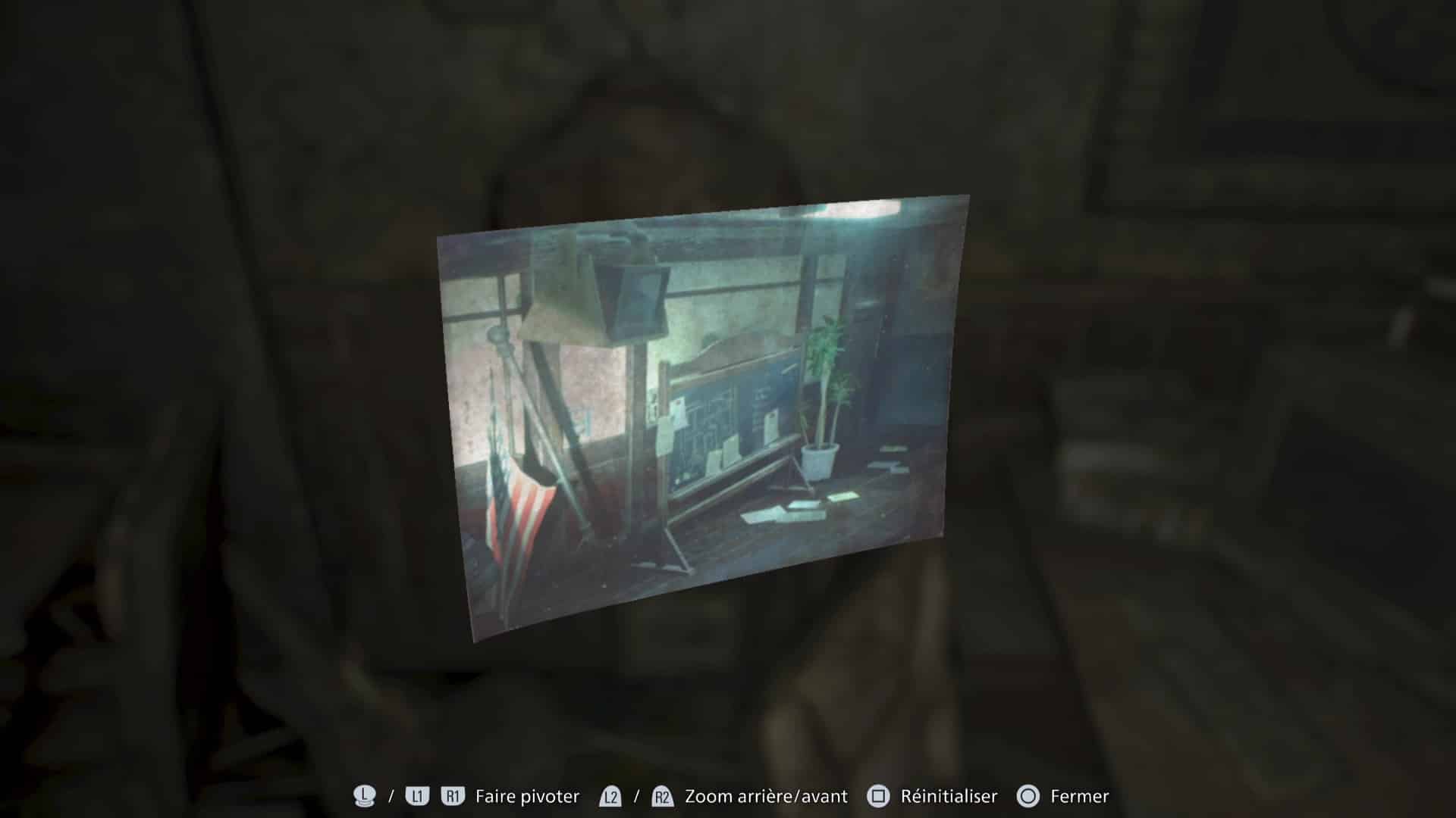 - Emplacement : Dernier document présent dans le Bureau des S.T.A.R.S., au 1ᵉʳ étage. Vous remarquerez un casier sur la droite au moment d’entrer dans la pièce. Ouvrez-le pour mettre la main sur la deuxième photo.