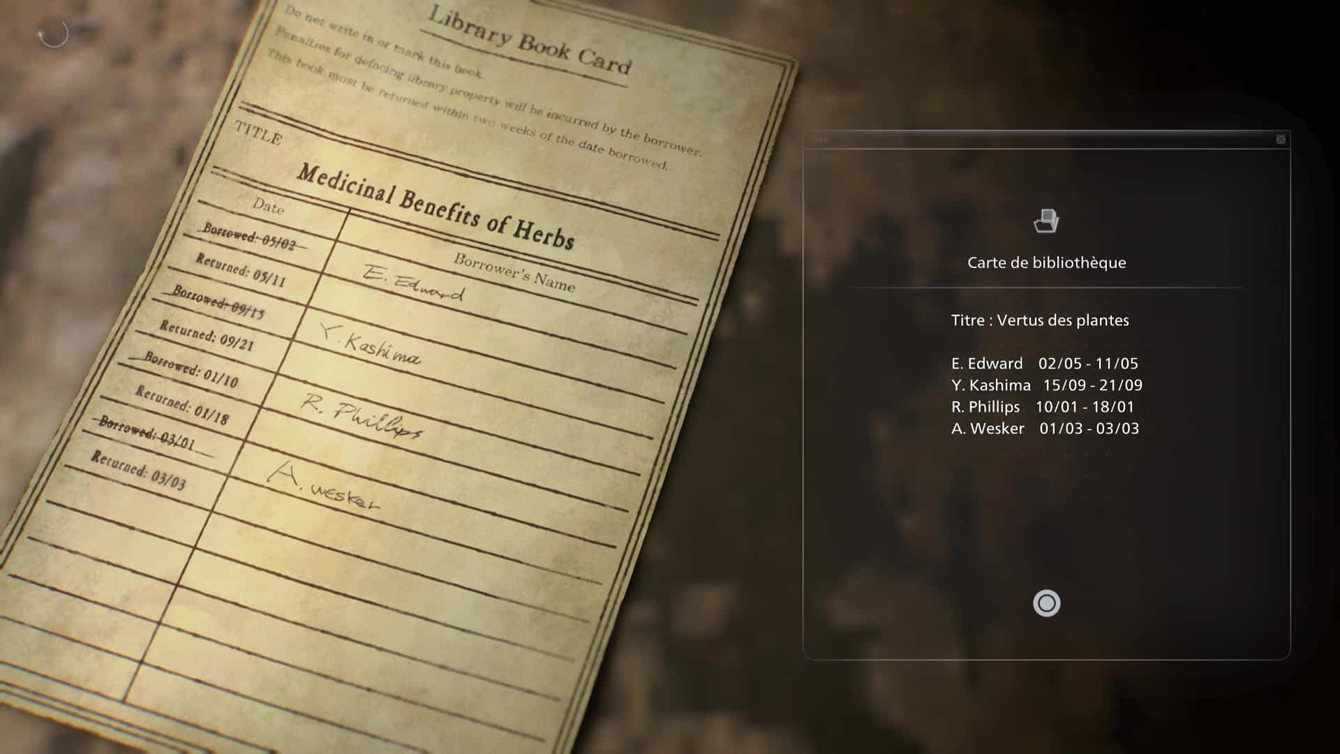 - Emplacement : À nouveau dans le Bureau des S.T.A.R.S., au 1ᵉʳ étage, entrez et allez au niveau du bureau le plus à gauche. La liste repose dessus.