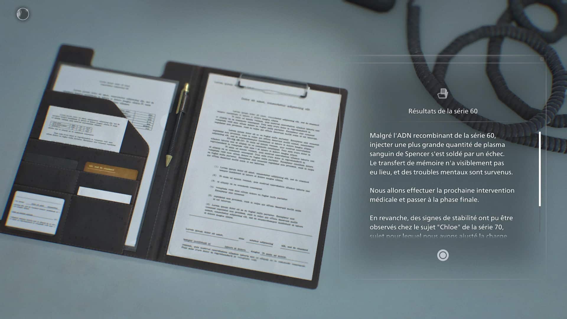 - Emplacement : Après avoir traversé les salles Prélèvements et tests et Développement, vous arriverez dans le Laboratoire privé. Sur le bureau à gauche, en entrant, vous trouverez un nouveau dossier.