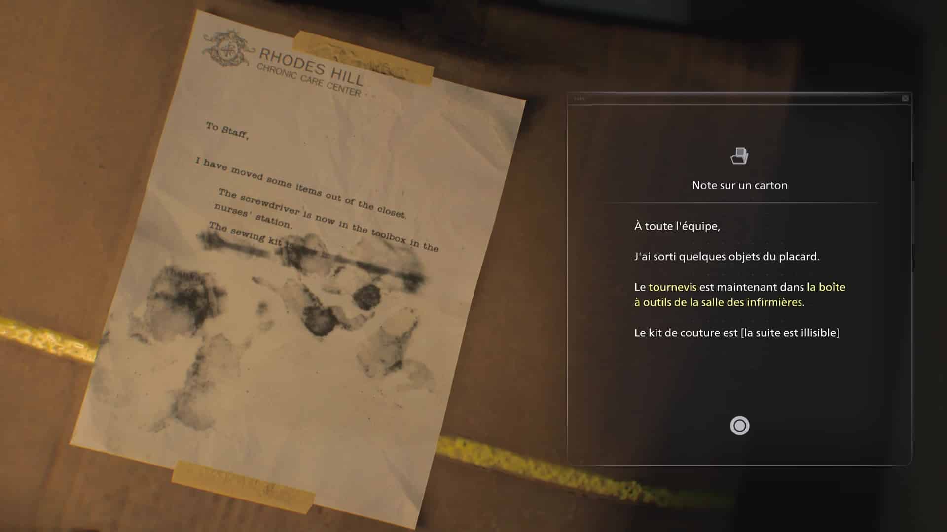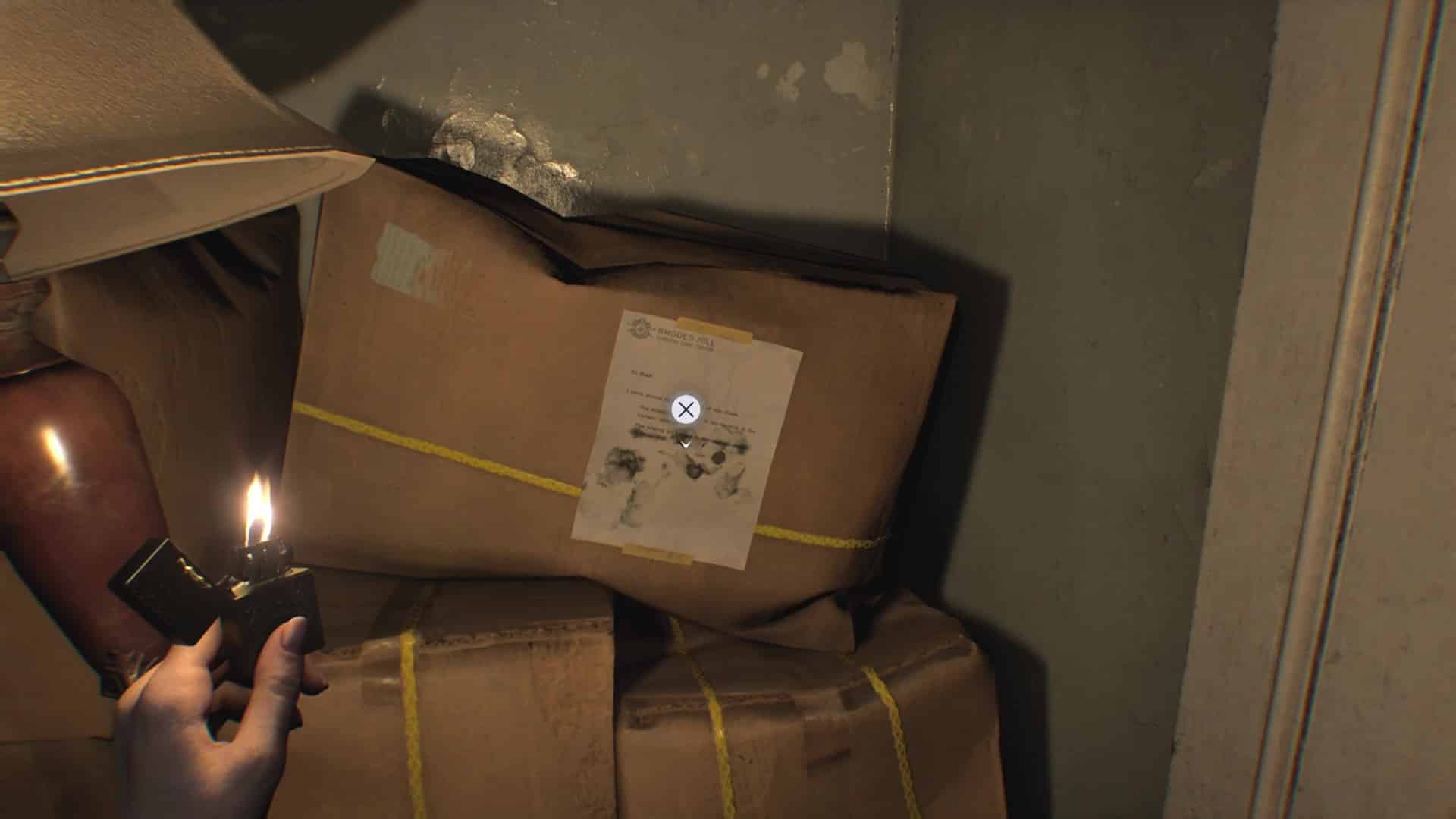 - Emplacement : Une fois en possession du briquet, faites demi-tour. Dans le couloir juste avant la lumière rouge, entrez par la porte de la Chambre 202, sur votre gauche. Au fond à gauche de la pièce, ouvrez le placard. Grace rattrapera une lampe, et la note est scotchée sur un carton dans ce placard.