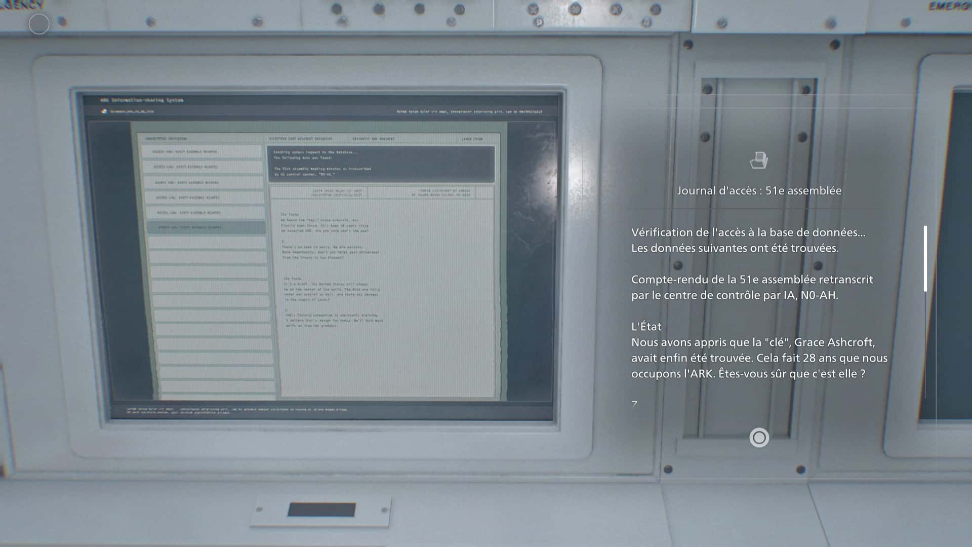 - Emplacement : Après avoir éliminé les soldats d’élite au niveau de l’Entrepôt, continuez votre exploration de l’ARK jusqu’à arriver en haut d’un escalier entouré de mannequins. Au lieu de continuer tout droit, allez à droite pour rejoindre le Salon des invités. Le document est un écran à consulter au fond à droite de la pièce.
