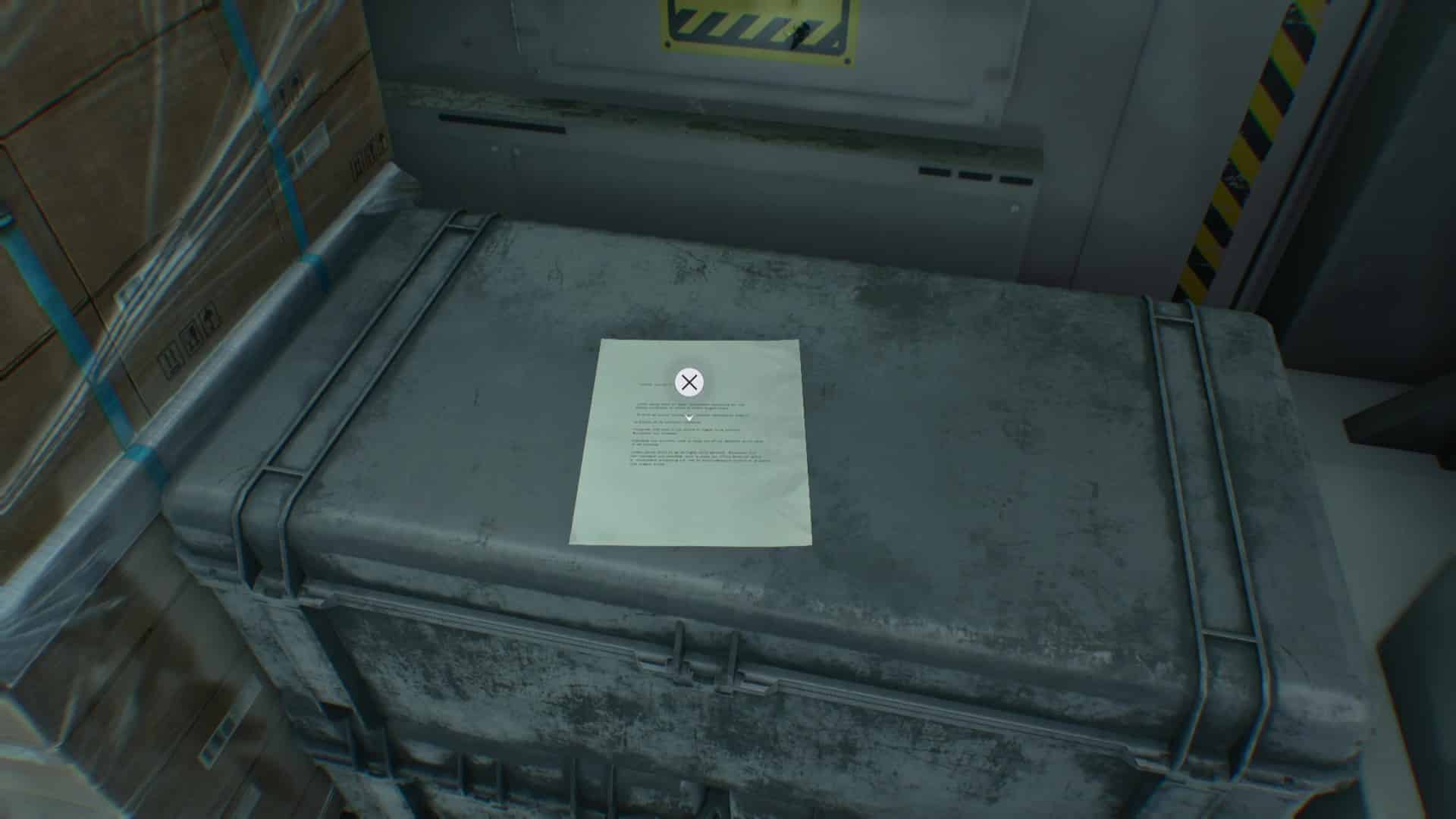 - Emplacement : Nécessite de posséder le bracelet d’identification (Nv.2). Au rez-de-chaussée côté aile est, et une fois l’accès à l’Unité d’isolement rendu possible, entrez dans la pièce juste avant le Bureau du chef de la sécurité, le document se trouve sur un carton.