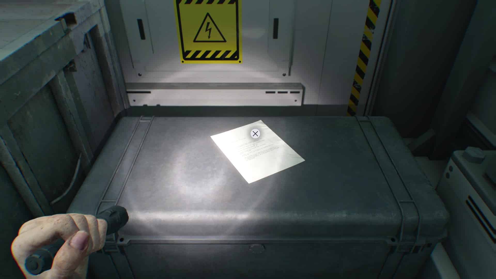 - Emplacement : Descendez les escaliers depuis l’Antichambre pour rejoindre la salle Stock d’armes biologiques 05. Remarquez le conteneur Umbrella Corporation droit devant vous, en bas des marches. Le document est à l’intérieur.