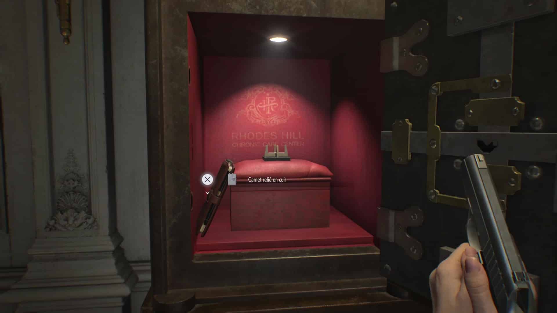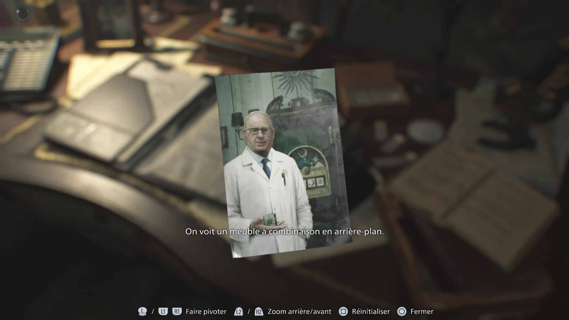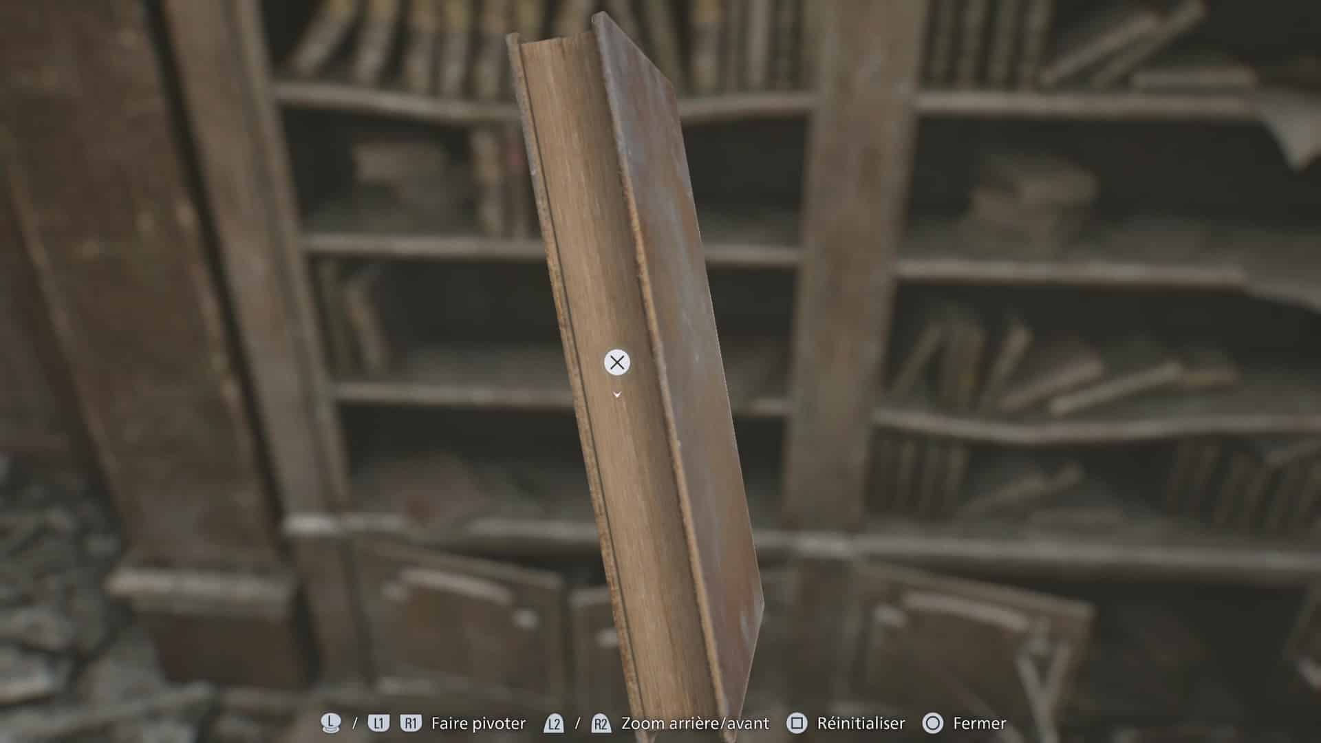 Observez ensuite l’étagère de droite, vous pouvez prendre un livre. Examinez-le et ouvrez-le en touchant la tranche de gouttière. Vous tomberez sur une photo. Faites pivoter la photo pour voir marqué « Rebecca Recrue Remarquable ». Il s’agit du code pour ouvrir la malette du Bureau des S.T.A.R.S..