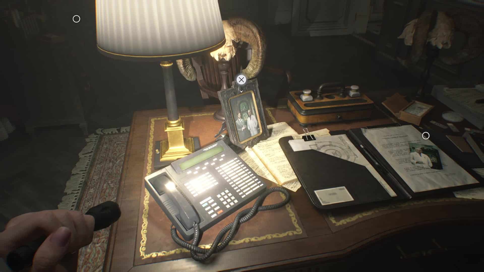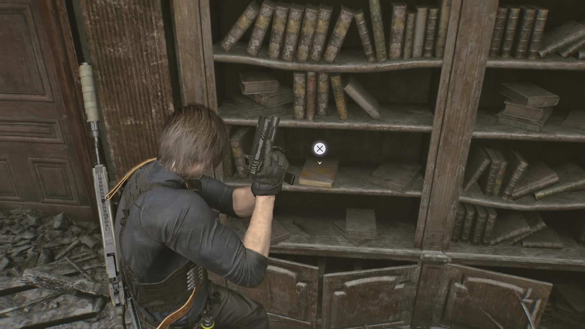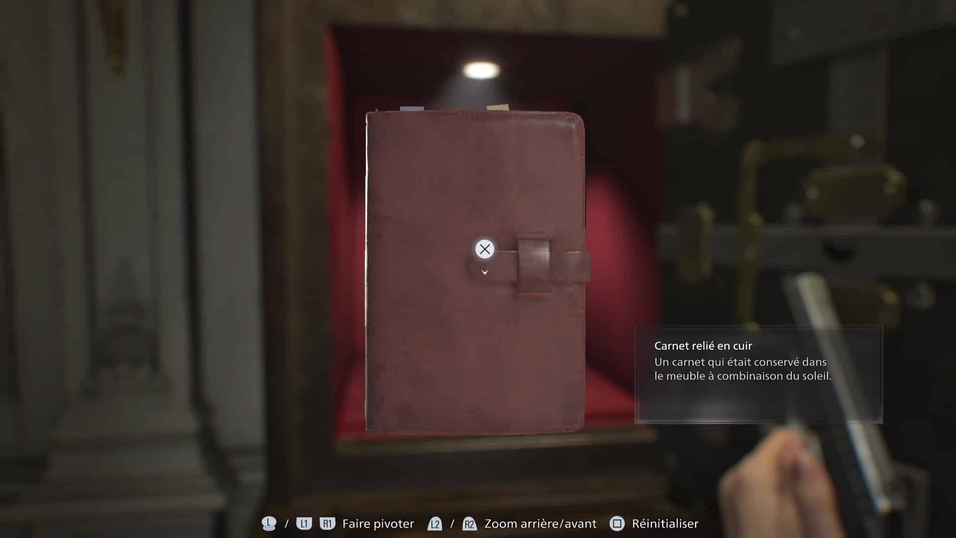 Observez ensuite l’étagère de droite, vous pouvez prendre un livre. Examinez-le et ouvrez-le en touchant la tranche de gouttière. Vous tomberez sur une photo. Faites pivoter la photo pour voir marqué « Rebecca Recrue Remarquable ». Il s’agit du code pour ouvrir la malette du Bureau des S.T.A.R.S..