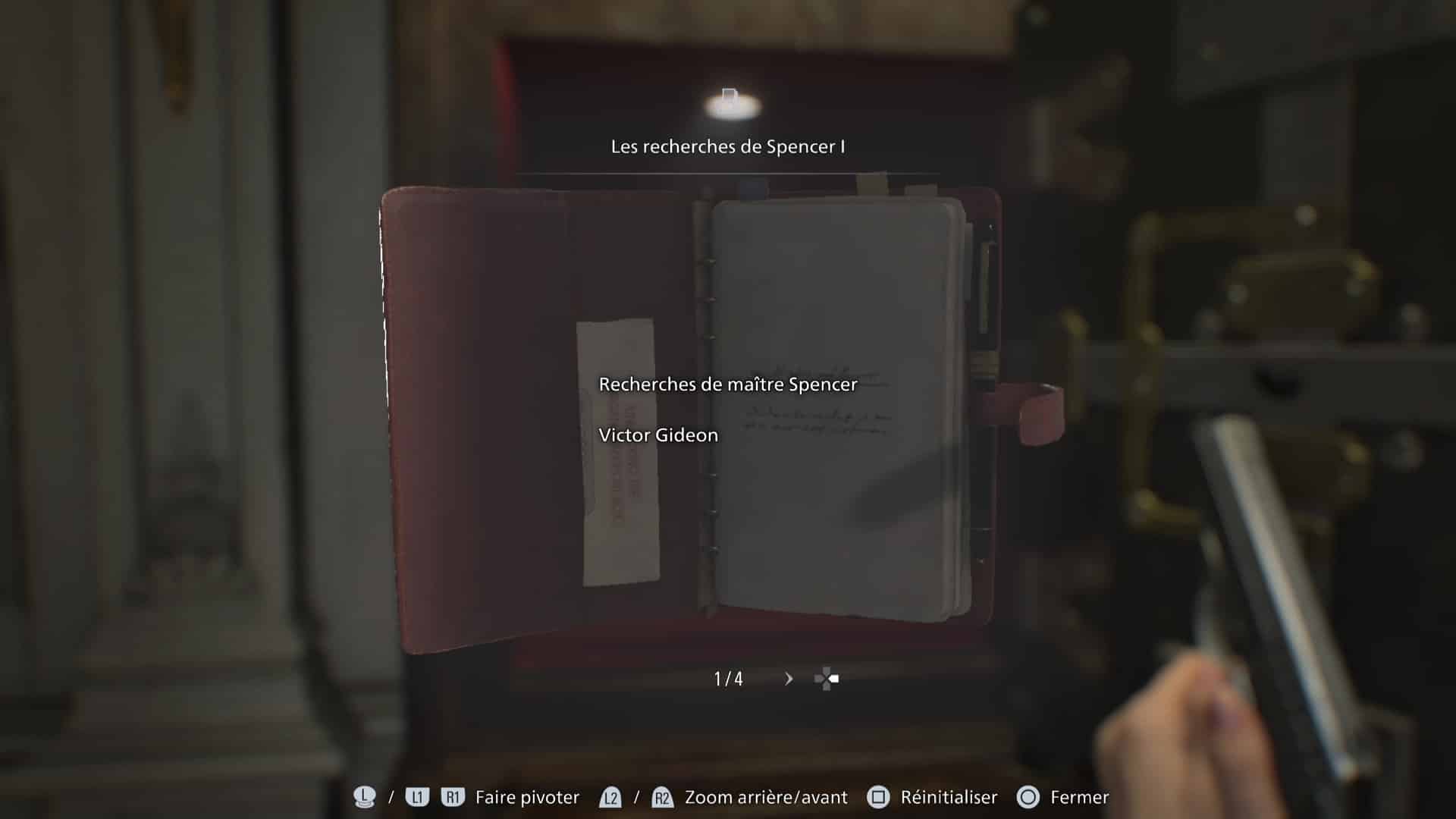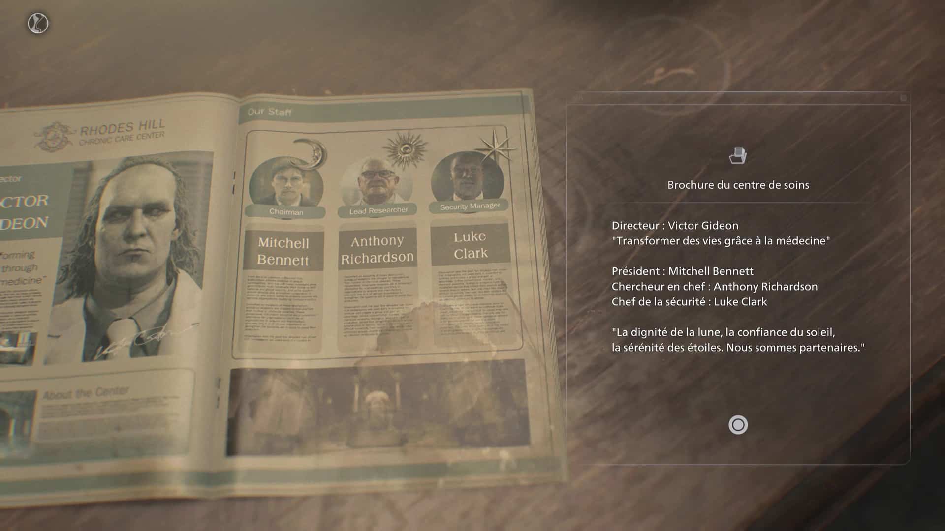 - Emplacement : En entrant dans le Bureau du gardien, où se trouve le premier point de sauvegarde, jetez un œil à la table basse. La brochure sur Victor Gideon vous y attend.
