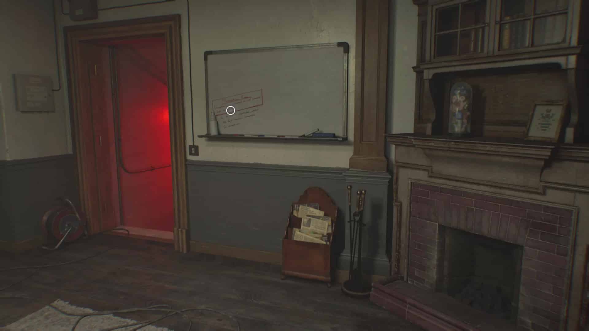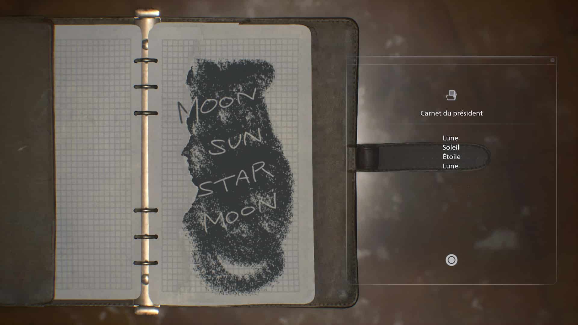 - Emplacement : Au 1ᵉʳ étage, dans le Bureau du président, un carnet déchiré repose sur une table basse. Pour lire son message, allez d’abord récupérer le crayon sur le bureau du président, après vous être occupé du zombie. En possession du crayon, examinez le « Carnet déchiré » et passez le crayon sur la page pour faire apparaître le message servant à résoudre l’énigme du meuble à combinaison du bureau du président.