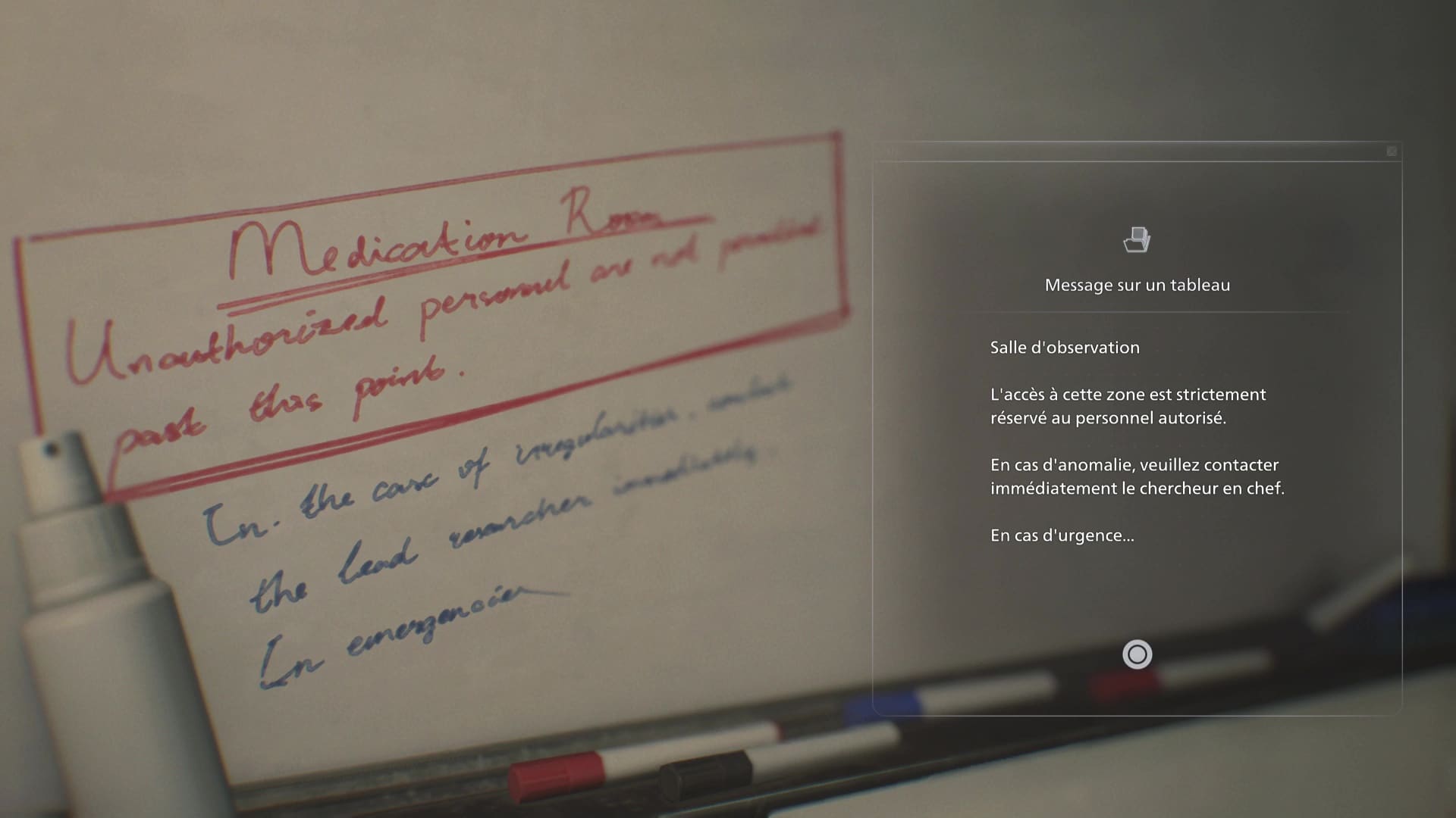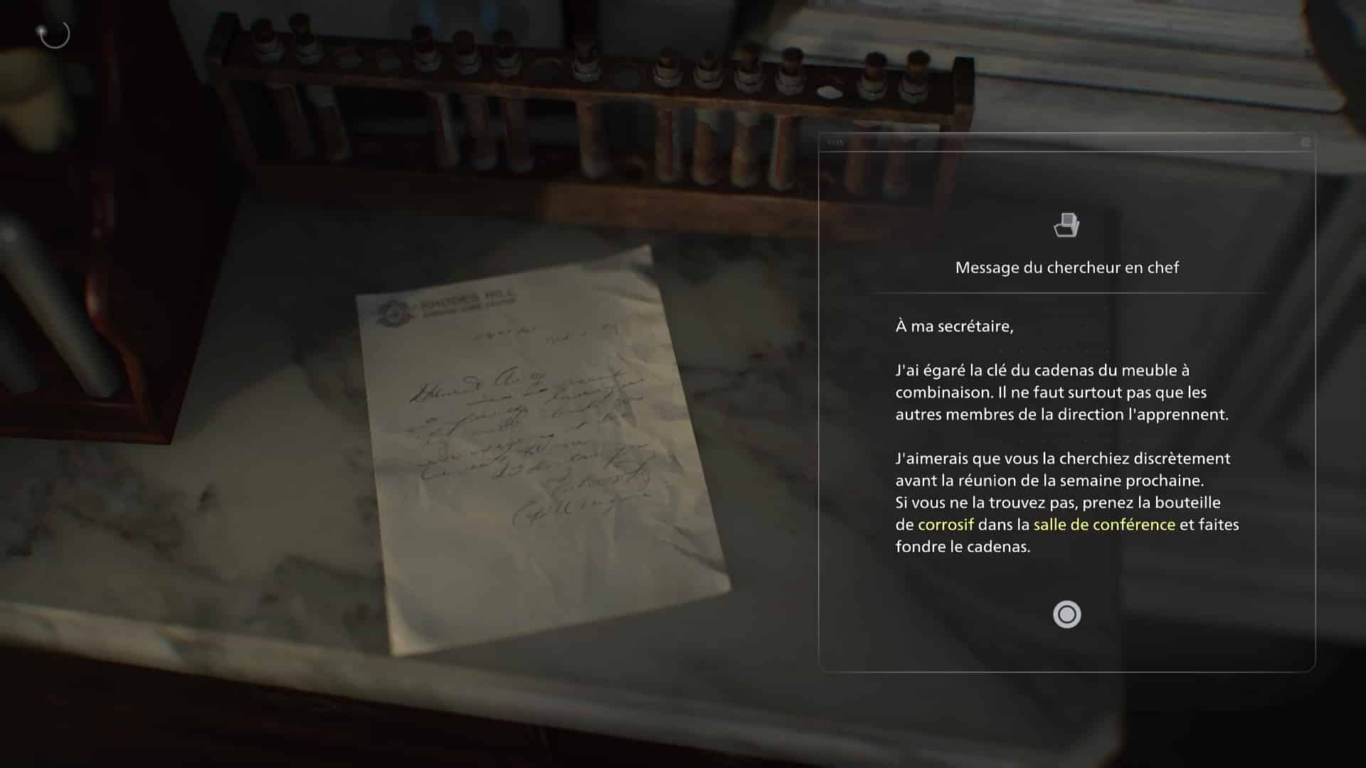 - Emplacement : Au 1ᵉʳ étage de l’aile est, entrez dans le Bureau du chercheur en chef. Le message est sur le meuble derrière le bureau.