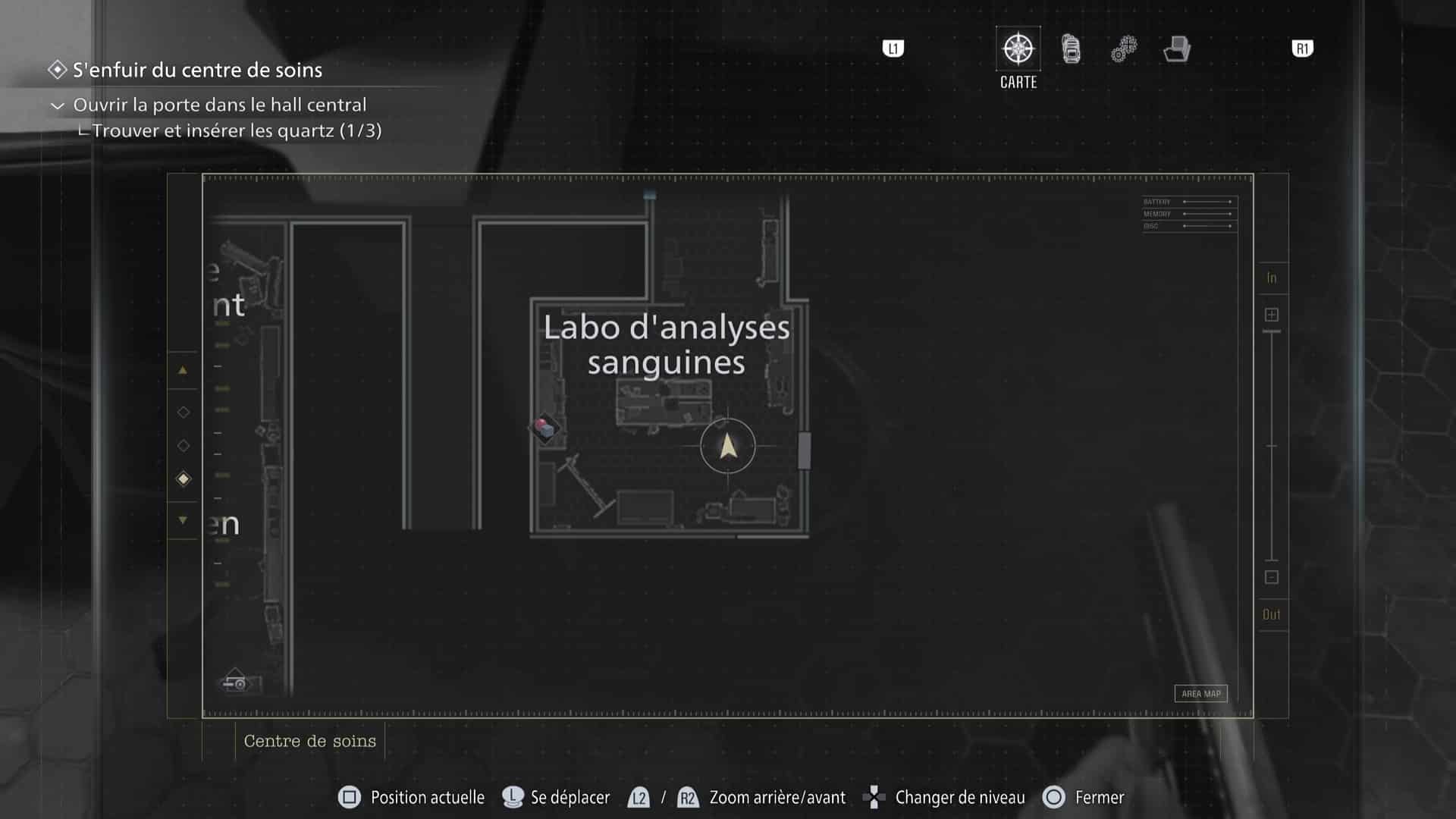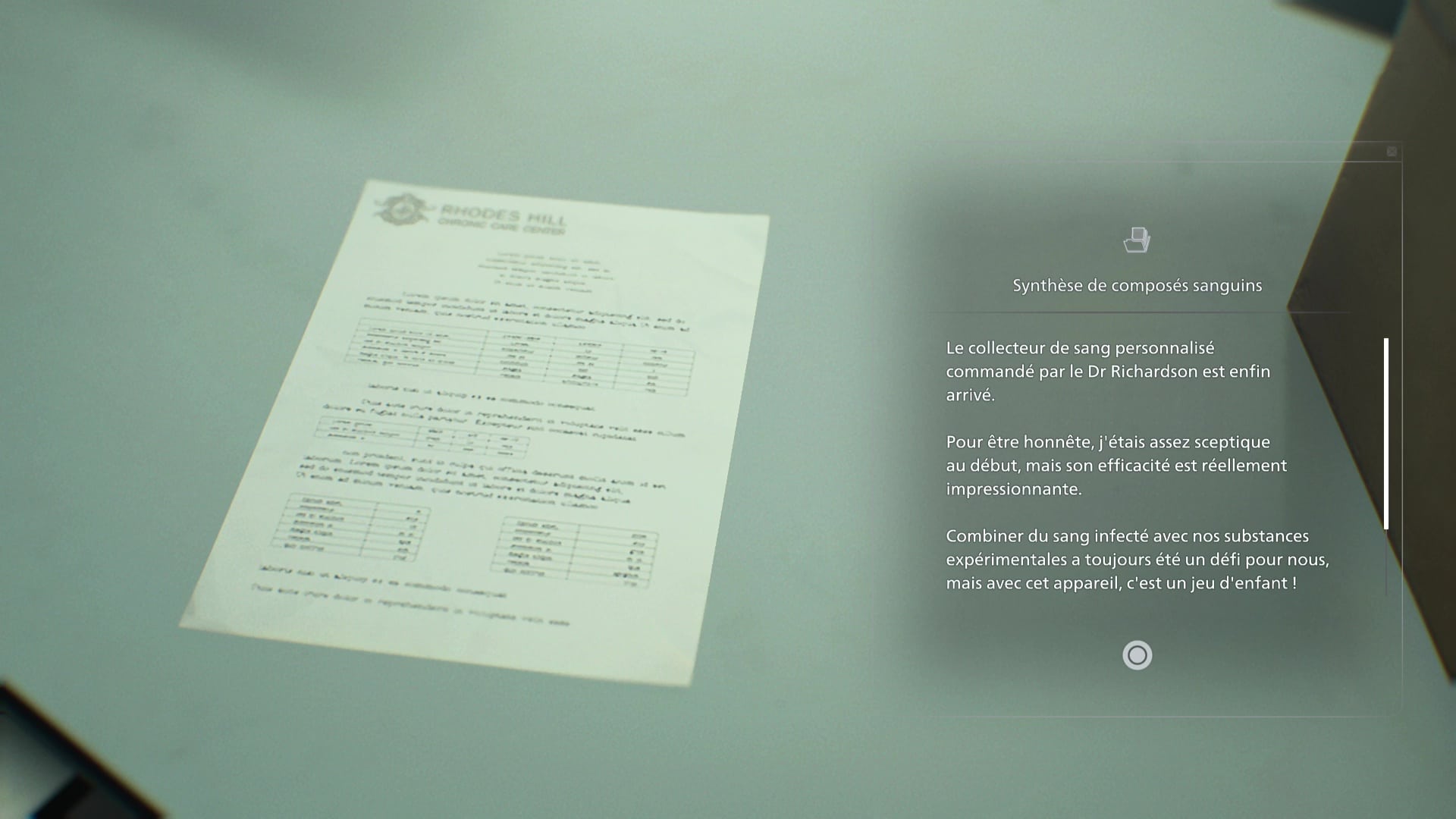 - Emplacement : Au rez-de chaussée, dans l’aile est, dans le Laboratoire des analyses sanguines, un document repose sur le plan de travail au centre de la pièce, de l’autre côté par rapport au collecteur de sang.