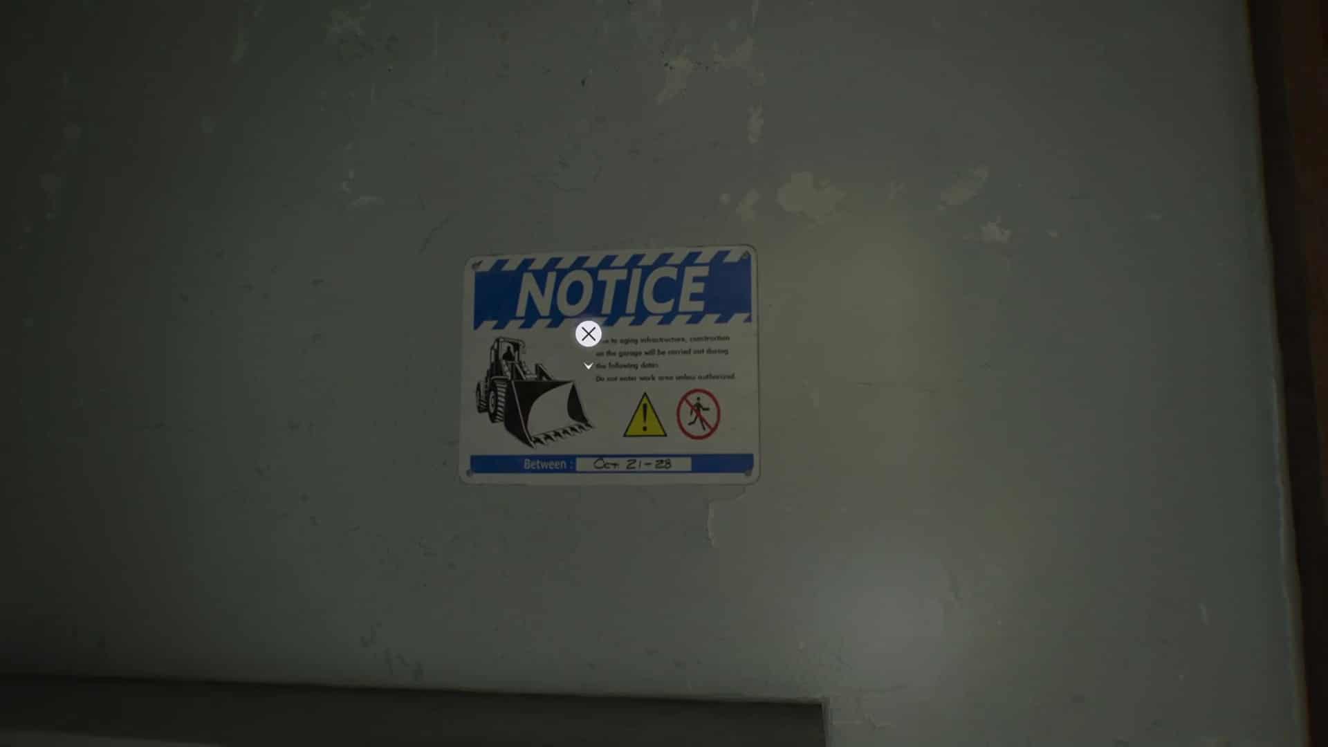 - Emplacement : Dans le Parking Souterrain de la Résidence Cedarbrook, le document vous attend sur la porte du boîtier à batterie, à côté d’un grand portail fermé sur lequel tape un zombie.