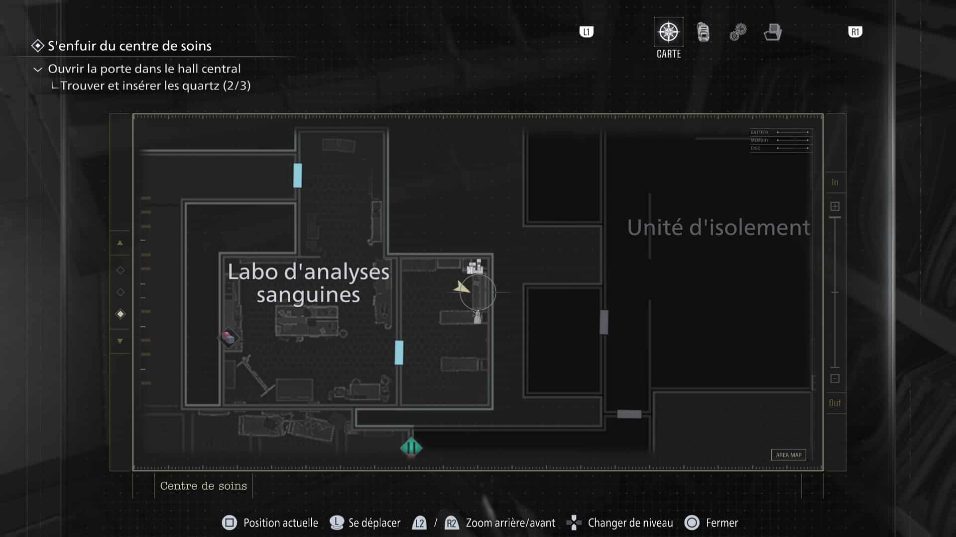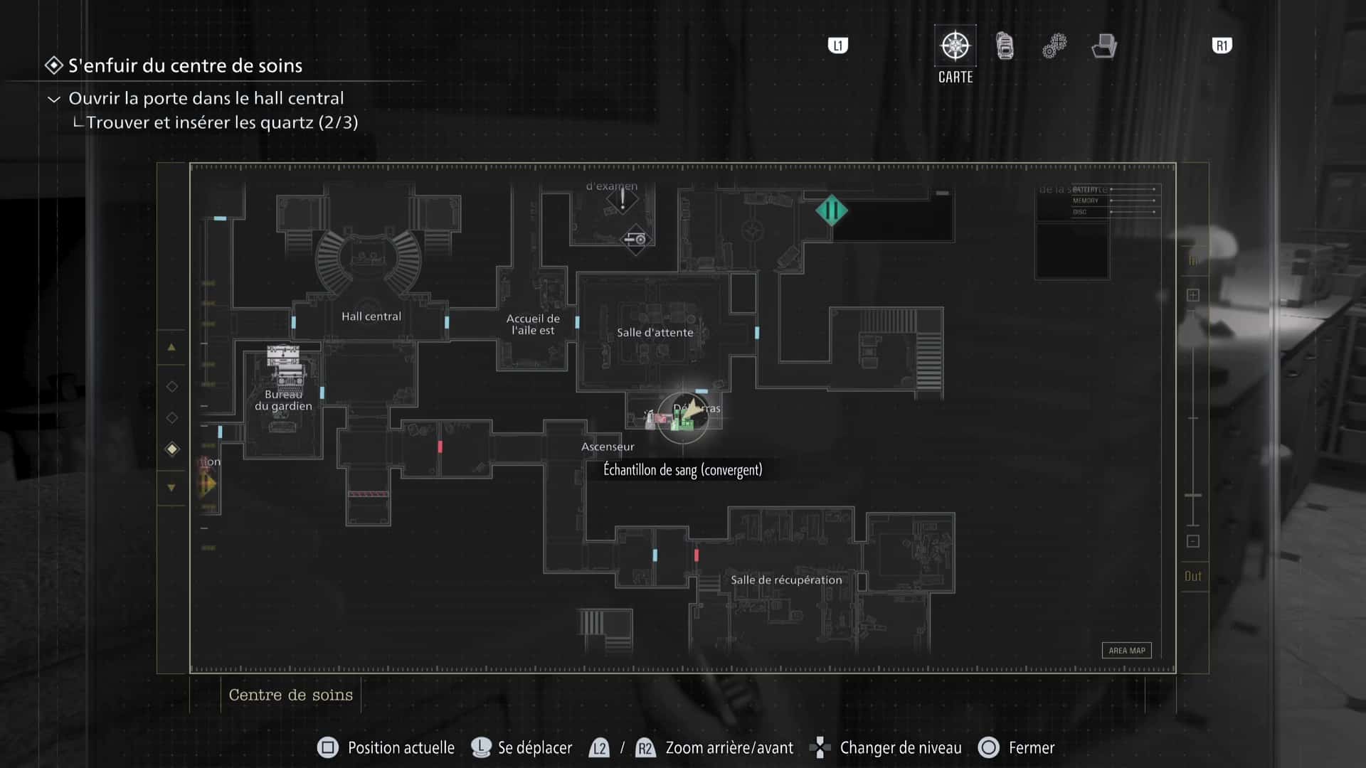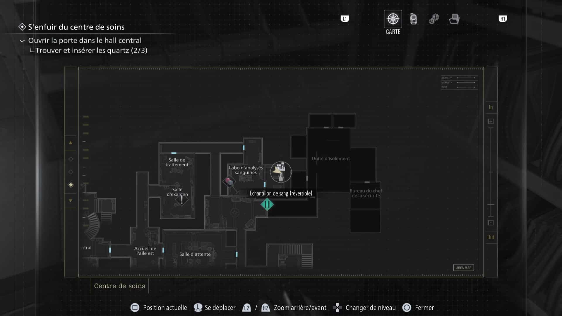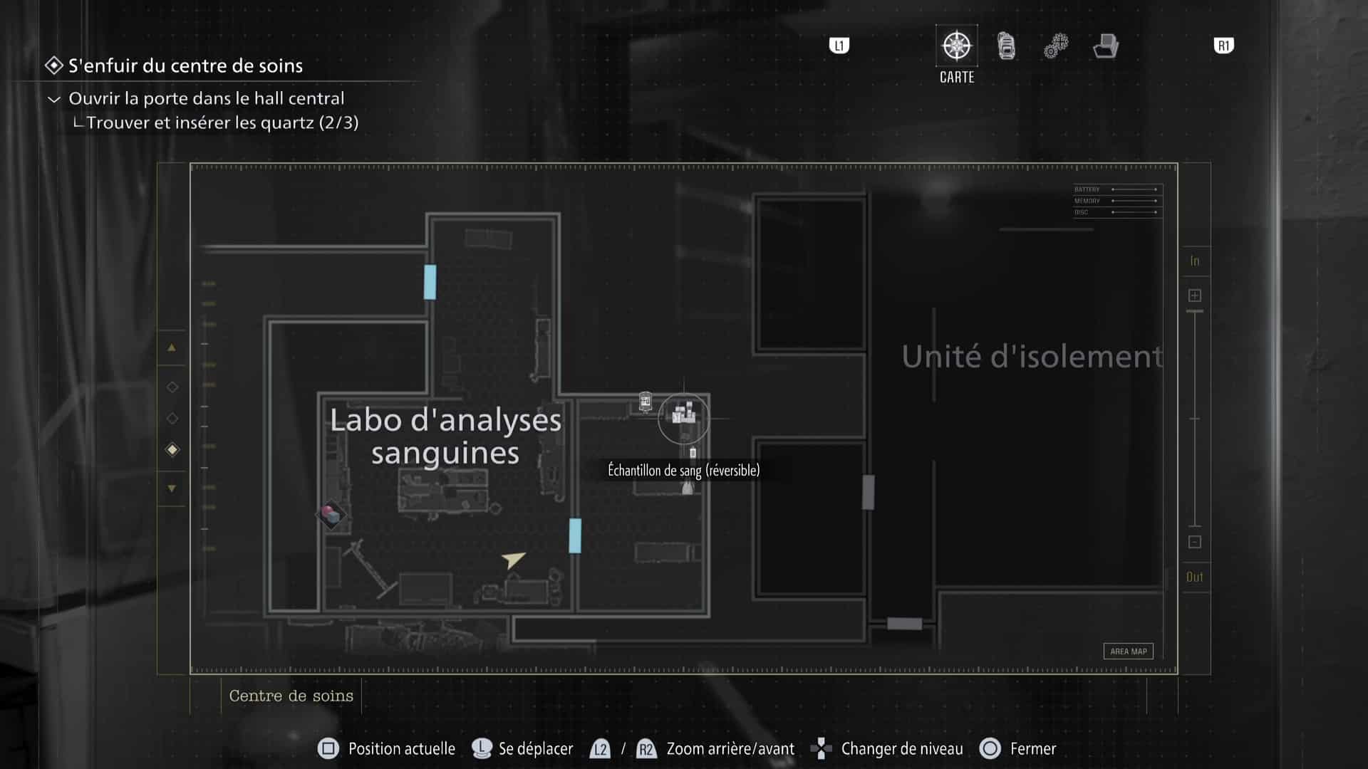 - Emplacement : Nécessite de posséder le bracelet d’identification (Nv.1). Allez dans le Laboratoire d’analyses sanguines et déverrouillez le point de sécurité Nv.1, menant à une sorte de réserve. Vous trouverez l’échantillon dedans, tout près du bureau, sur un petit chariot.