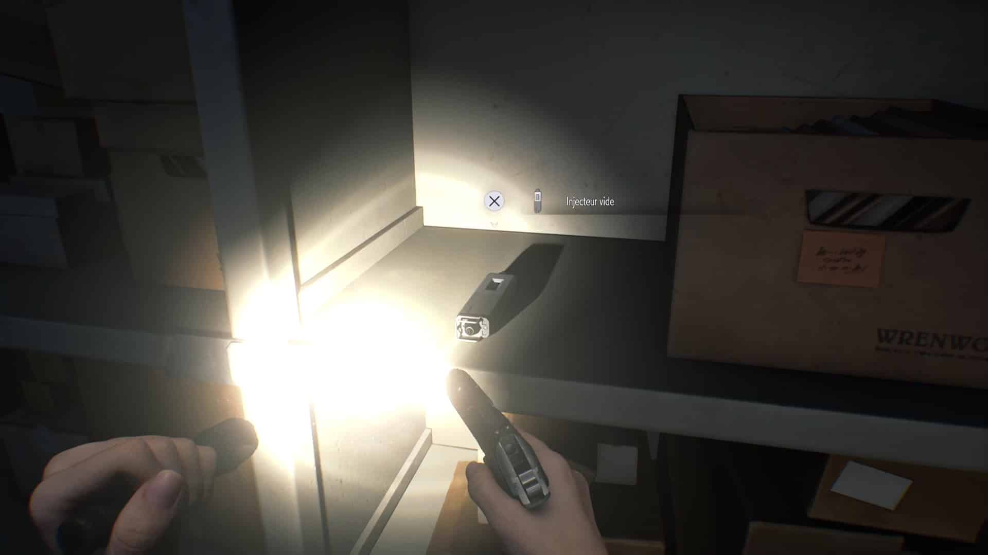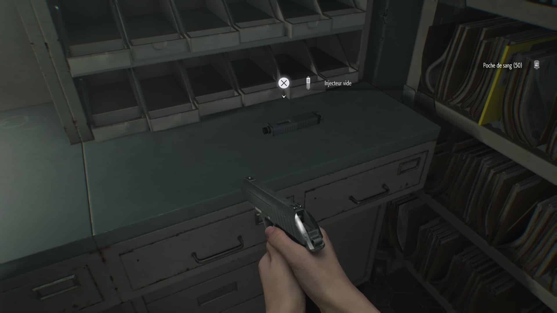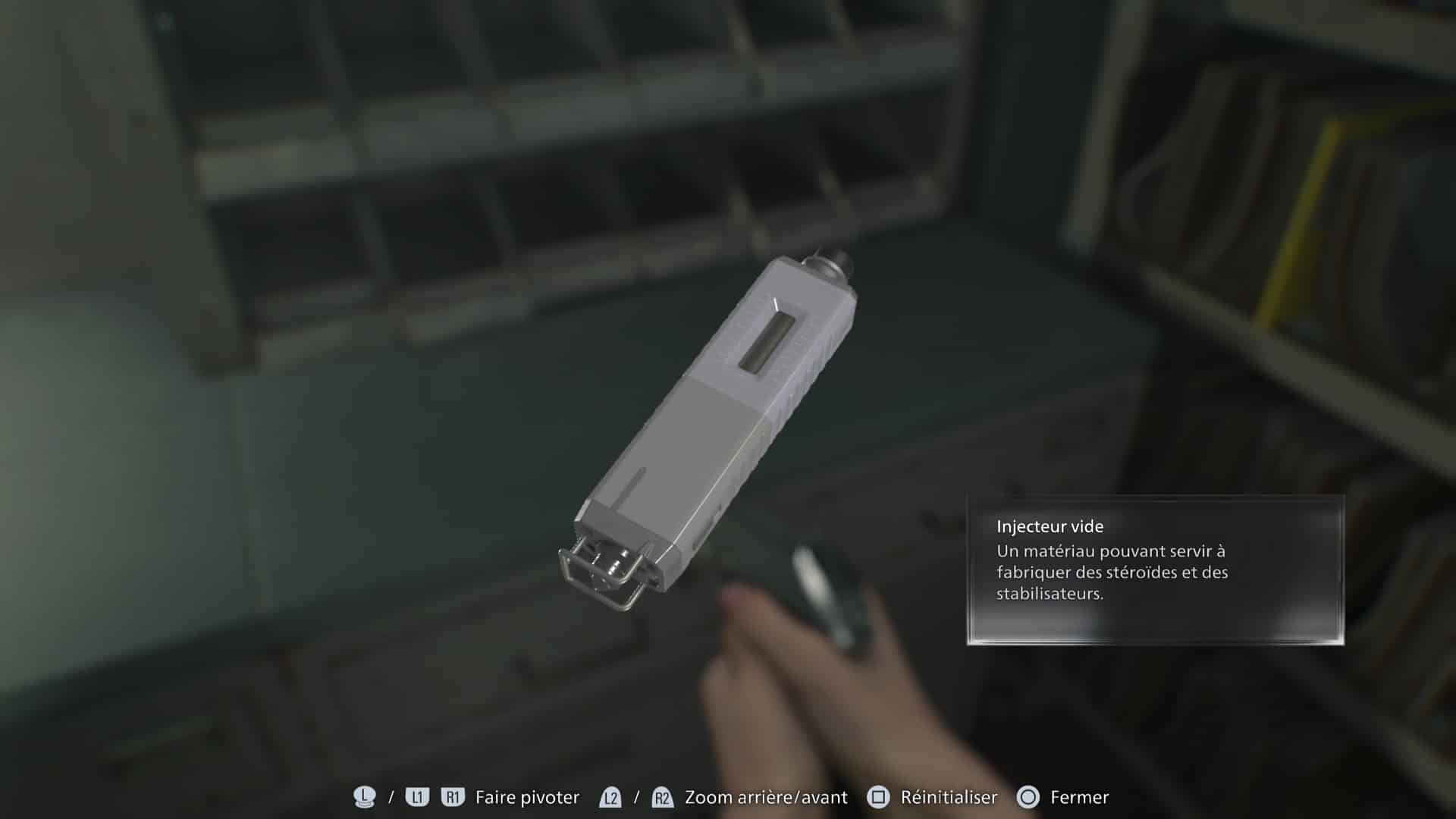 - Emplacement : Nécessite de posséder le bracelet d’identification (Nv.1). L’injecteur vide se trouve tout simplement à côté de l’Échantillon de sang (réversible), dans la réserve du Laboratoire d’analyses sanguines, sur un bureau.