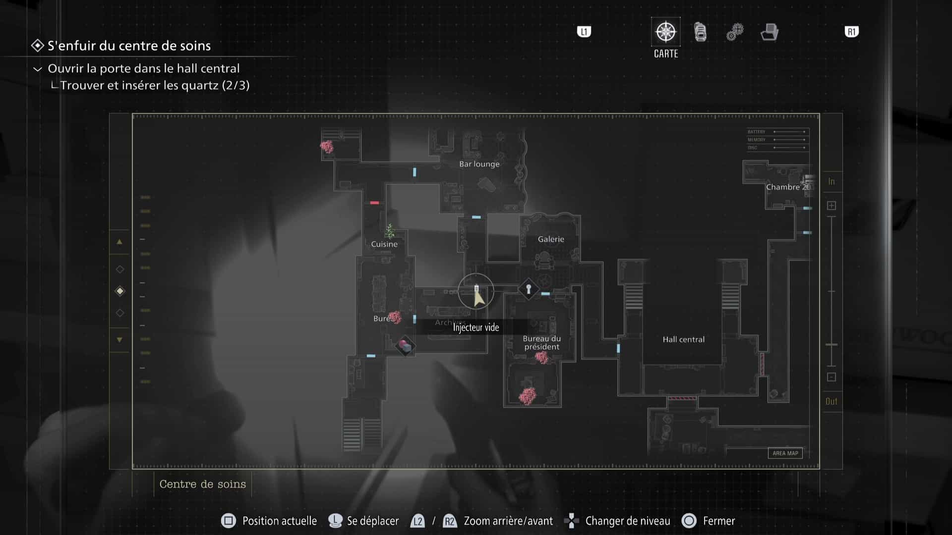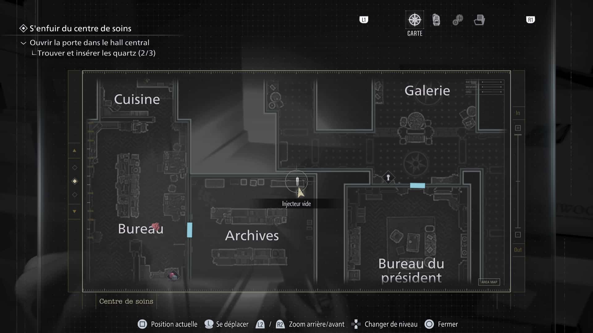 - Emplacement : Au 1ᵉʳ étage de l’aile ouest, allez dans les Archives, en passant par la salle Bureau. Au fond à gauche des Archives, un injecteur vide repose sur une table.