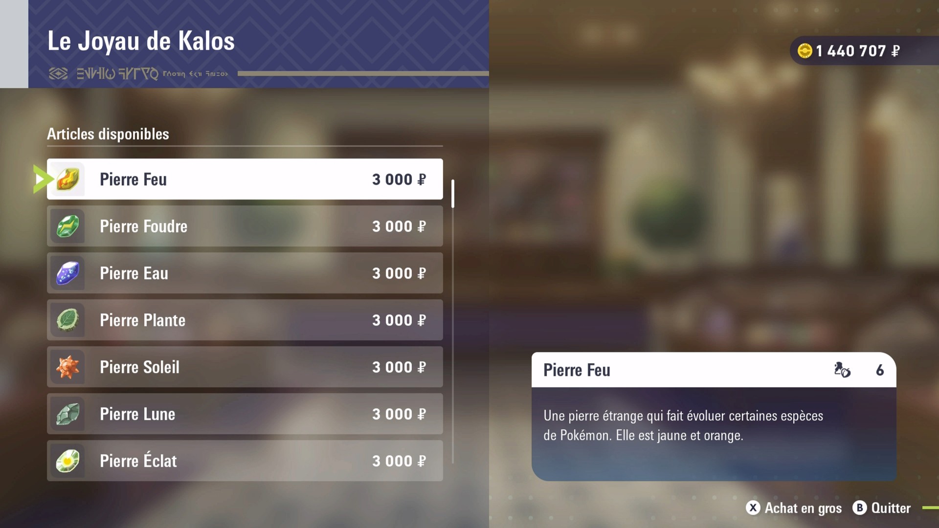 Les Pierres d’Évolution sont plutôt faciles à obtenir à Illumis. Vous pouvez en trouver en explorant les Zones Sauvages, mais le moyen le plus simple reste le Magasin des Pierres situé dans la partie sud au centre d’Illumis. Ce commerce propose toutes les Pierres d’évolution à la vente à des prix abordables : Pierre Feu, Eau, Foudre, Plante et Glace.