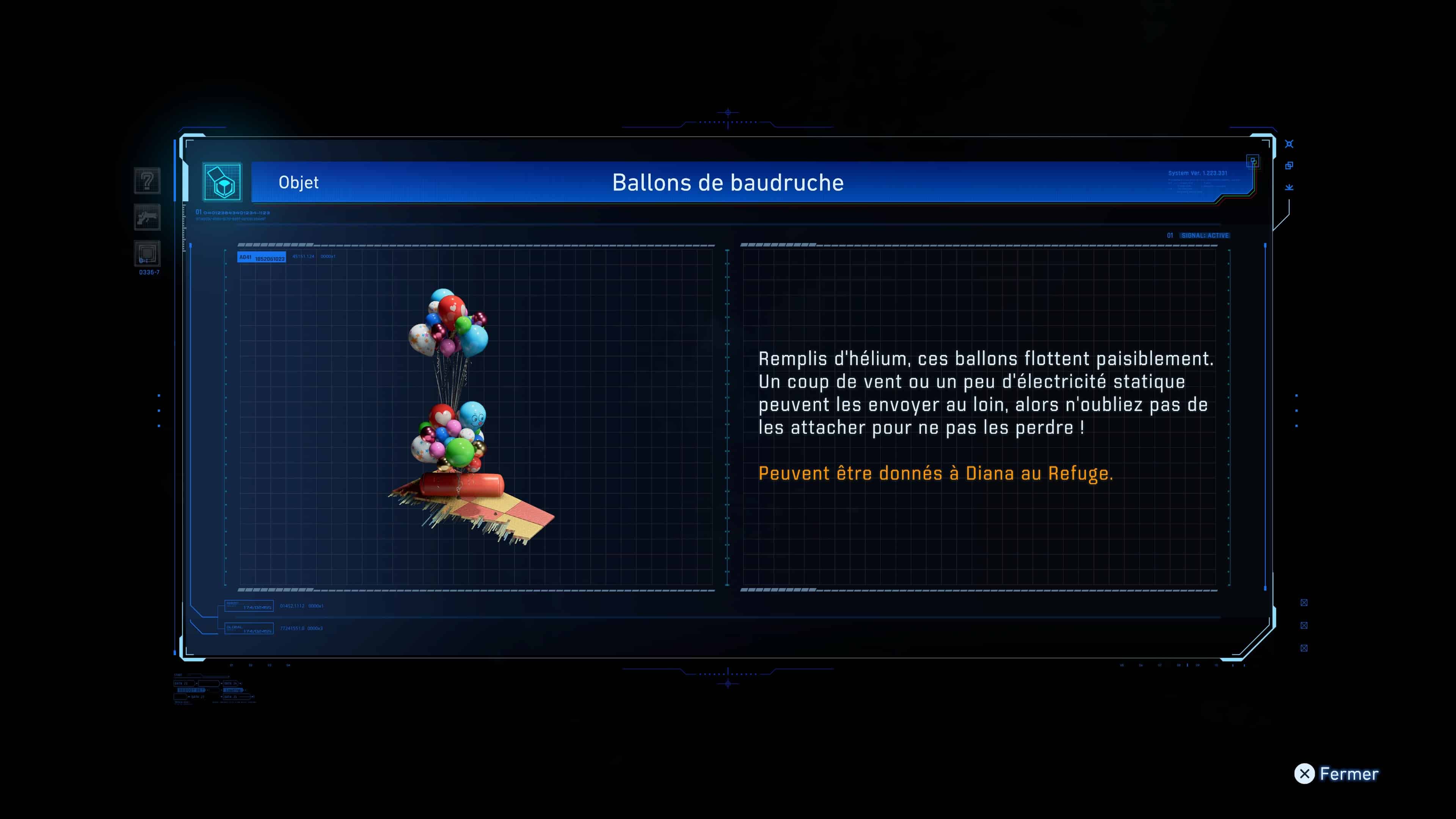 En suivant la campagne principale, vous finirez par arriver dans une grande salle forestière où vous devrez récupérer quatre programmes, afin de générer des plateformes en lunafibre nécessaires à votre progression. Pour être plus précis, celle-ci est située dans le Bloc n°2 du secteur (« Centre environnemental ») et accueille aussi une Zone rouge, ainsi que la Trappe de secours/l’Arrêt « Labo environnemental ». Prenez le temps de la fouiller minutieusement et vous devriez y obtenir la Mémoire Terrestre « Ballons de baudruche » planquée dans un recoin de la pièce, à proximité d’un mur et d’un gros rocher.