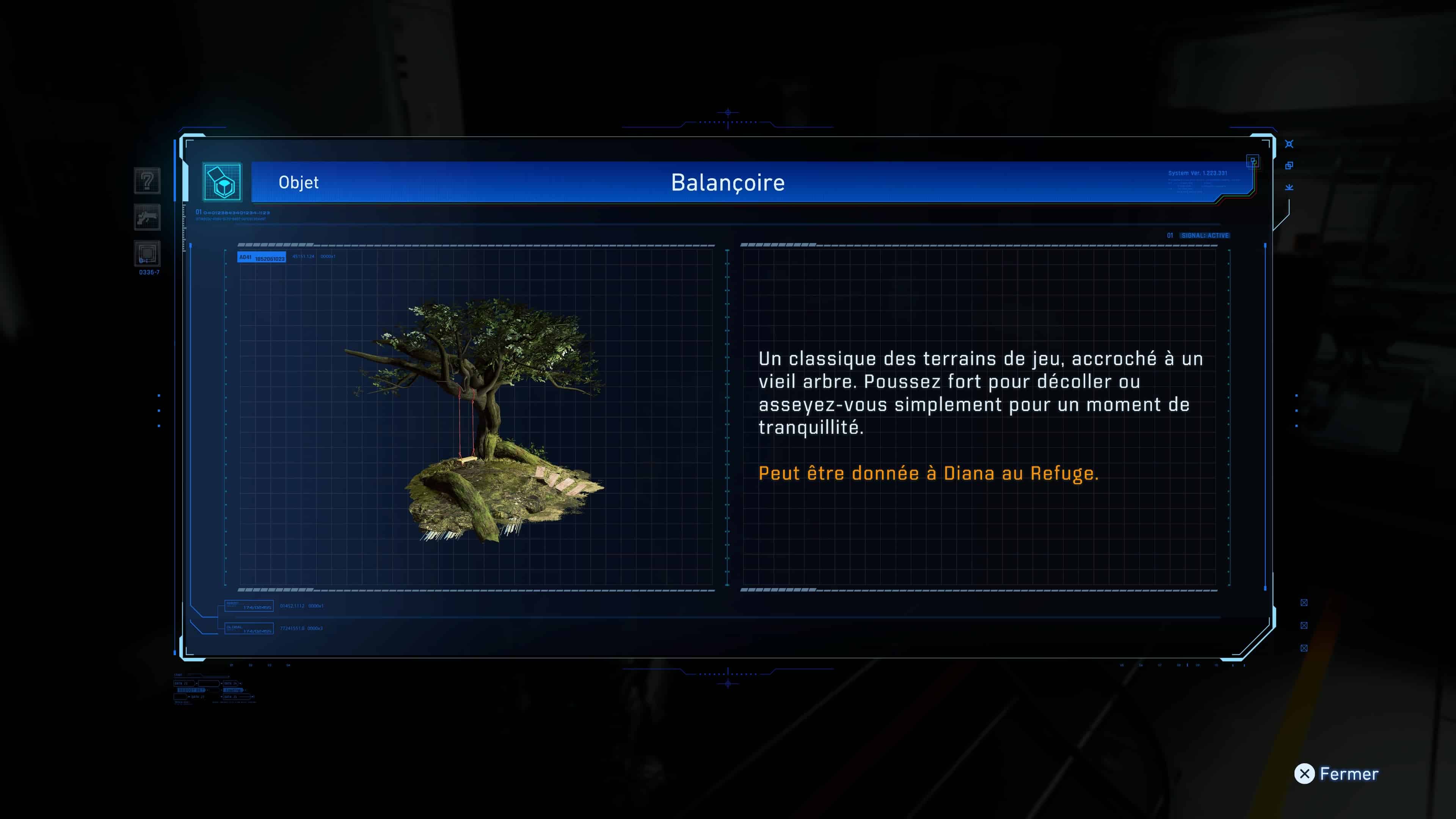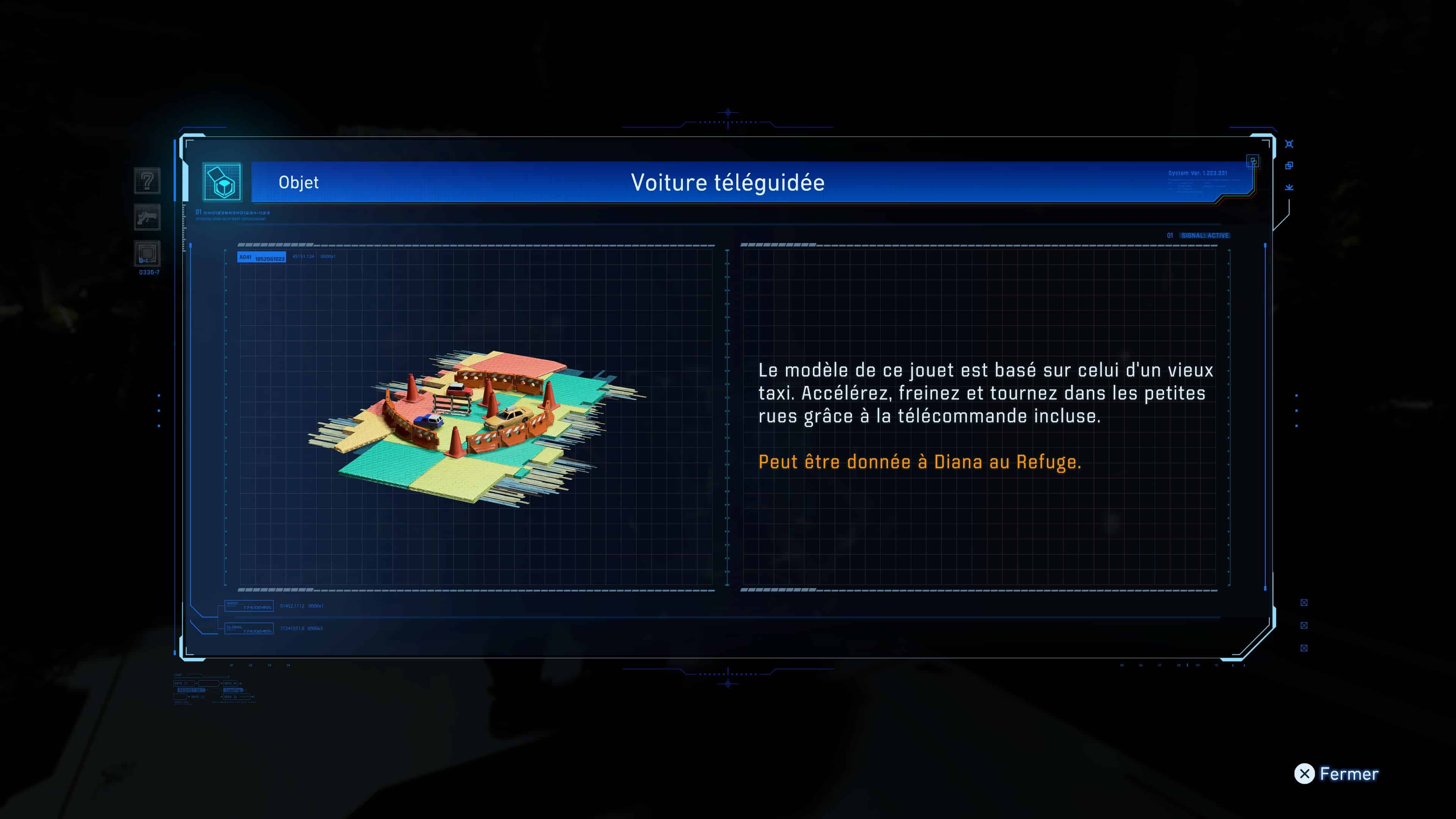 Toujours en explorant la fameuse grande salle forestière du Bloc n°2 « Centre environnemental », vous devriez parvenir à localiser une autre Mémoire Terrestre intitulée « Voiture téléguidée ». Malheureusement, celle-ci est enfermée dans une pièce verrouillée que vous ne pouvez pas pirater depuis l’extérieur. Rebroussez donc chemin et progressez tranquillement dans la campagne principale jusqu’à arriver dans une nouvelle petite zone appartenant à la grande salle forestière, après avoir débloqué l’accès à la Trappe de secours/l’Arrêt « Labo de simulation météo ». En fouillant les lieux, vous finirez par apercevoir une barrière en lunafibre que vous pouvez faire disparaitre à l’aide de la capacité « Effaceur de fibre » de Diana. Faites-le, avancez tout en trouvant le moyen de franchir le couloir protégé par des lasers auquel vous serez confrontés à un moment donné, et vous pourrez obtenir la MT que vous êtes venus chercher ici.
