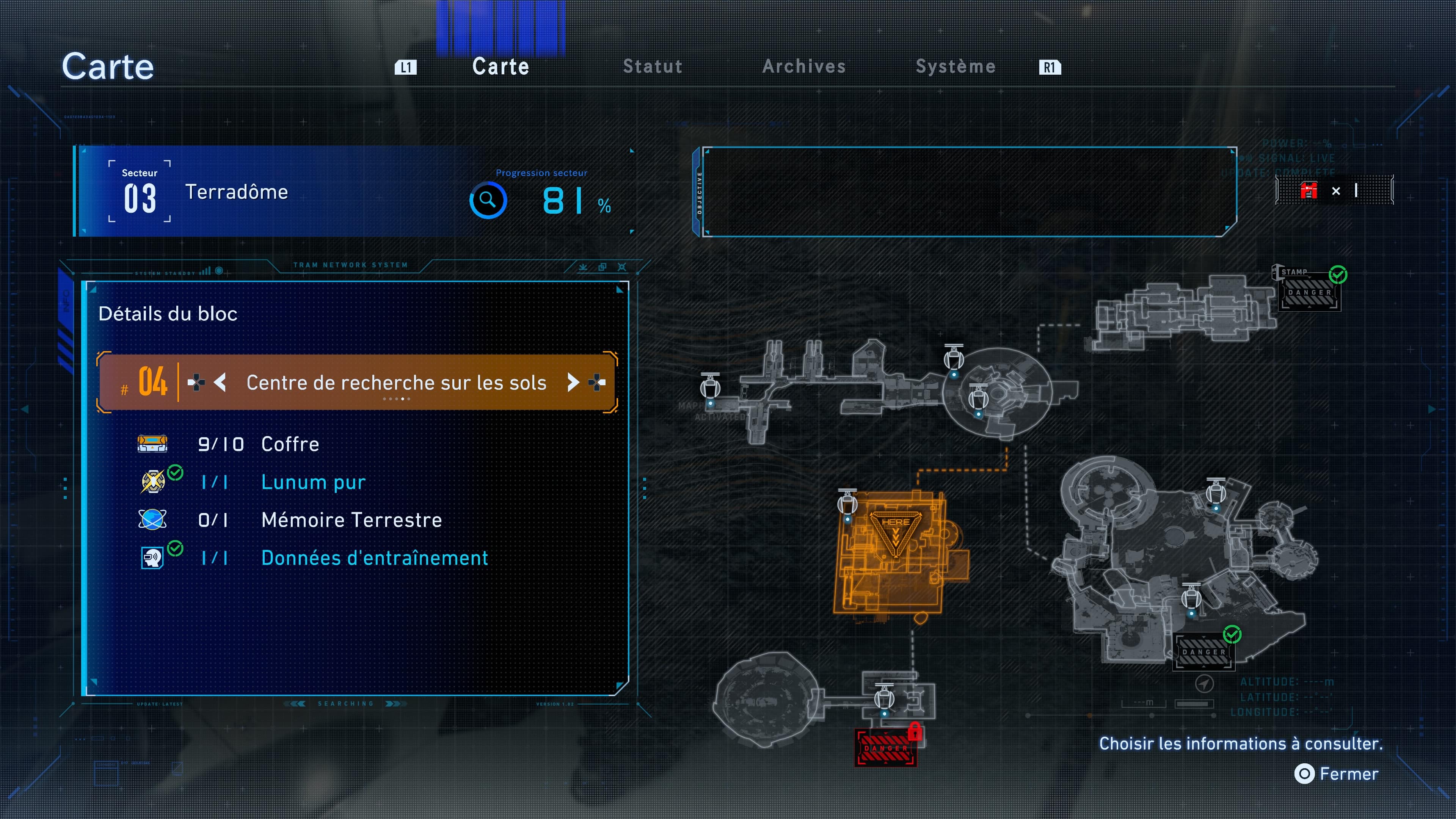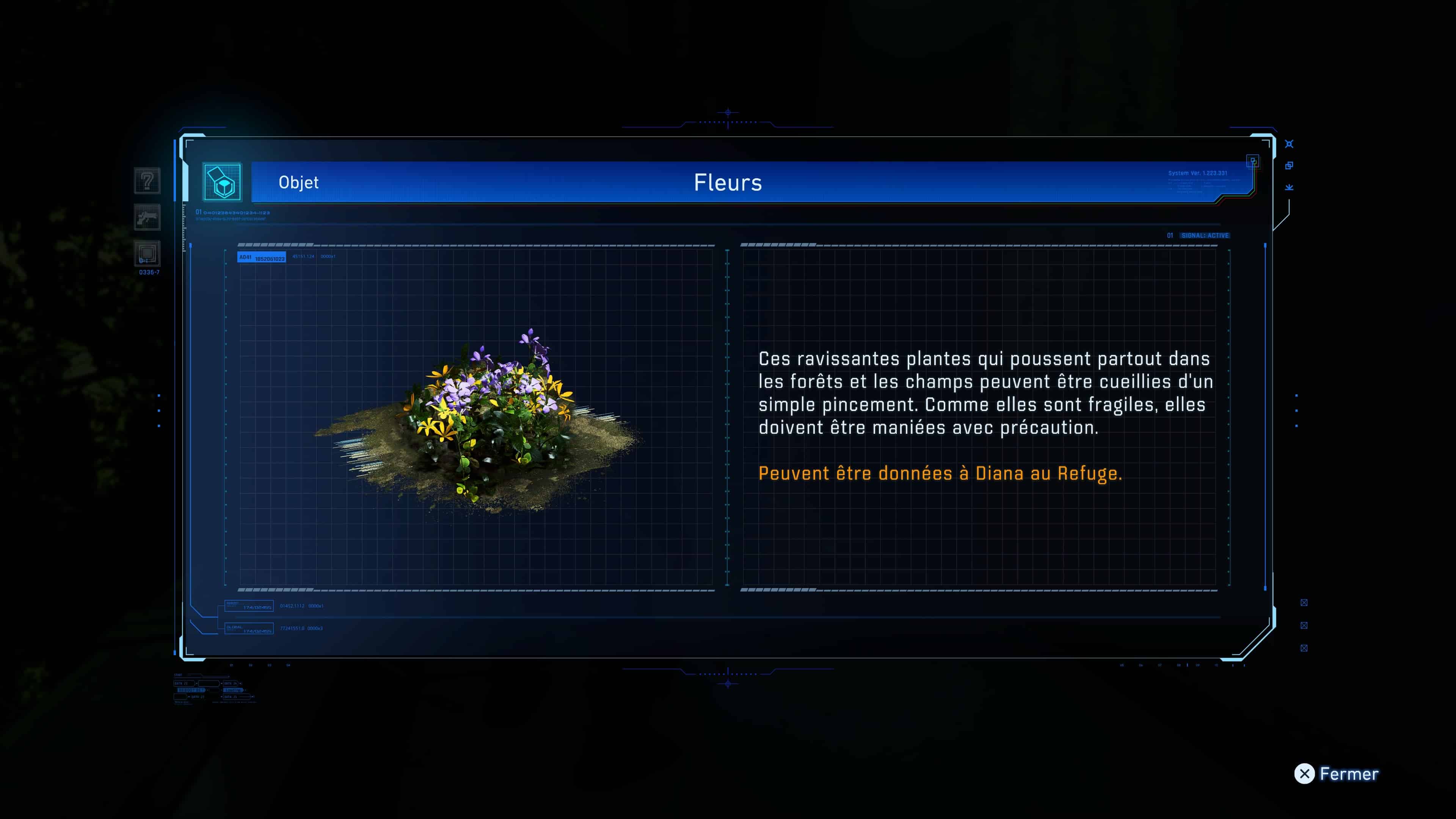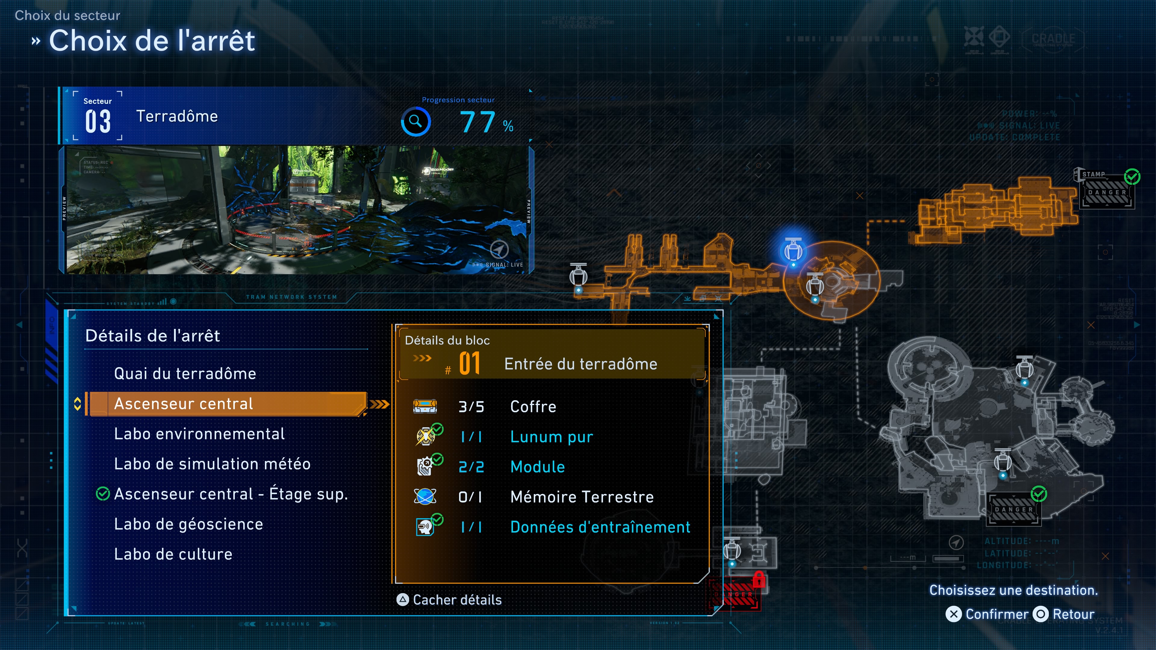 Dans le Bloc n°1 du secteur (« Entrée du Terradôme »), quand vous aurez réussi à dégager les lieux afin de pouvoir utiliser l’ascenseur central dans le cadre de la campagne principale, attendez un peu avant d’activer ce dernier car la Mémoire Terrestre « Fleurs » se trouve dans la zone, sur une plateforme en hauteur. Pour l’atteindre, identifiez des branches en lunafibre sur lesquelles grimper, puis sauter et aidez-vous des propulseurs de la combinaison de Hugh. Attention, vous aurez peut-être besoin de les améliorer davantage en amont, par le biais de l’Imprimante d’unités présente au Refuge !