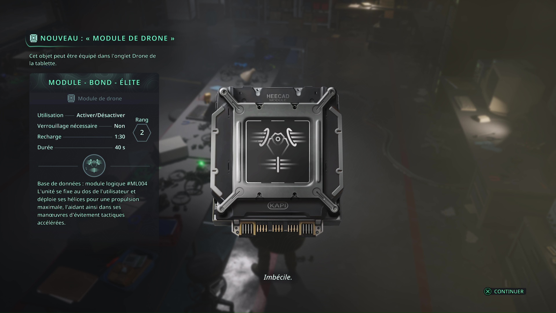 Présentez-vous ensuite à la porte du labo. Comme vous l’a dit Marga, le code est 230317. À l’intérieur du labo, il y a aussi un module de drone pour vous. Et il s’agit du module Bond – Elite.