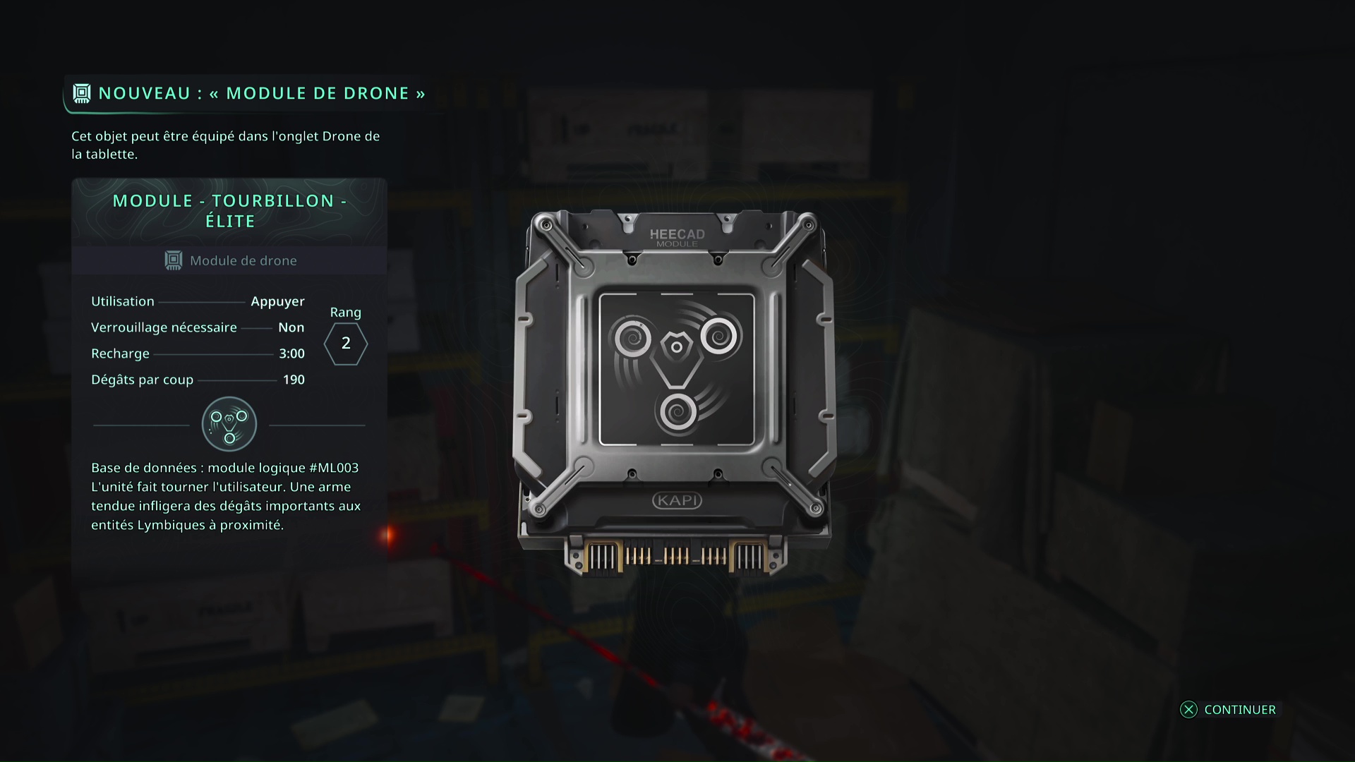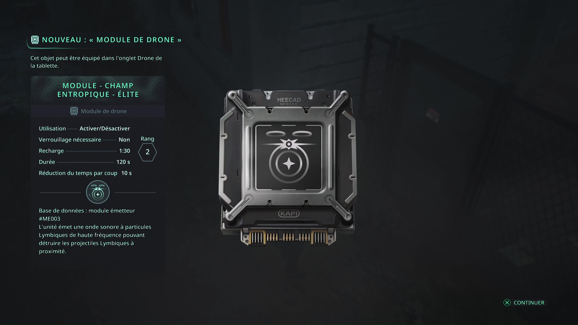 Dès votre arrivée à Lethé – Bibliothèque nationale et lorsque vous faites face à l’entrée, allez sur la droite pour apercevoir un point brillant sur un cadavre. Ramassez-le pour récupérer, entre autres, le module de drone Champ entropique – Élite.