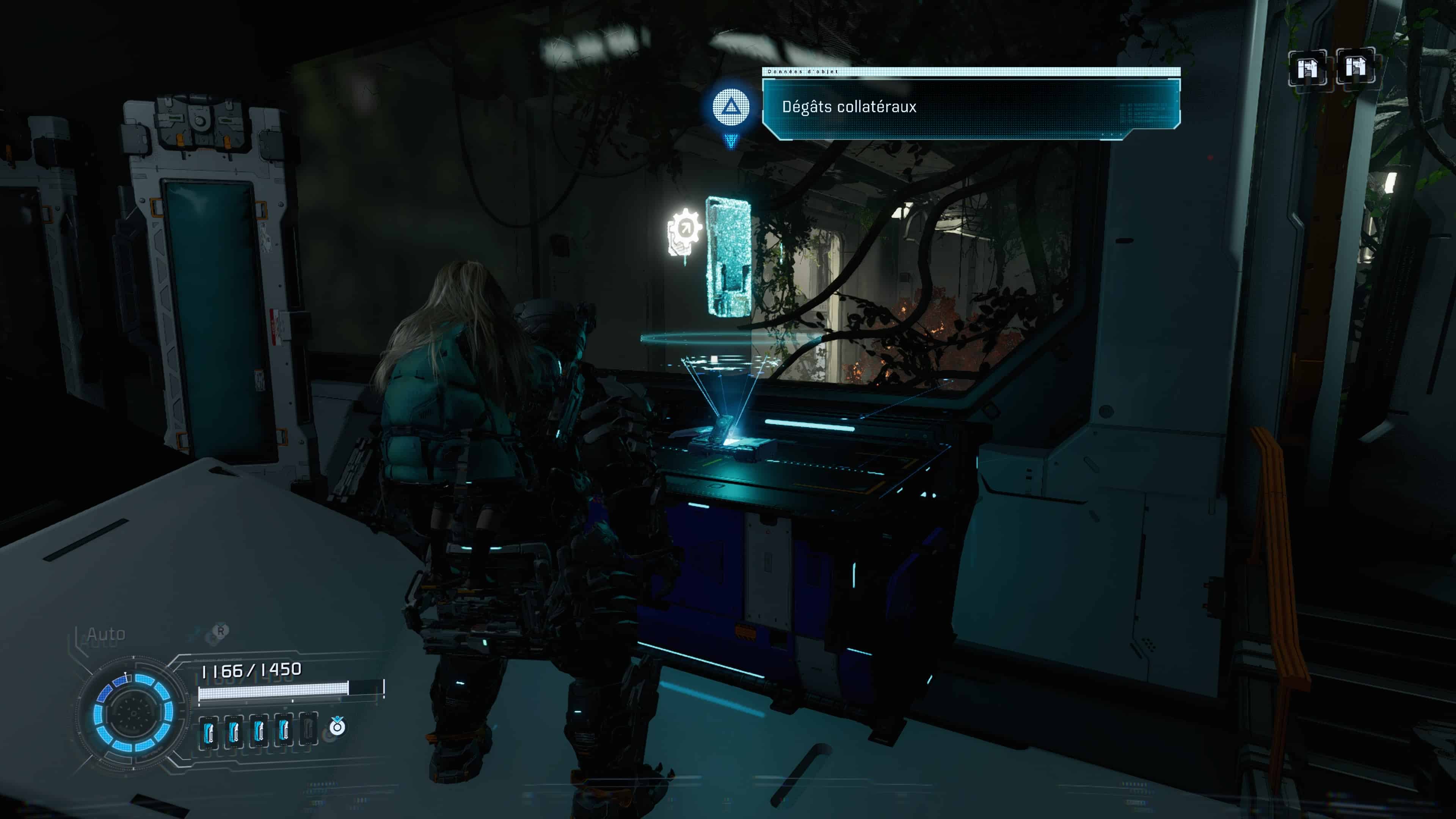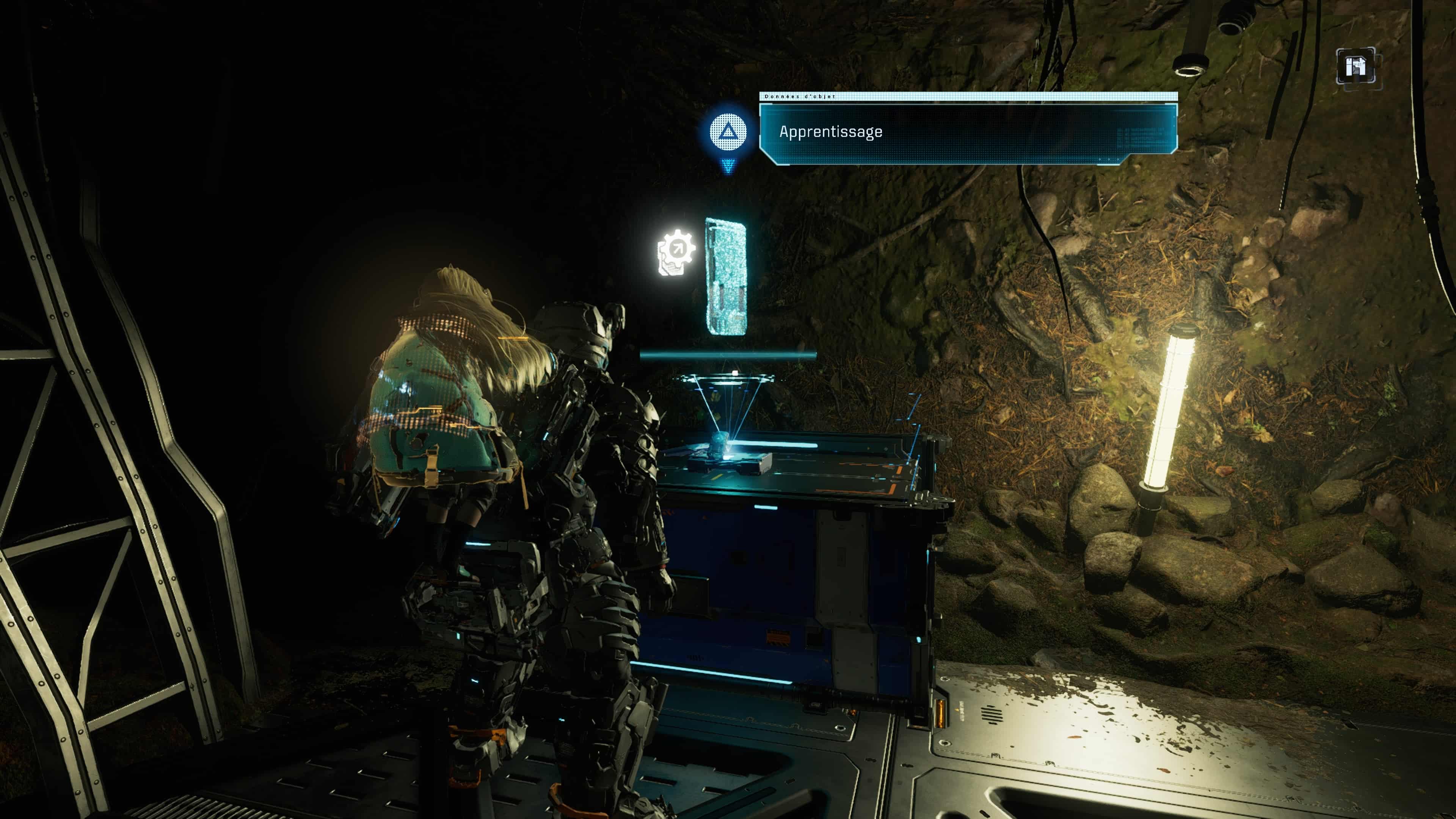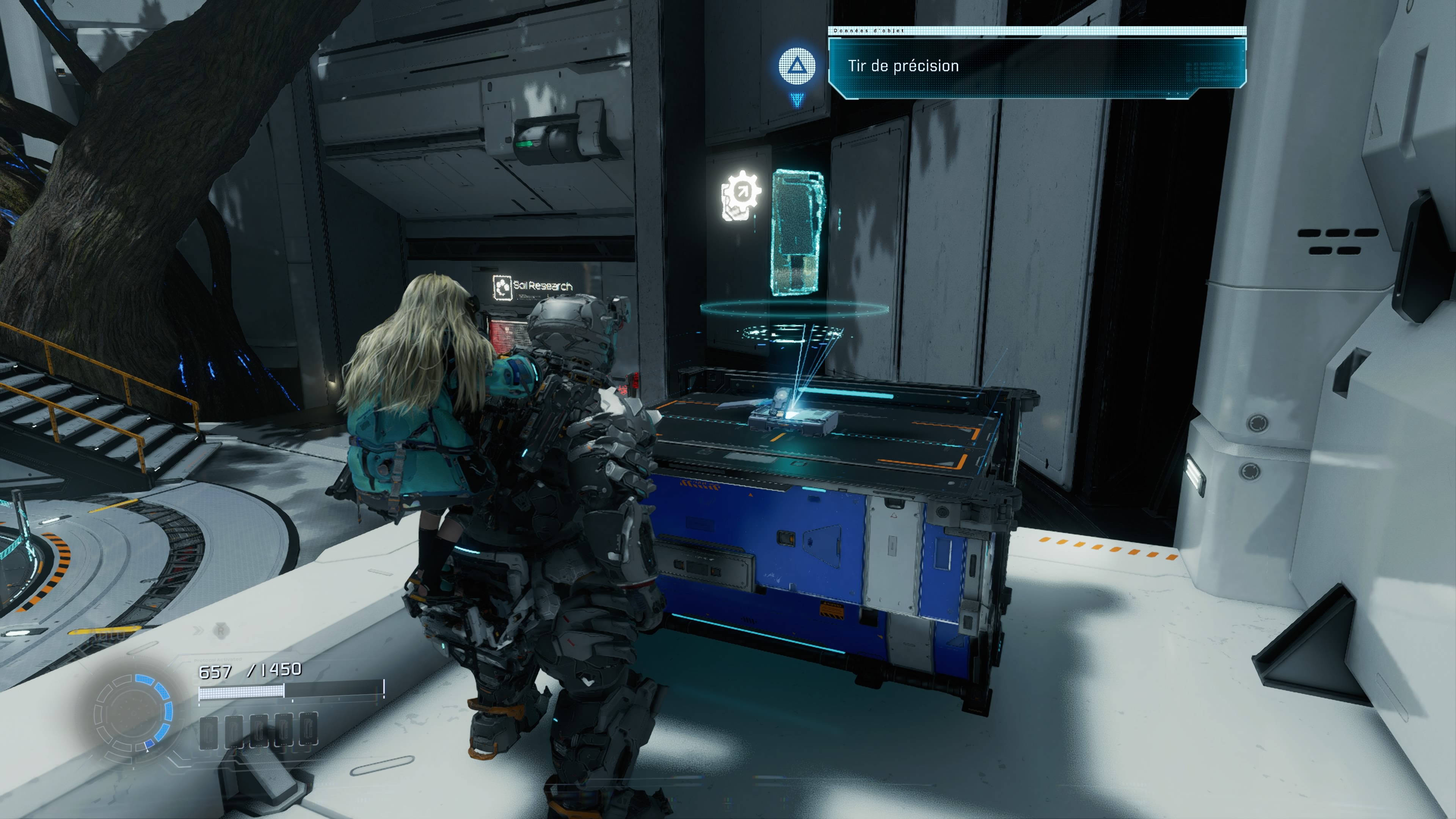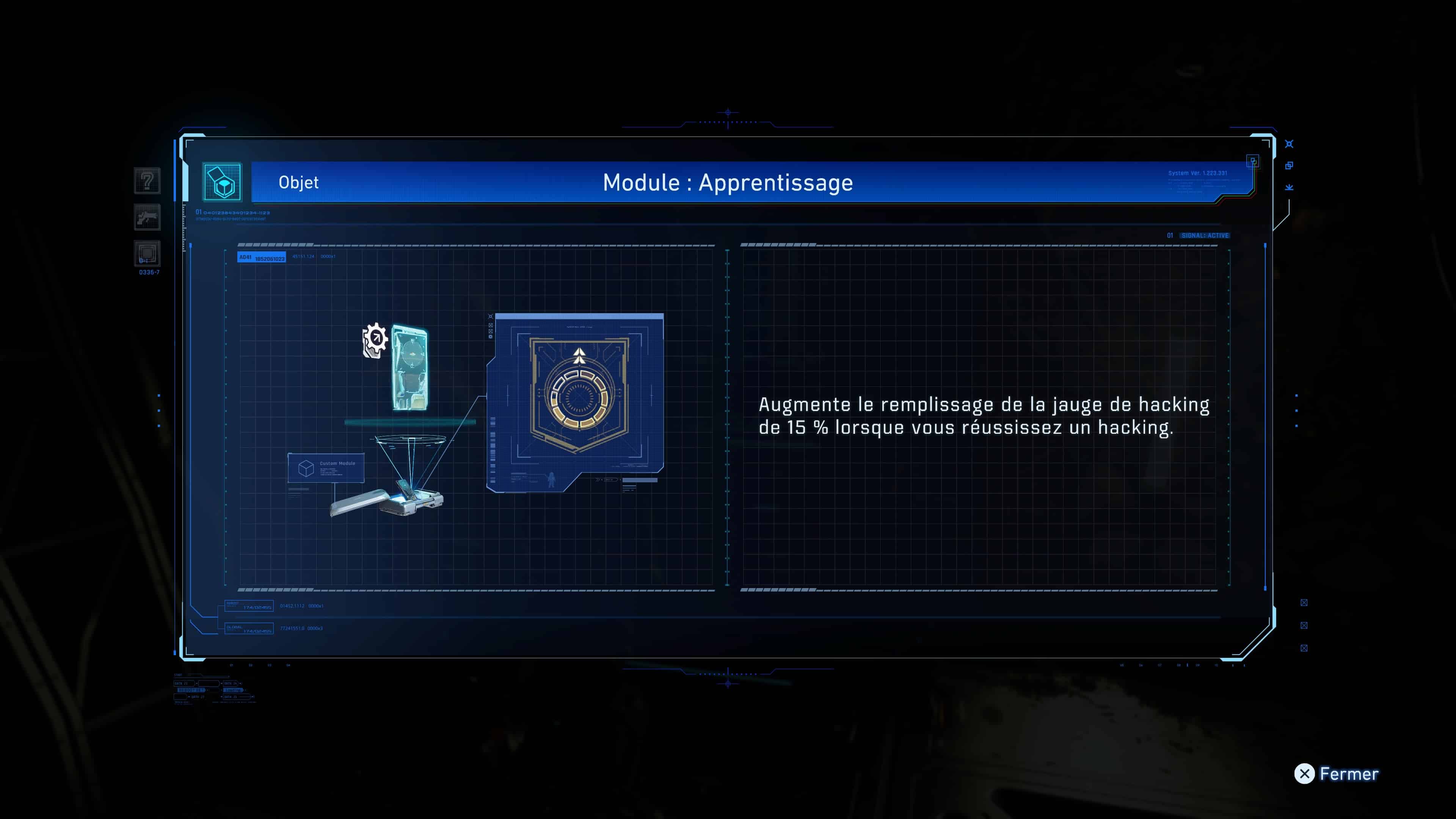 Toujours dans la grande salle forestière du Centre environnemental, descendez les escaliers situés près de la Zone rouge explorée précédemment et de la Trappe de secours/l’Arrêt « Labo environnemental », puis cherchez deux petites plateformes près de la base d’un gros arbre en lunafibre. Grimpez dessus et avancez jusqu’à vous retrouver bloqués par un Mur holographique. Faites-le disparaitre, éliminez le robot qui vous attend juste derrière, et fouillez la pièce cachée à laquelle vous avez désormais accès pour acquérir un Module dans un coffre. Intitulé « Apprentissage », il augmente le remplissage de la jauge de hacking de Diana de 15% lorsque vous réussissez un hacking.