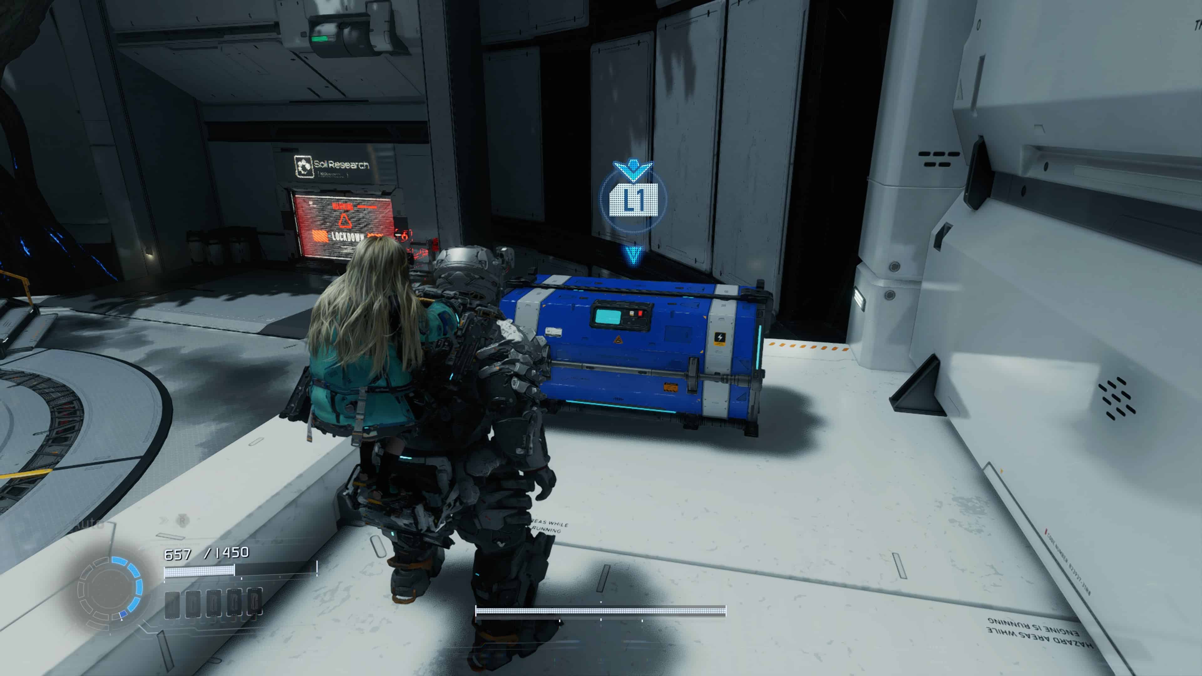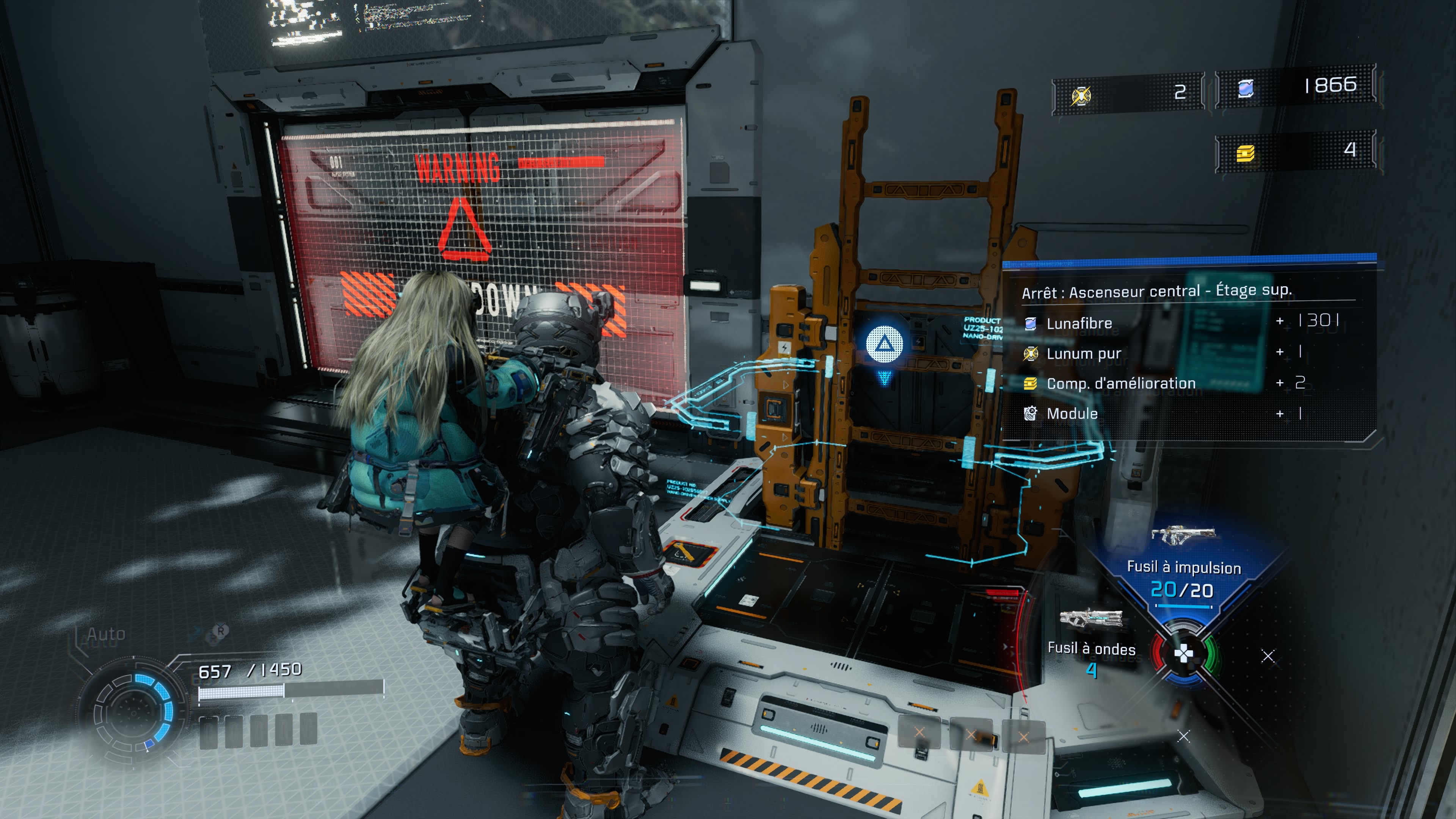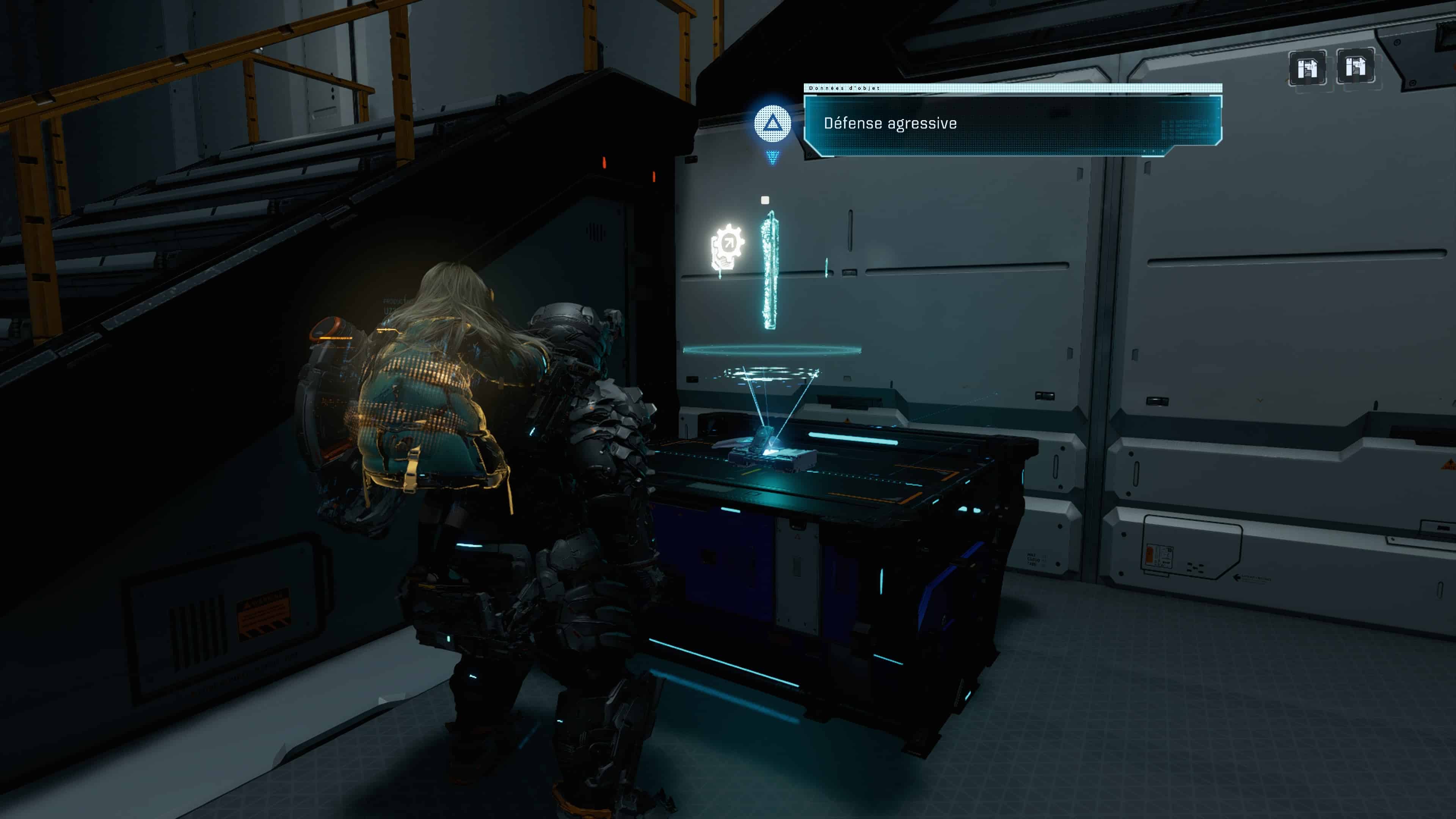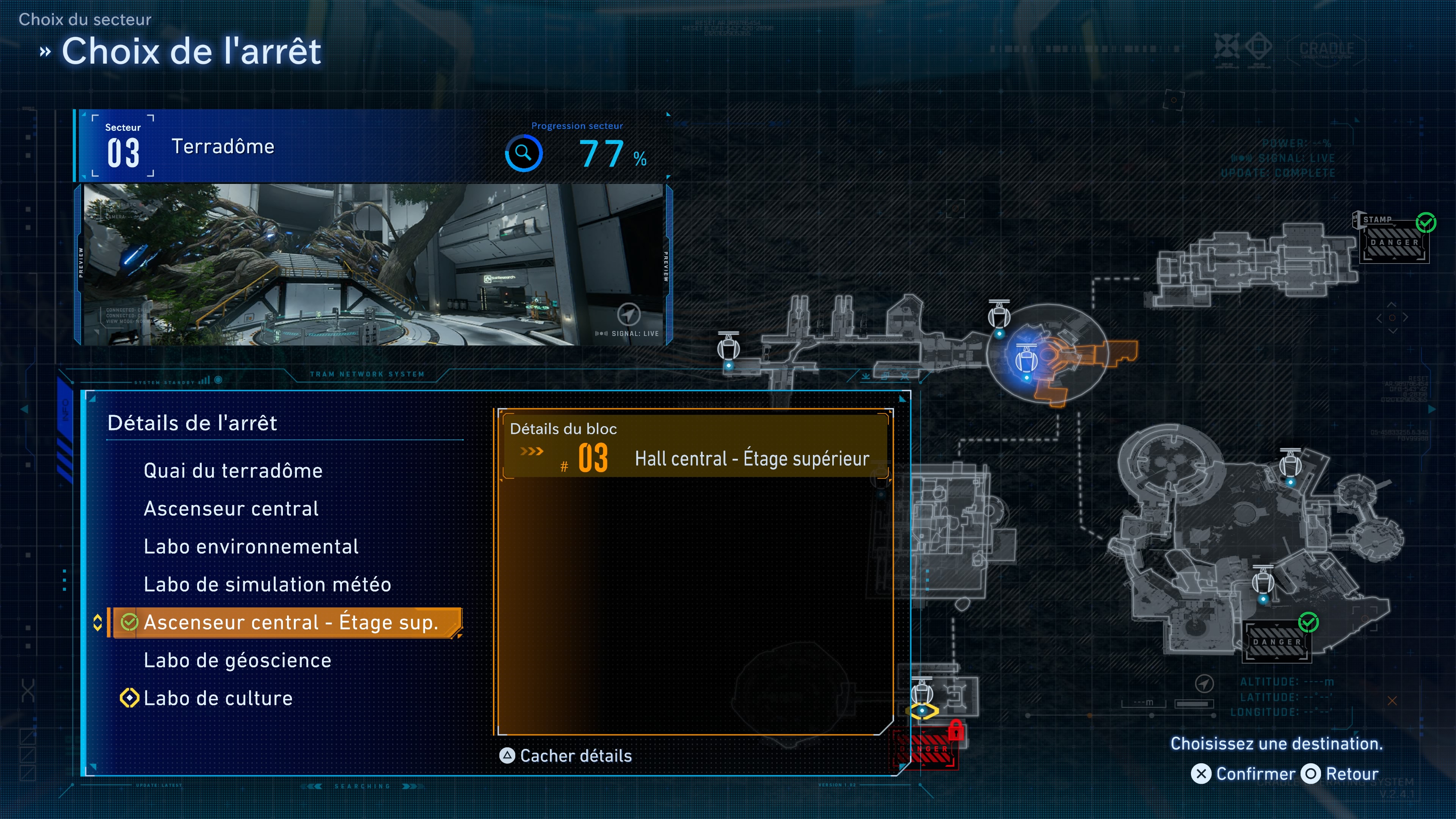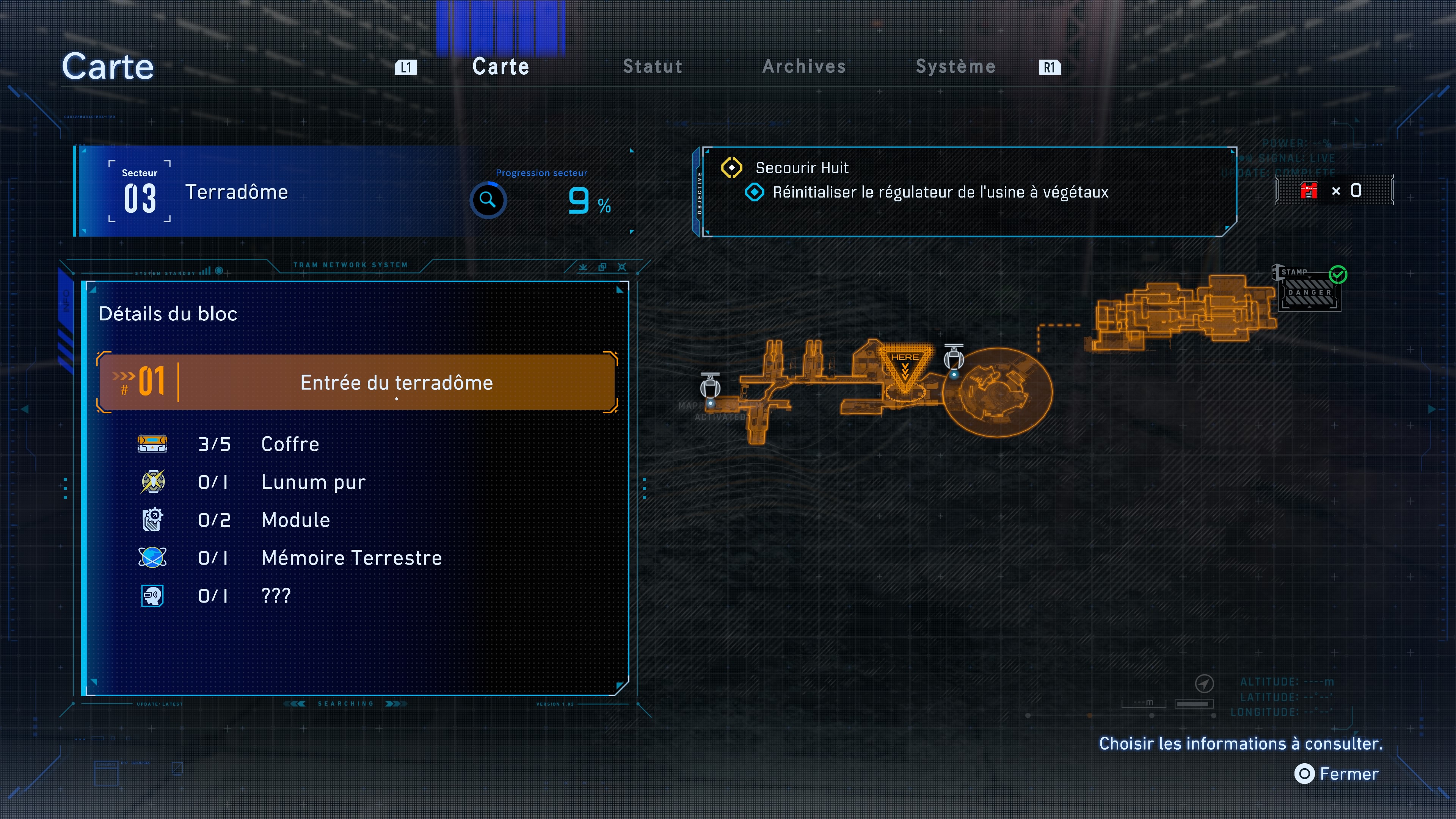 Toujours dans la grande salle forestière du Centre environnemental, descendez les escaliers situés près de la Zone rouge explorée précédemment et de la Trappe de secours/l’Arrêt « Labo environnemental », puis cherchez deux petites plateformes près de la base d’un gros arbre en lunafibre. Grimpez dessus et avancez jusqu’à vous retrouver bloqués par un Mur holographique. Faites-le disparaitre, éliminez le robot qui vous attend juste derrière, et fouillez la pièce cachée à laquelle vous avez désormais accès pour acquérir un Module dans un coffre. Intitulé « Apprentissage », il augmente le remplissage de la jauge de hacking de Diana de 15% lorsque vous réussissez un hacking.