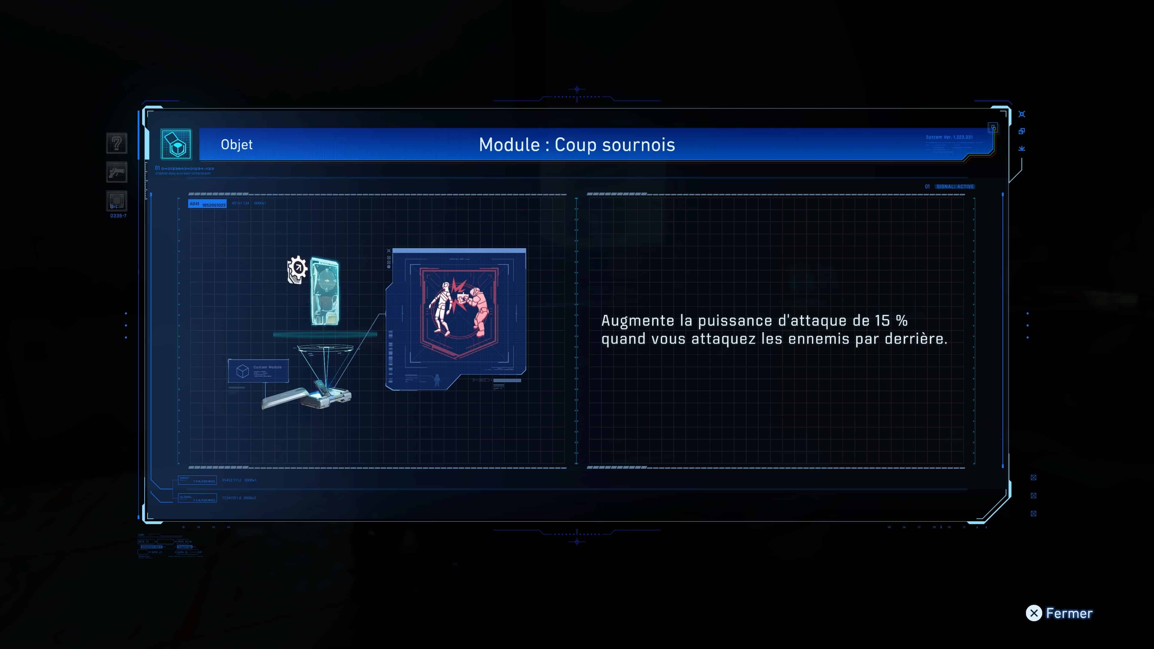 En suivant la campagne principale, vous finirez par arriver dans une zone accueillant notamment des hologrammes d’animaux à observer, dans le Bloc n°1 du secteur nommé « Entrée du Terradôme » (accessible aussi par l’intermédiaire de la Trappe de secours/l’Arrêt « Ascenseur central »). Une petite pièce se trouve en face. Allez dedans pour récupérer des Données d’entrainement et, surtout, un Module dans un coffre. Intitulé « Coup sournois », l’équiper augmentera votre puissance d’attaque de 15% quand vous lancerez une offensive par derrière sur un ennemi.
