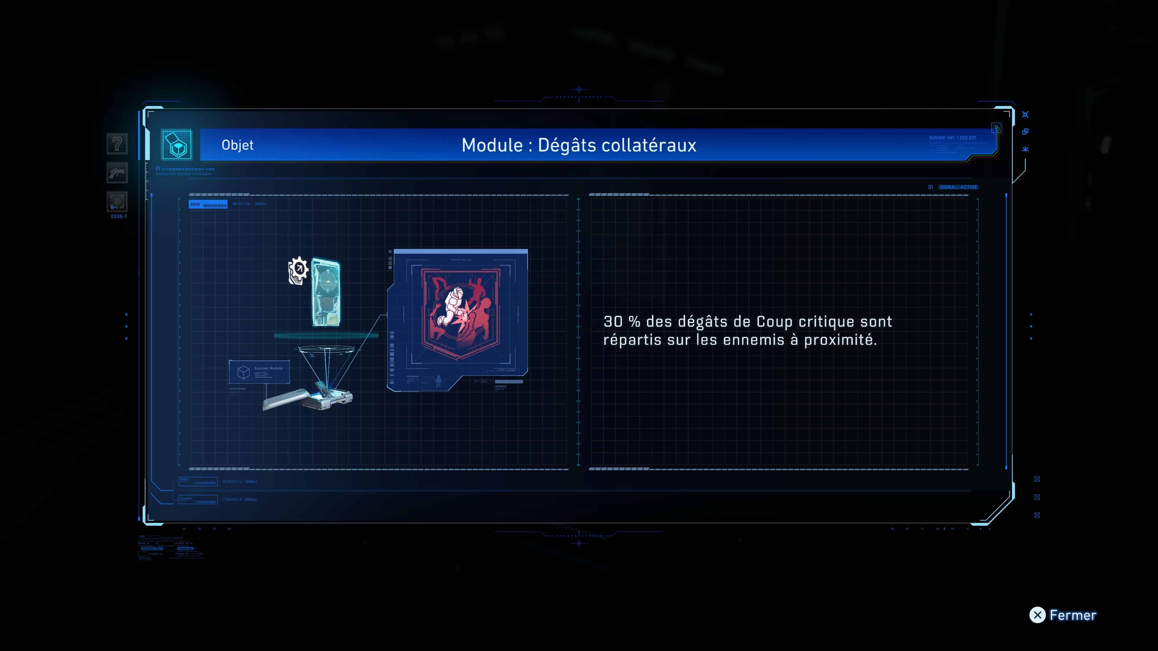 Dans le Bloc n°2 « Centre environnemental », une Zone rouge se trouve à proximité de la Trappe de secours/l’Arrêt « Labo environnemental », dans une grande salle forestière où vous devez acquérir plusieurs programmes afin de générer des plateformes en lunafibre nécessaires à votre progression dans la campagne principale. Utilisez une Clé de zone rouge pour en débloquer l’accès, éliminez tous les ennemis que vous croiserez à l’intérieur, et vous pourrez obtenir un nouveau Module dans un coffre placé à côté d’un autre contenant un fragment de Lunum pur. Nommé « Dégâts collatéraux », l’équiper vous octroiera le bonus passif suivant : 30% des dégâts de Coup critique seront répartis sur les ennemis à proximité.
