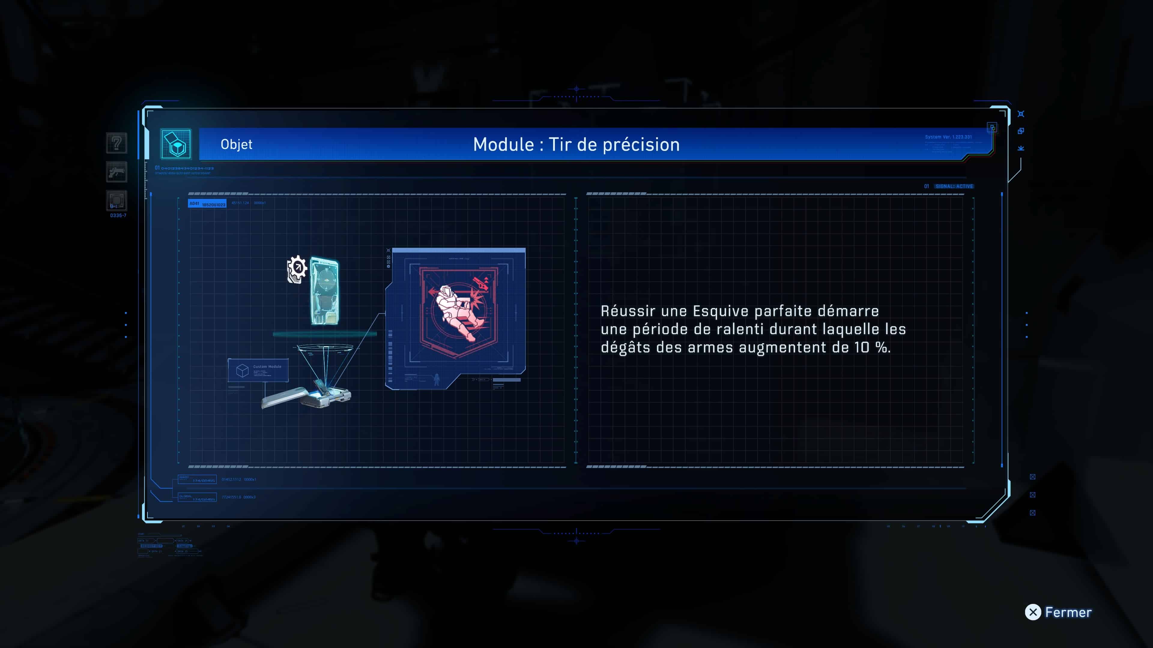 Quand vous aurez suffisamment avancé dans la campagne principale, vous pourrez utiliser l’ascenseur central qui se situe dans le Bloc n°1 « Entrée du Terradôme ». Faites-le et il vous emmènera au Bloc n°3 « Hall central – Etage supérieur ». Le Module que vous cherchez à récupérer ici se trouve dans un coffre placé dans la même zone que celle où il est possible de déverrouiller la Trappe de secours/l’Arrêt « Ascenseur central – Etage supérieur ». Nommé « Tir de précision », il vous permettra de démarrer une période de ralenti durant laquelle les dégâts de vos armes augmenteront de 10%, chaque fois que vous réussirez une Esquive parfaite avec Hugh.