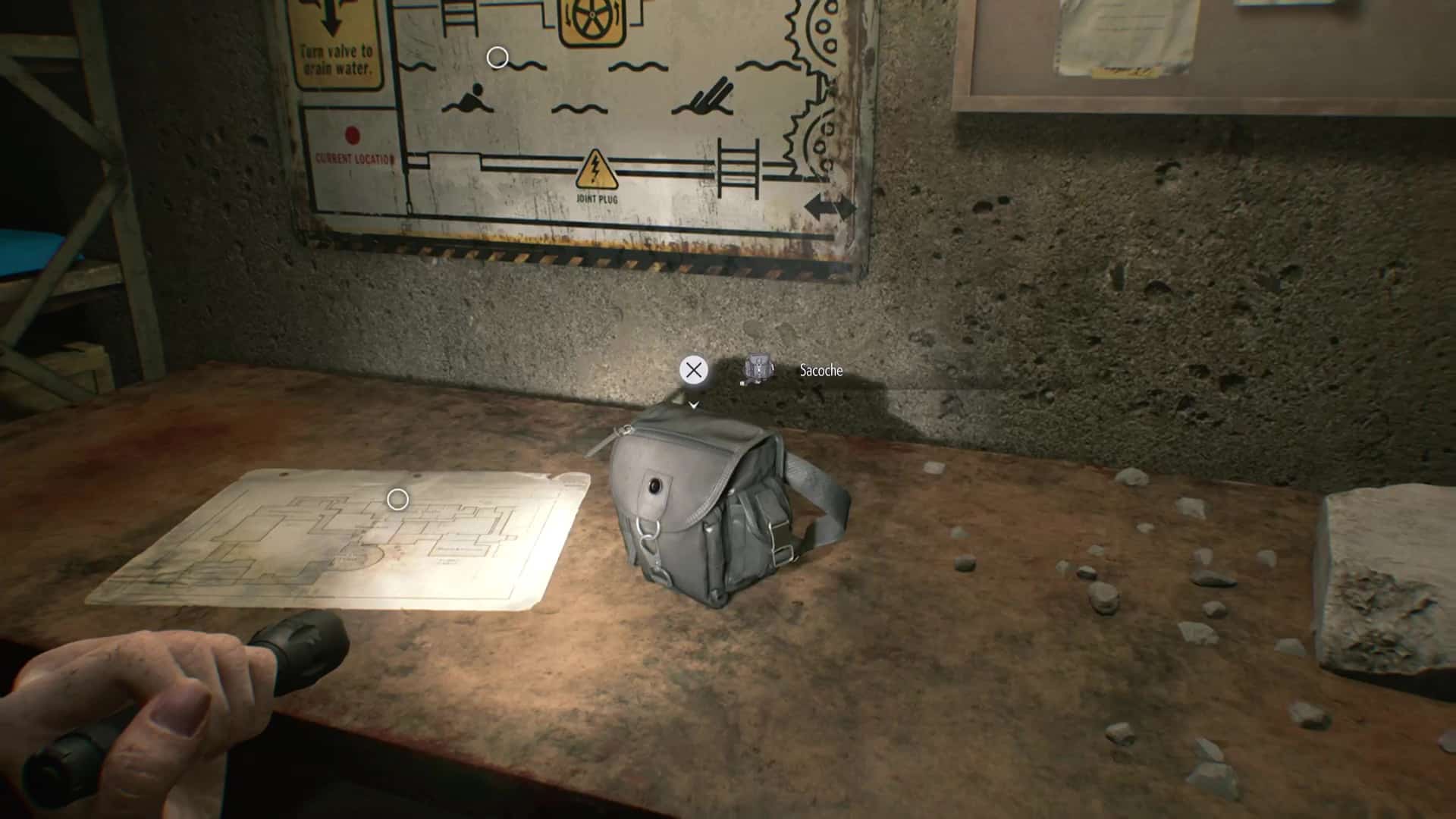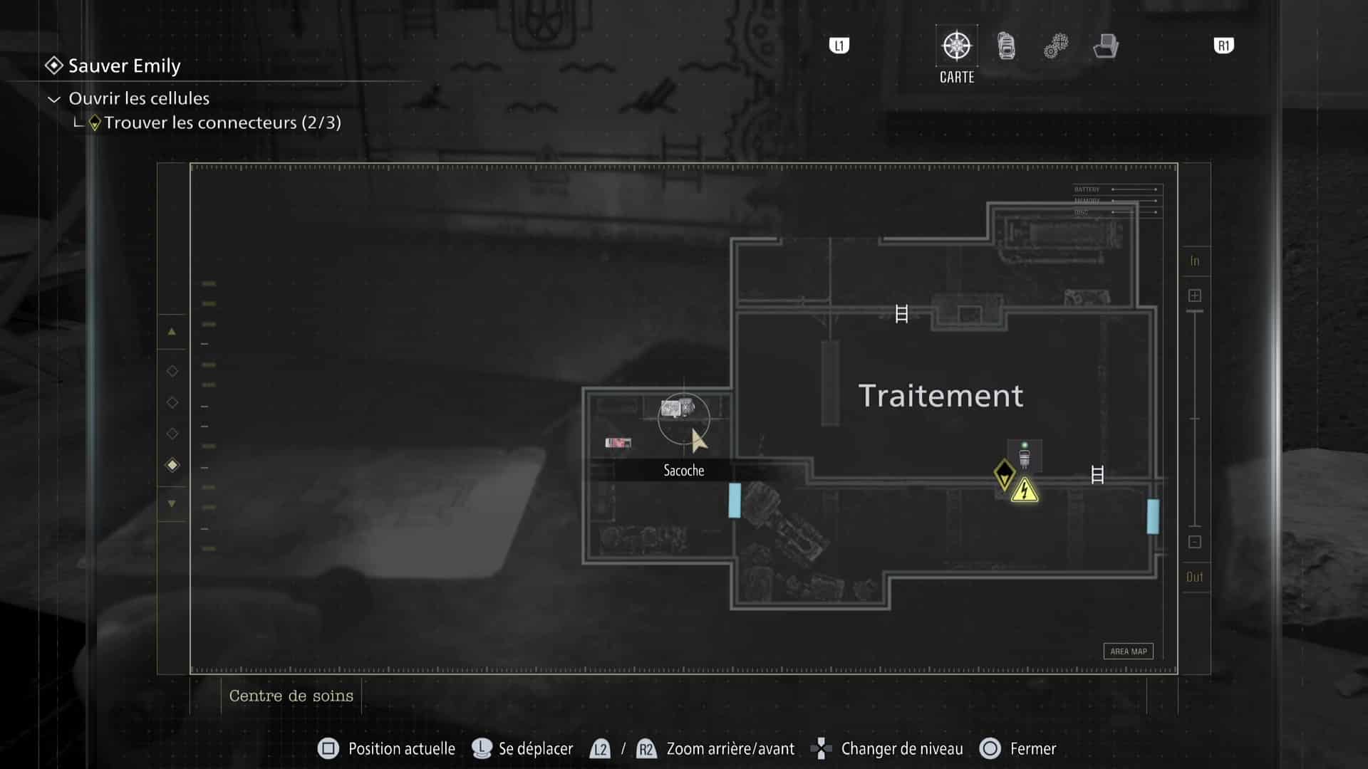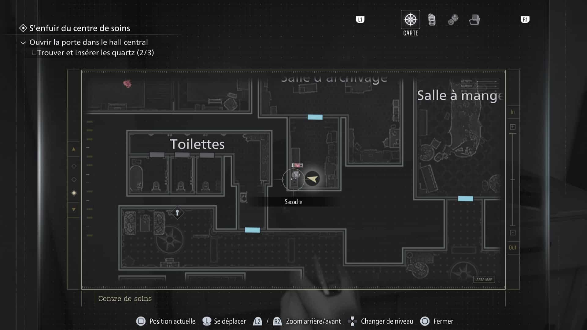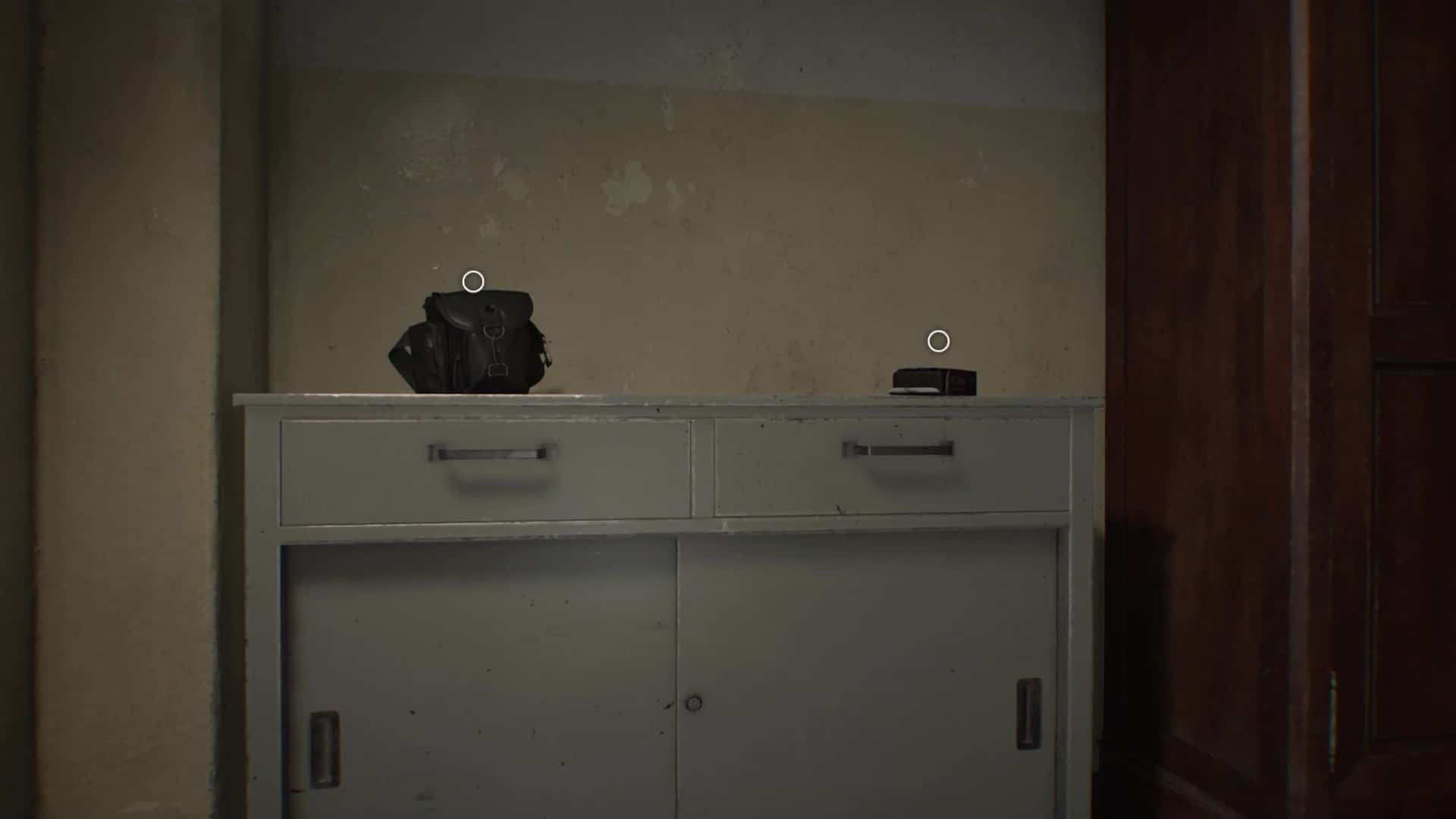 - Emplacement : Nécessite le bracelet d’identification (Nv.1). La sacoche est à l’intérieur de la Salle d’archivage de l’aile ouest du centre de soins de Rhodes Hill, verrouillée par une porte de sécurité Nv.1. Attention au zombie qui rôde dans le coin, et qui n’était pas là la première fois.