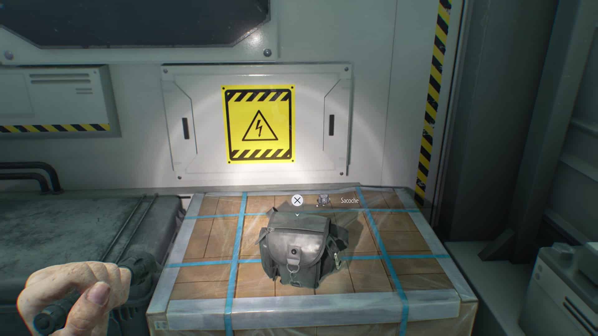 En appuyant sur l’interrupteur carré blanc, vous pourrez ouvrir le conteneur. La sacoche est à l’intérieur, posée sur une caisse.