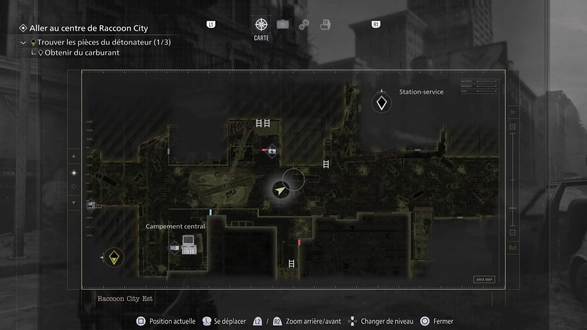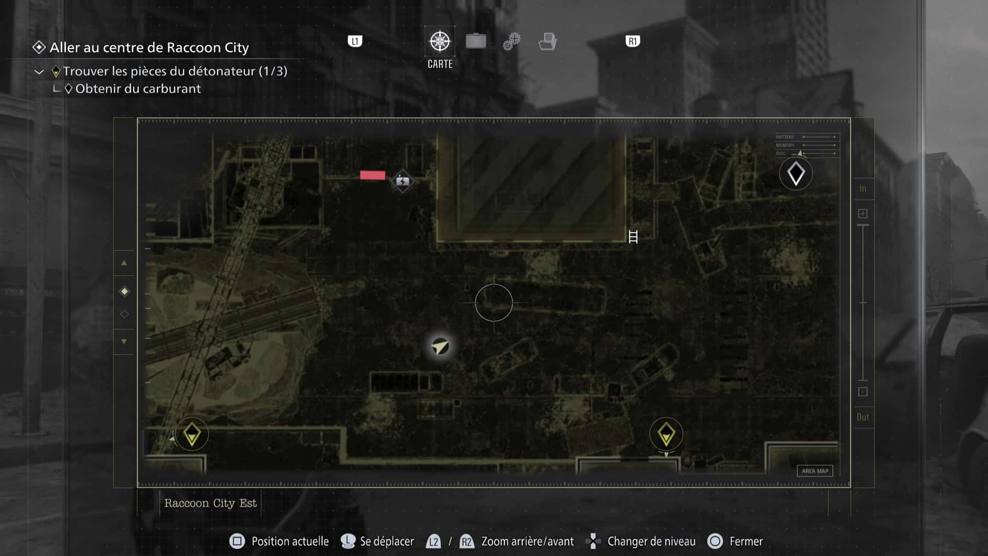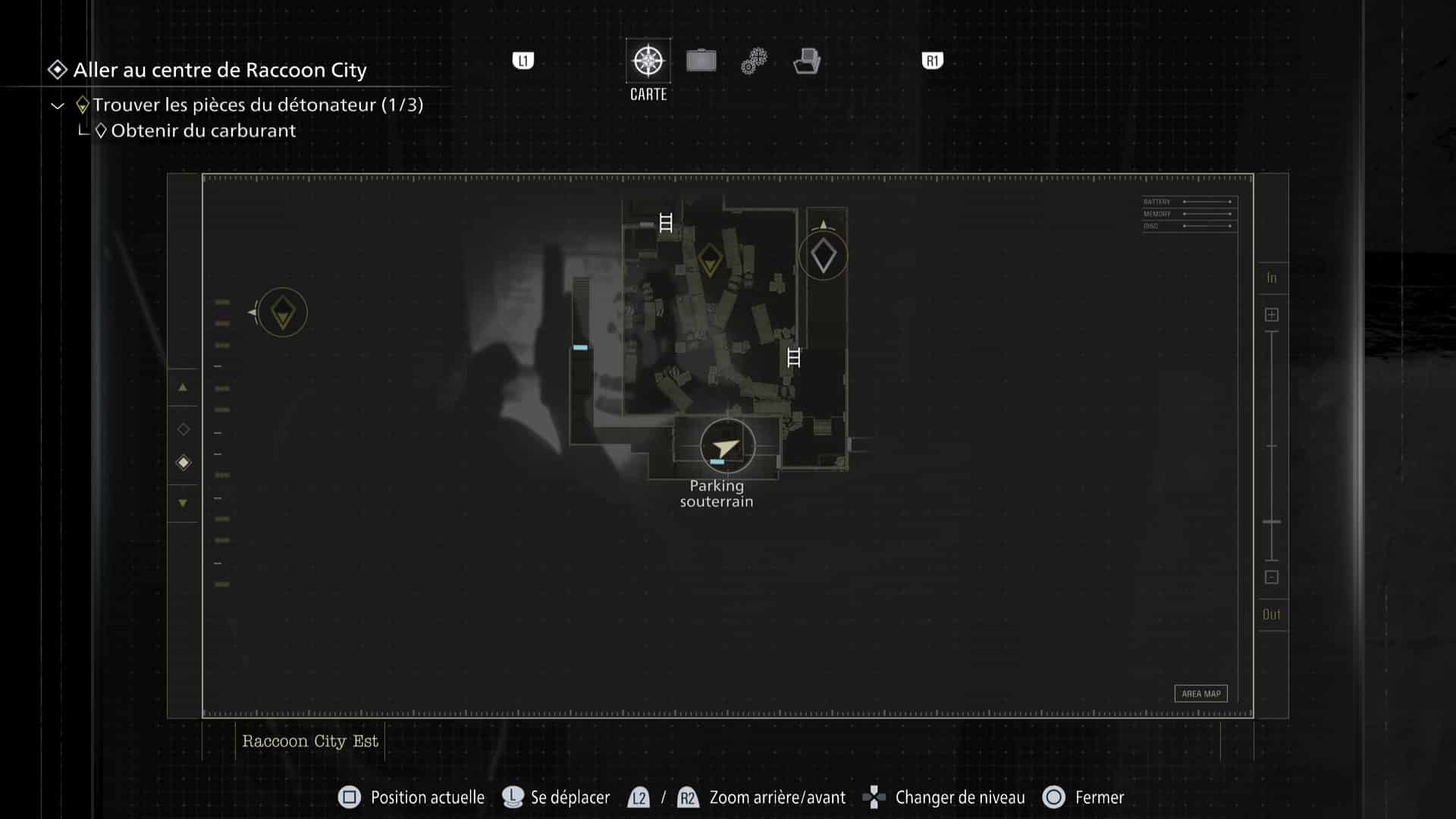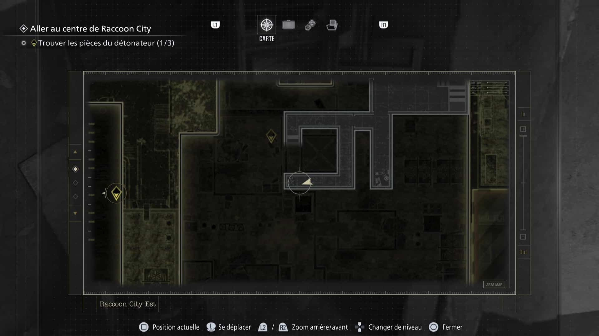 La zone de Raccoon City est découpée en deux gros niveaux : une partie dans Raccoon City Est, une autre dans le Centre de Raccoon City. Notez que placer le détonateur vous fera quitter Raccoon City Est définitivement. Pensez donc à tout vérifier avant de partir.