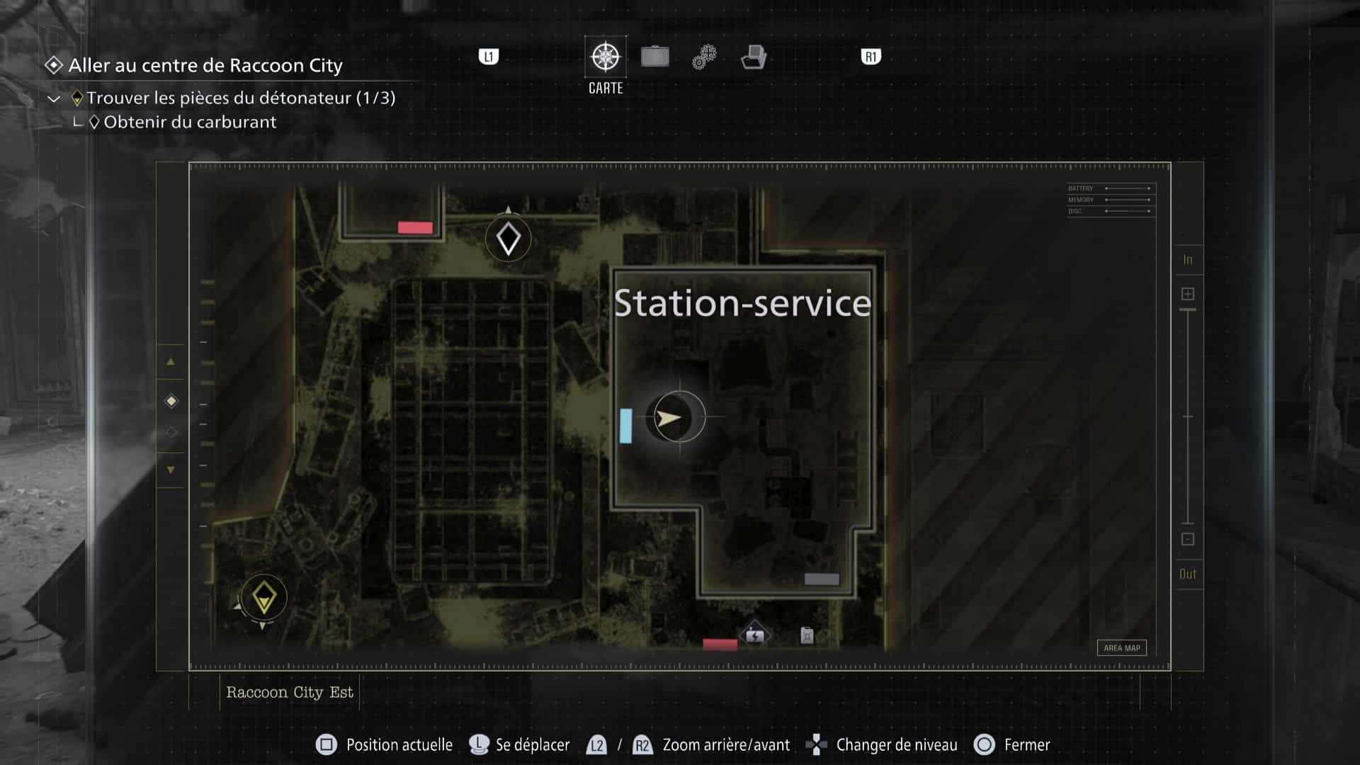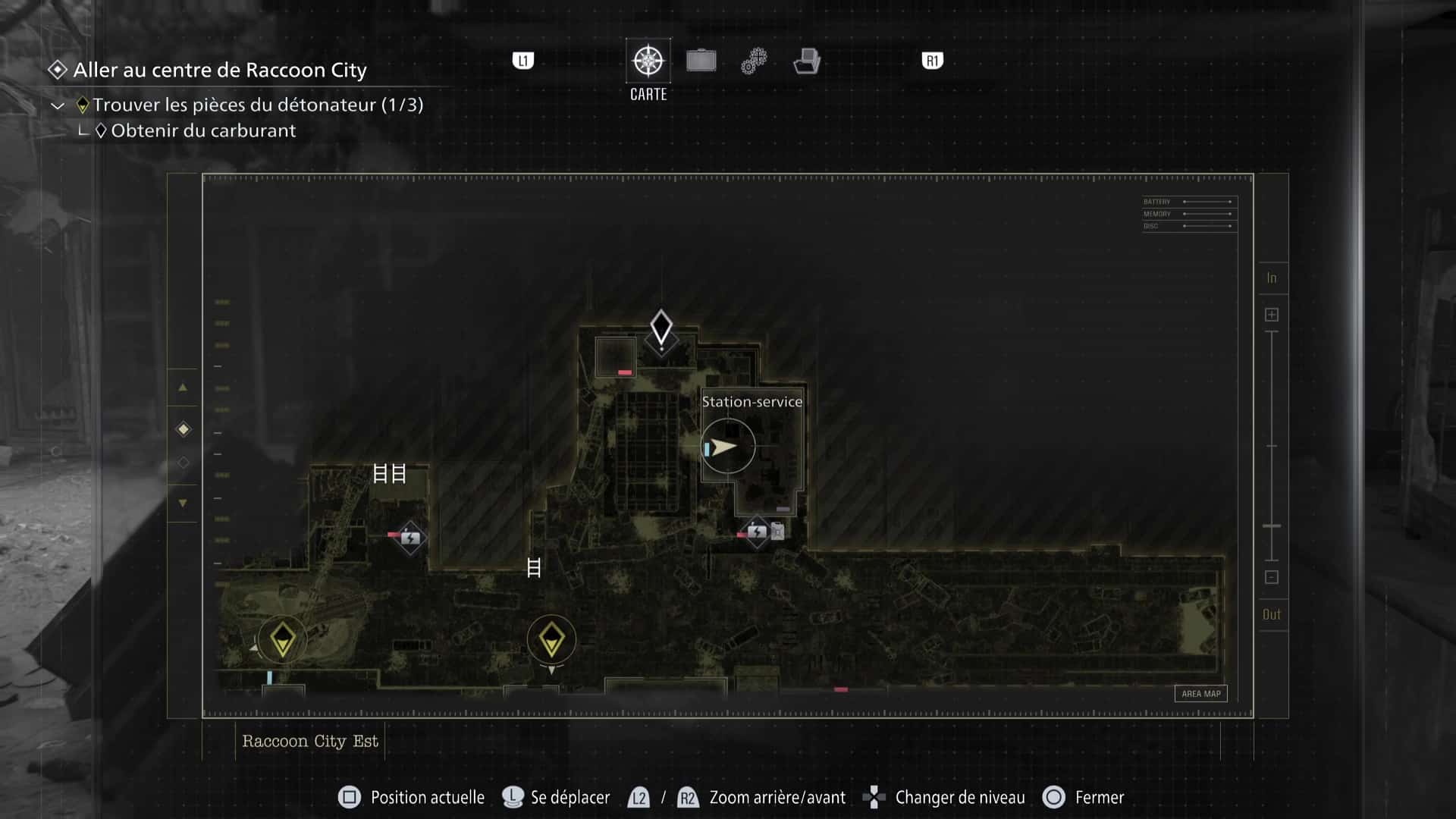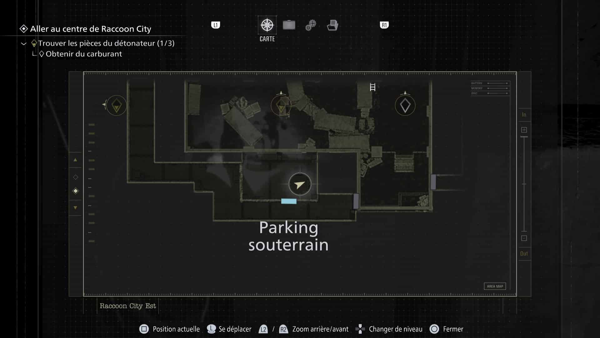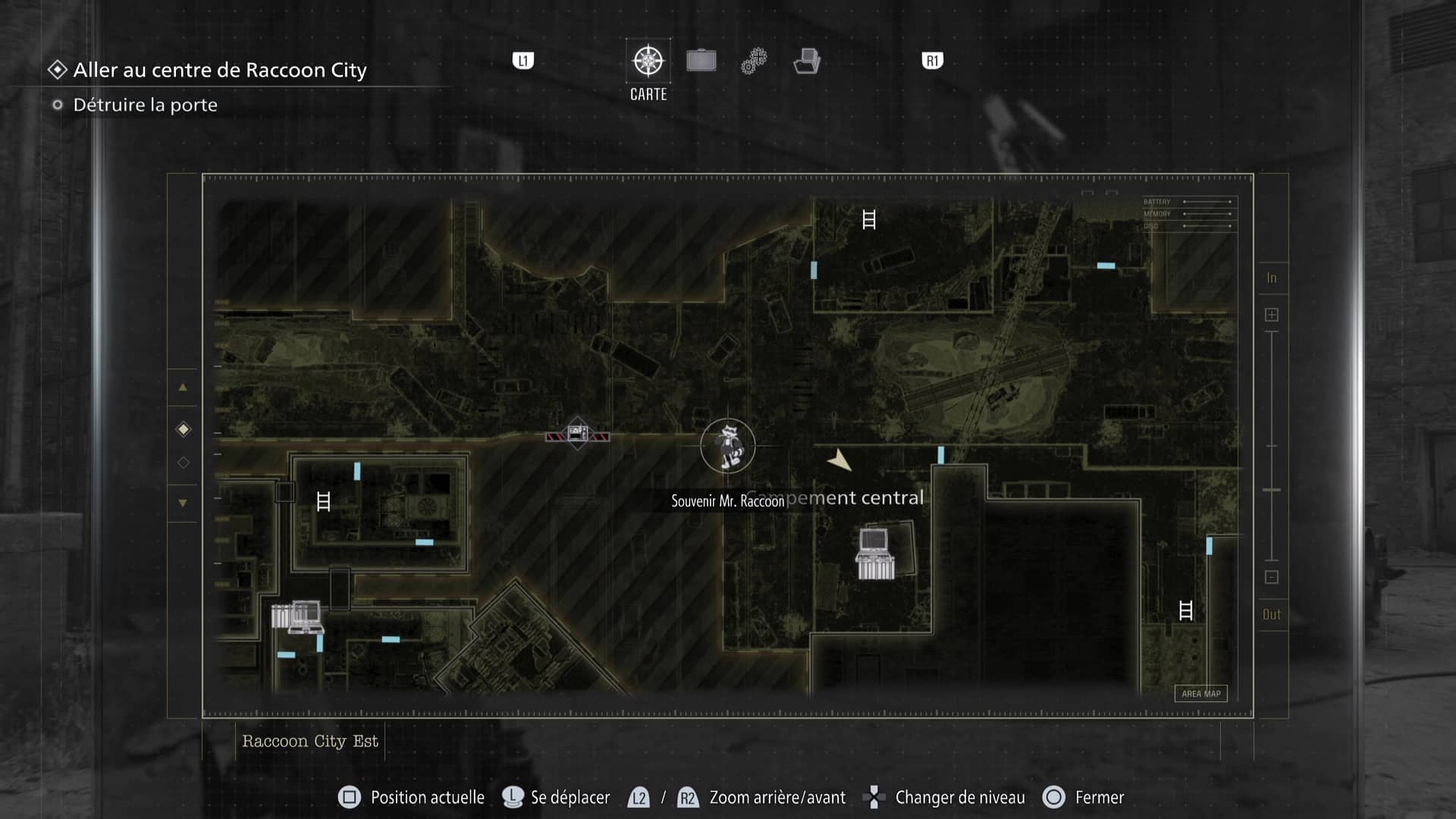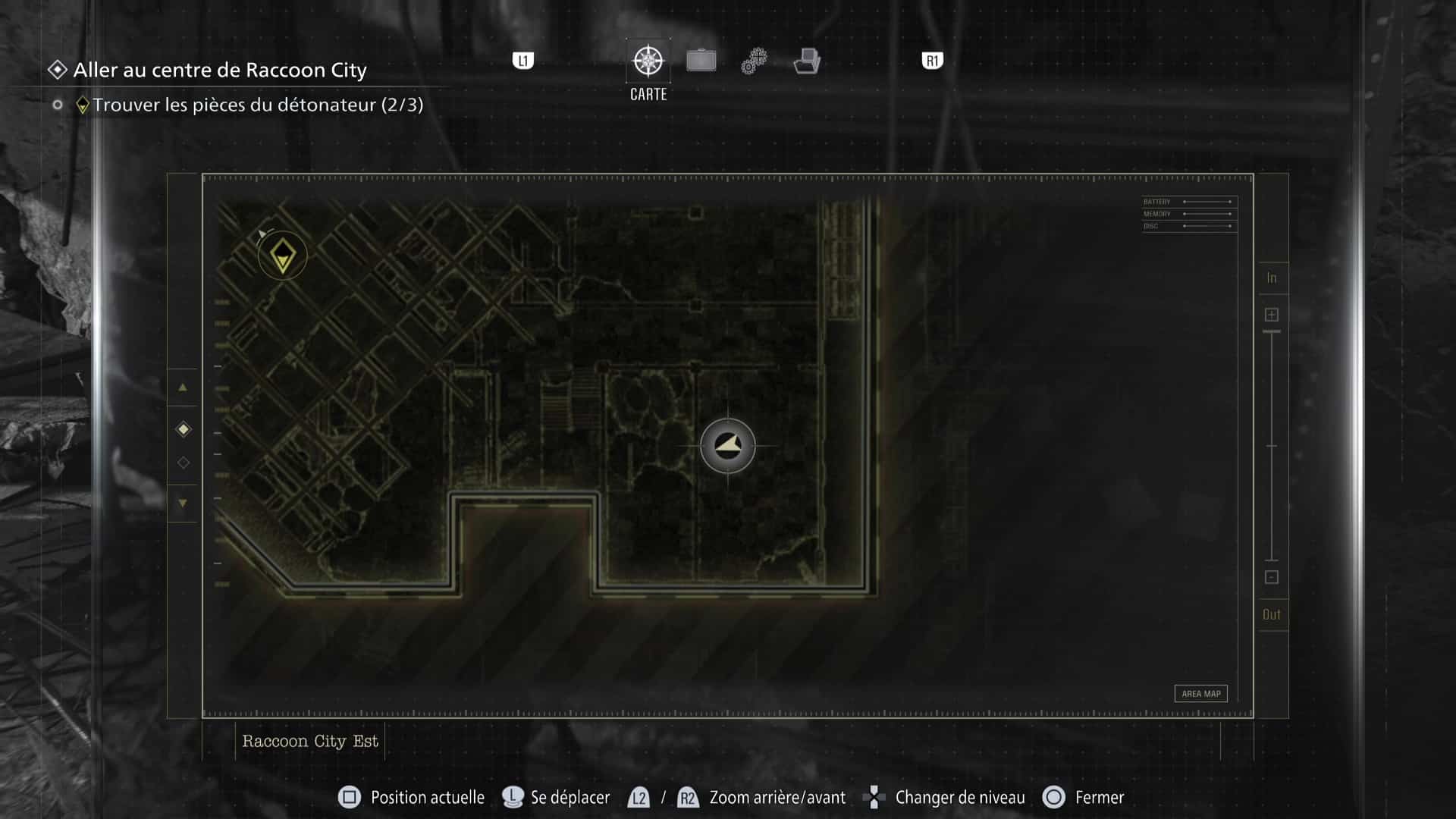 La zone de Raccoon City est découpée en deux gros niveaux : une partie dans Raccoon City Est, une autre dans le Centre de Raccoon City. Notez que placer le détonateur vous fera quitter Raccoon City Est définitivement. Pensez donc à tout vérifier avant de partir.