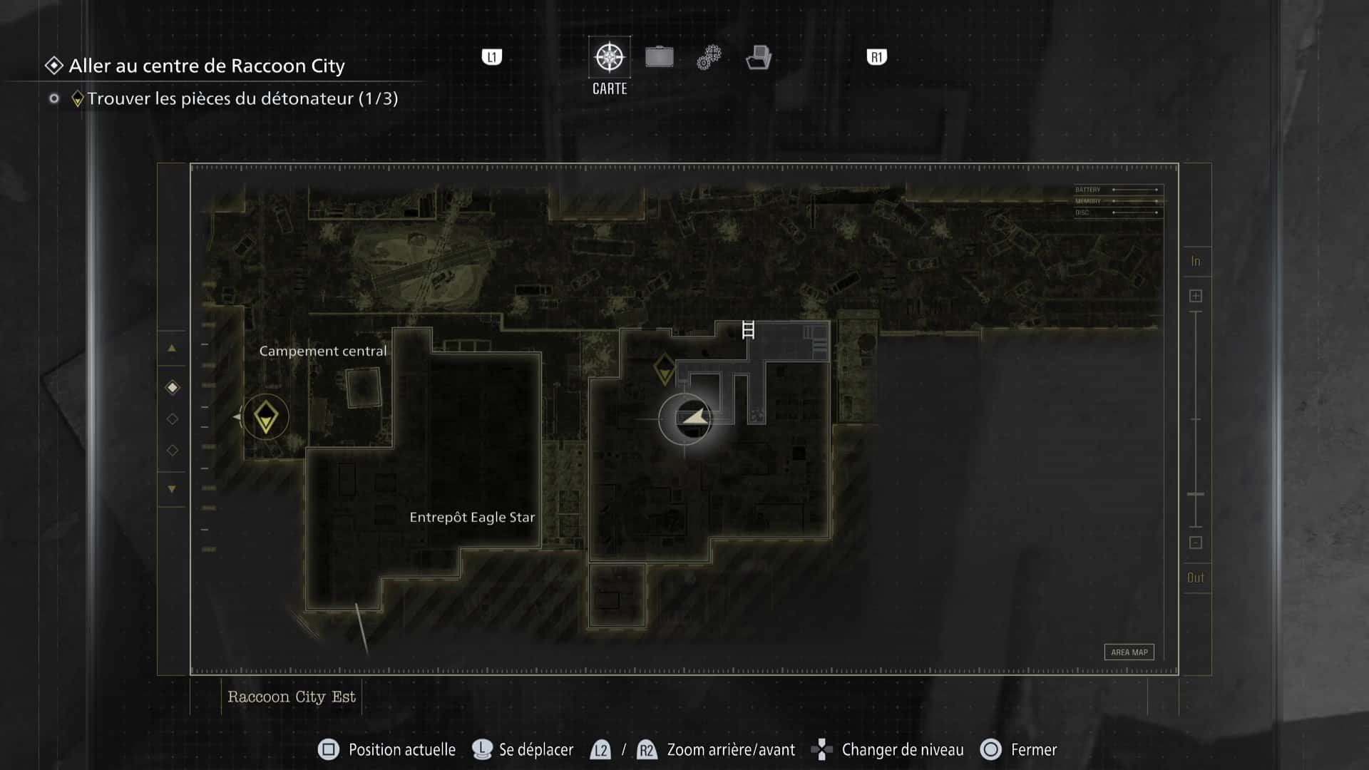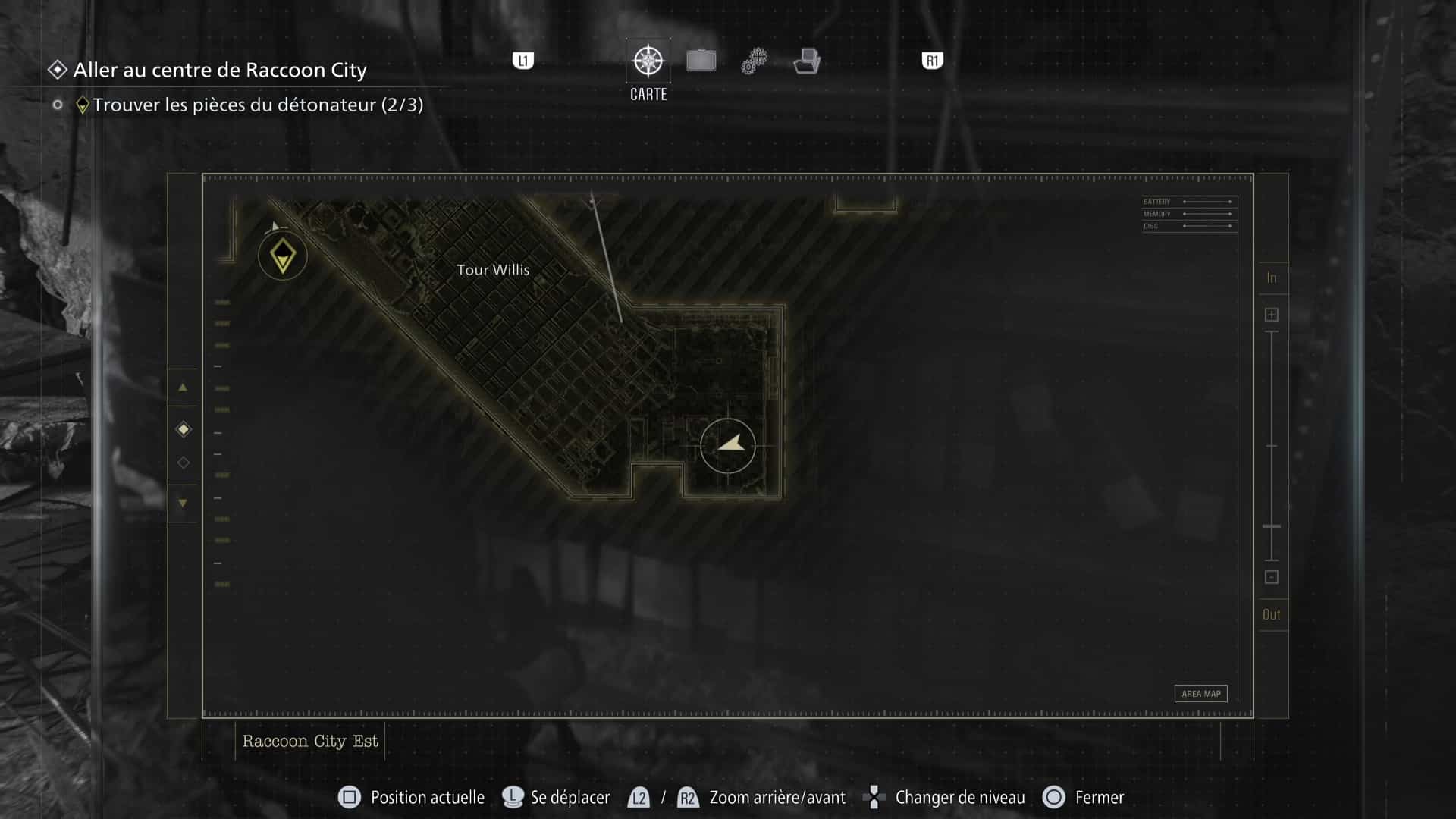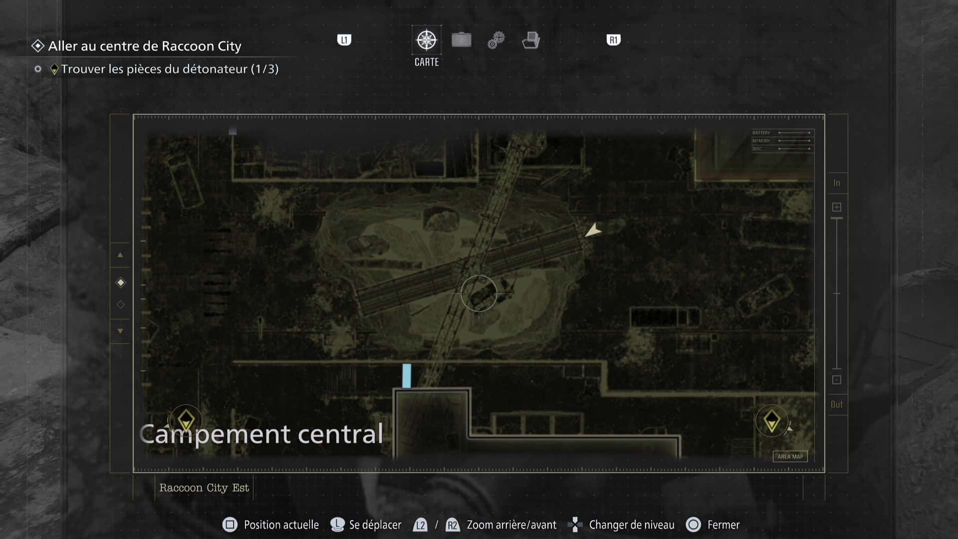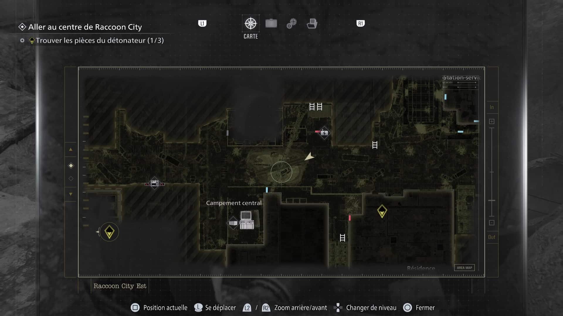 La zone de Raccoon City est découpée en deux gros niveaux : une partie dans Raccoon City Est, une autre dans le Centre de Raccoon City. Notez que placer le détonateur vous fera quitter Raccoon City Est définitivement. Pensez donc à tout vérifier avant de partir.