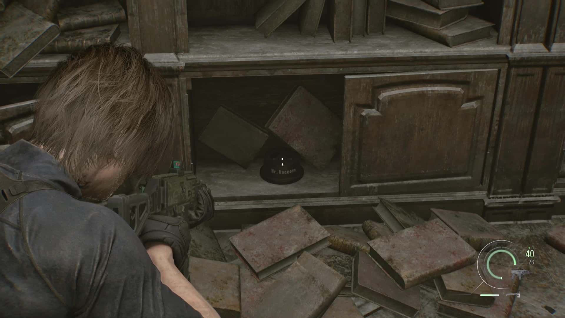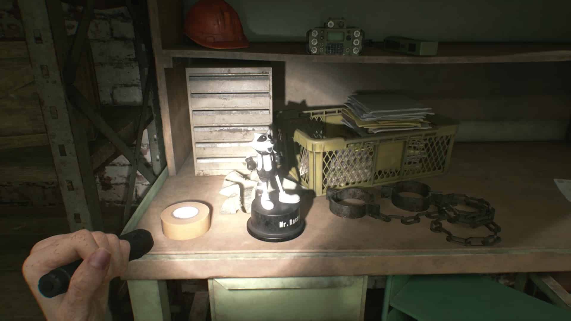 - Emplacement : Rendez-vous à la Bibliothèque, au premier étage, qui est accessible par la partie ouest du commissariat. Vous y trouverez le cric, nécessaire pour lever les rideaux métalliques. Une fois ramassé, retournez-vous et examinez les placards de la bibliothèque au niveau du sol. Vous entendrez un Mr. Raccoon gigoter. Il est caché par des livres dans l’un de ces placards.