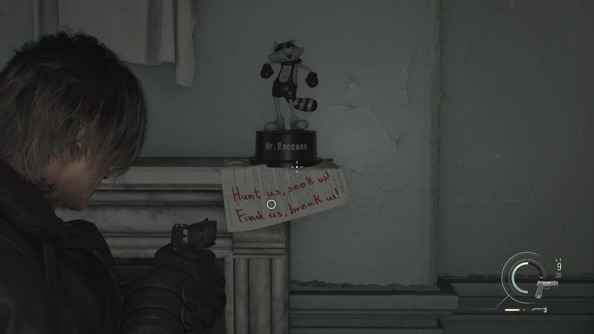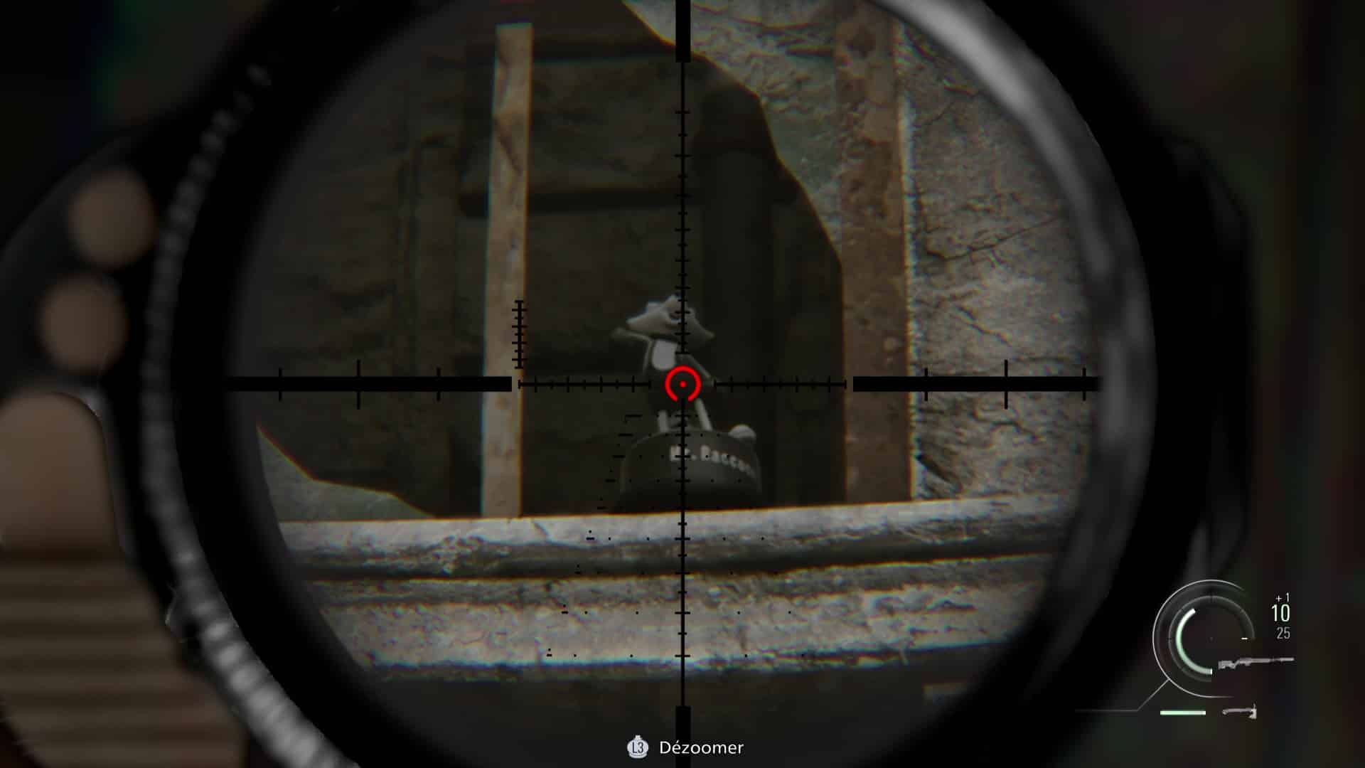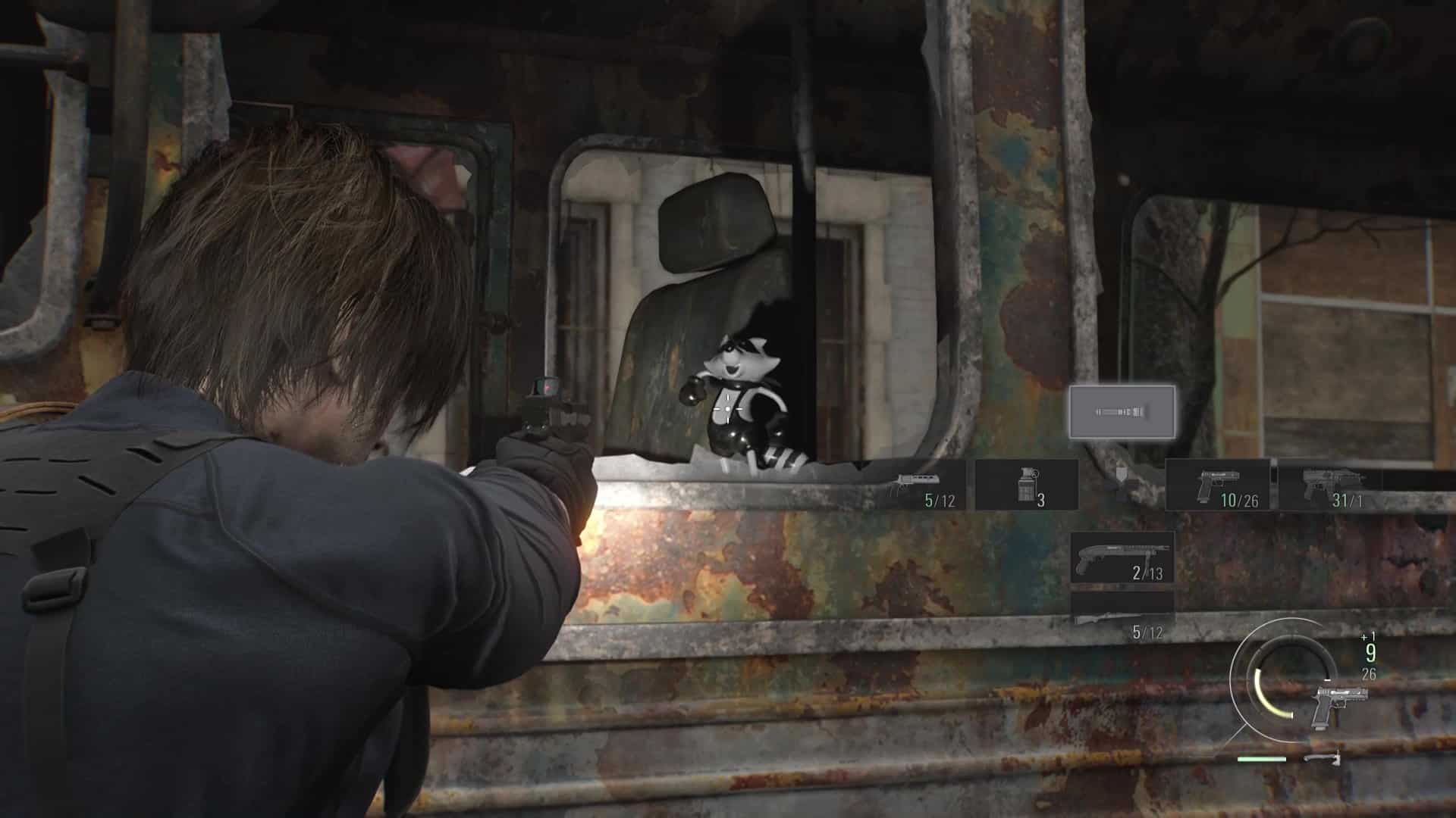 - Emplacement : De nouveau aux commandes de Leon après l’accident d’hélicoptère et désormais en possession d’un fusil sniper, enjambez la fenêtre et courez sur les toits afin de trouver une position pour couvrir Grace. Avancez jusqu’à tomber sur des munitions de fusil, posé sur une fenêtre sur votre gauche. Au lieu de continuer, restez à cette fenêtre et sortez votre fusil. Dirigez le viseur vers le portail menant à l’église, légèrement sur votre gauche. Zoomez et vous verrez un Mr. Raccoon se dandiner sur un des deux piliers en pierre.