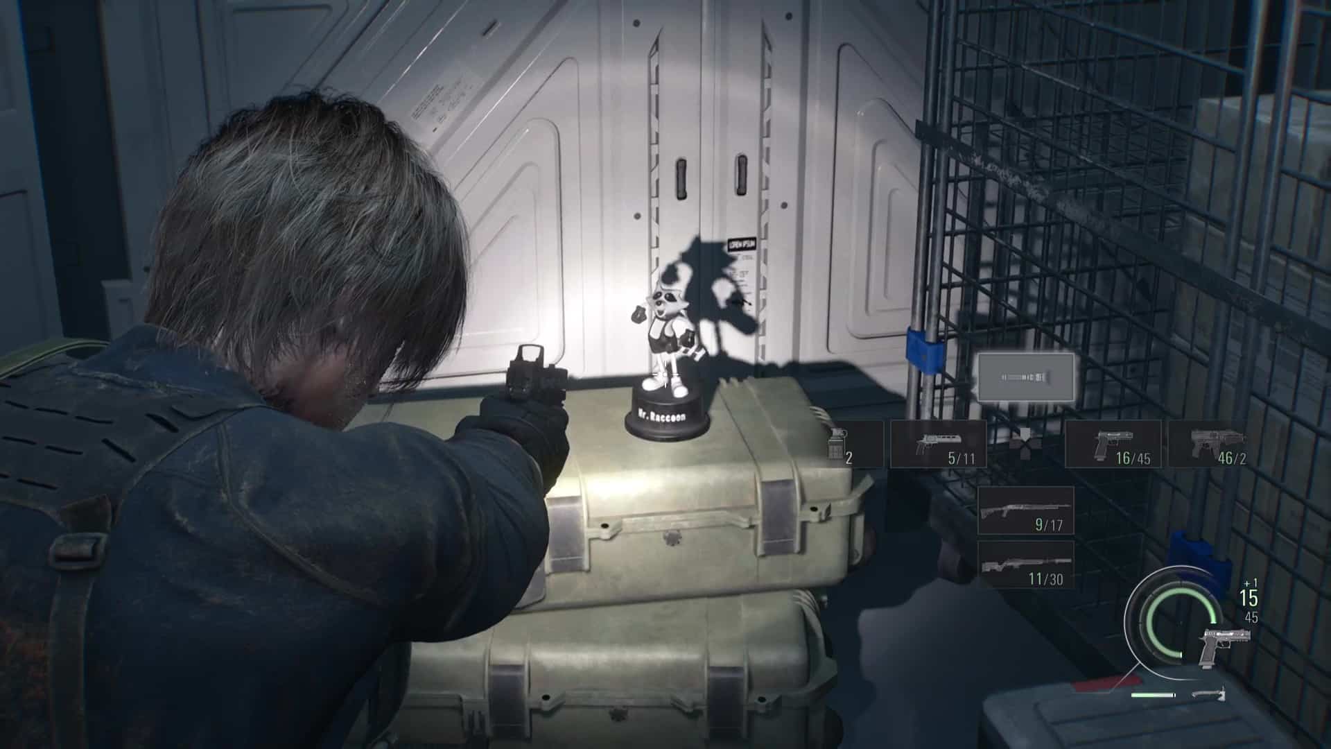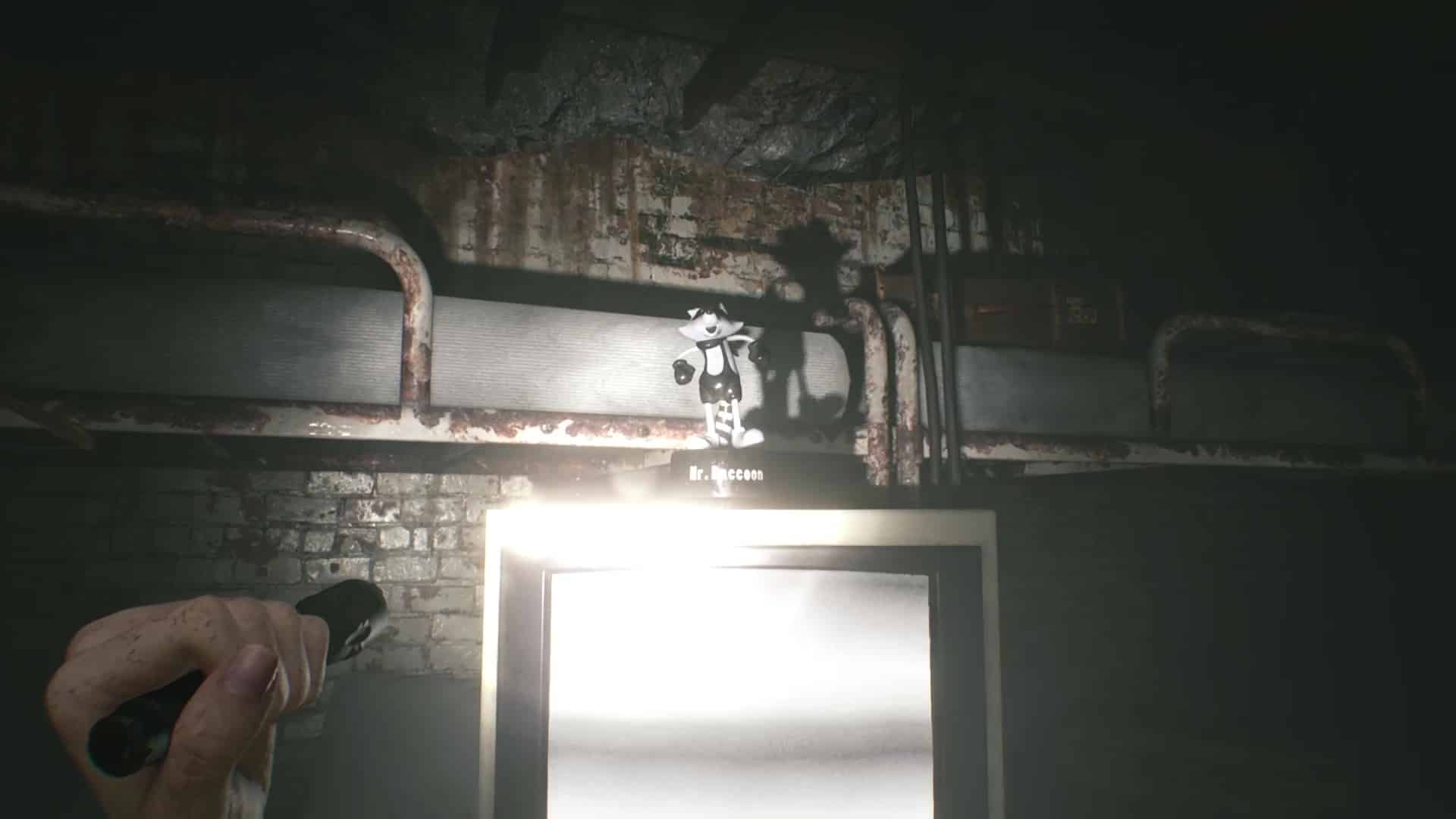 - Emplacement : Au tout début de votre arrivée dans le centre de Raccoon City, ne suivez pas le chemin au nord menant à la suite, mais allez plutôt au bout de la rue à l’ouest. Vous arrivez dans un cul-de-sac avec un camion citerne délabré bloquant le passage. Légèrement vers la droite, au sol, le Mr. Raccoon vous attend.