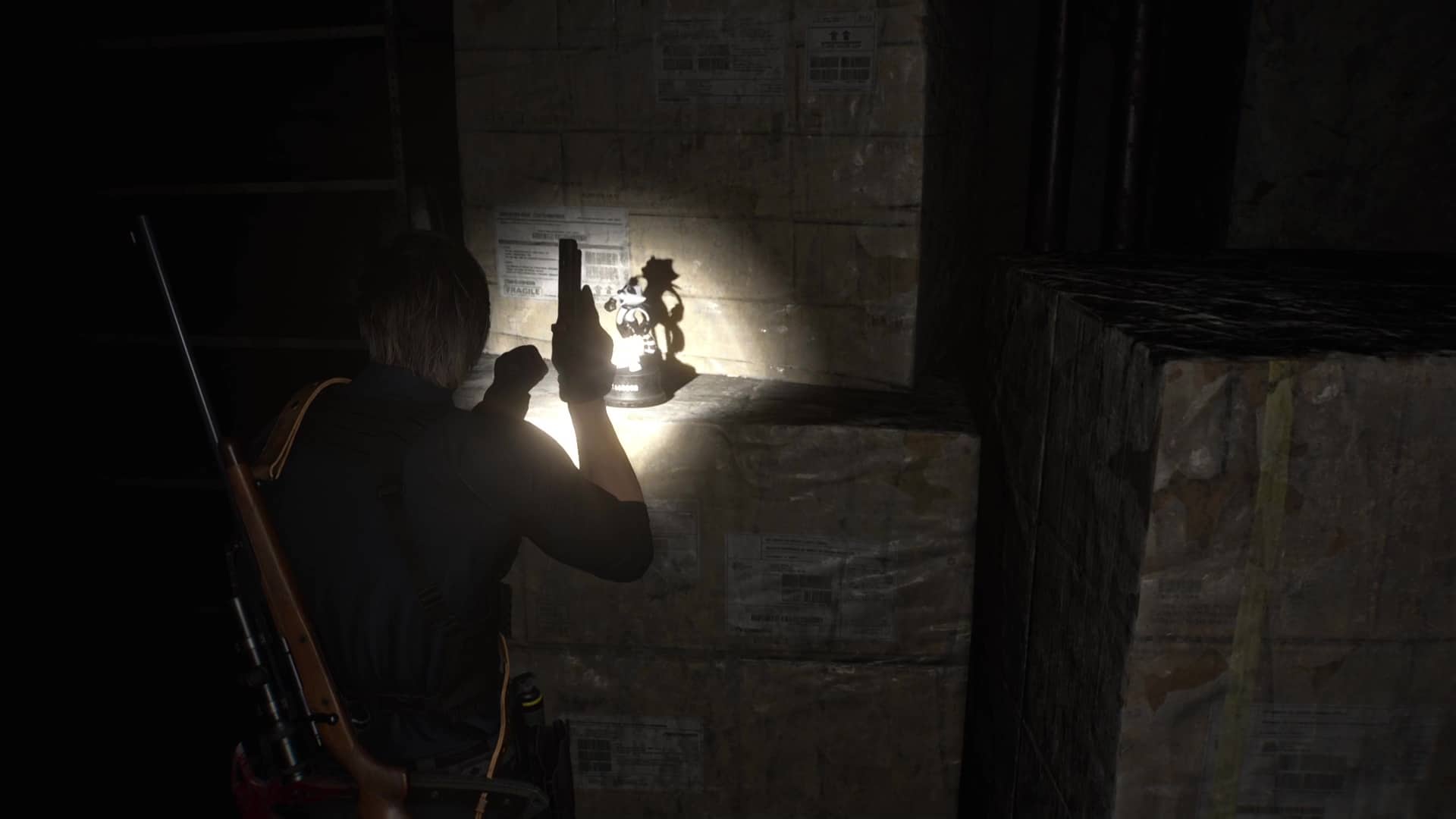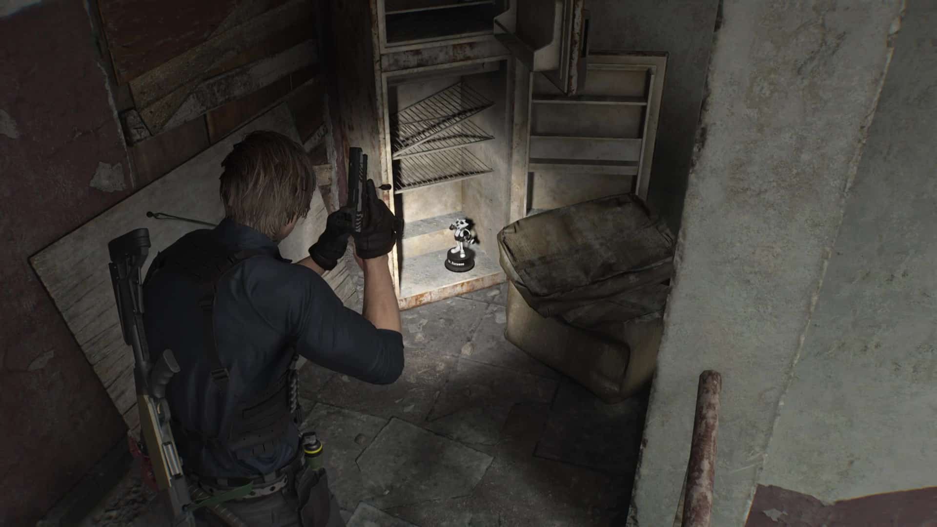 Enchainez de nouveau à droite puis, au sommet d’une cage d’escalier, allez sur la gauche plutôt que de descendre. Vous arriverez devant un frigo dans lequel se trouve la figurine.