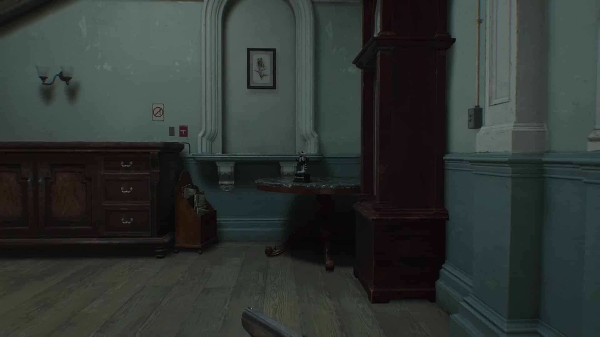 - Emplacement : Dans l’aile est, à l’est de la Salle d’attente se trouve une salle qui mène à l’étage supérieur. Au lieu de prendre les escaliers, explorez le bas de la pièce pour apercevoir un Mr. Raccoon sur une table, juste à côté d’une horloge.