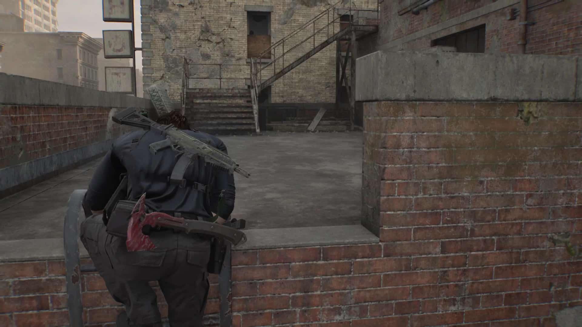 Passez de l’autre côté et éliminez les zombies qui vous attendent un peu plus loin. Une fois le calme revenu, remarquez une échelle menant aux égouts. Descendez l’échelle et suivez le chemin qui mène à une porte.