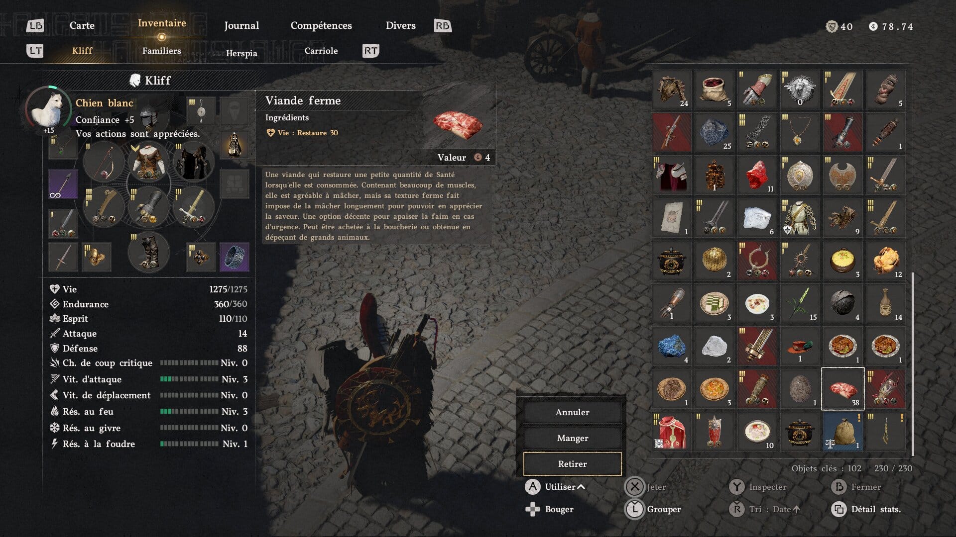 Allez donc faire passer le temps près d’un feu (3 heures), et revenez à l’endroit où vous avez laissé le chien, qui devrait toujours s’y trouver. Il sera de nouveau réceptif aux caresses, ce qui vous laissera maximiser la relation. Une fois adopté, le chien peut être géré depuis le menu Inventaire. Il sera un compagnon très utile dans la mesure où il ramassera le loot pour vous.