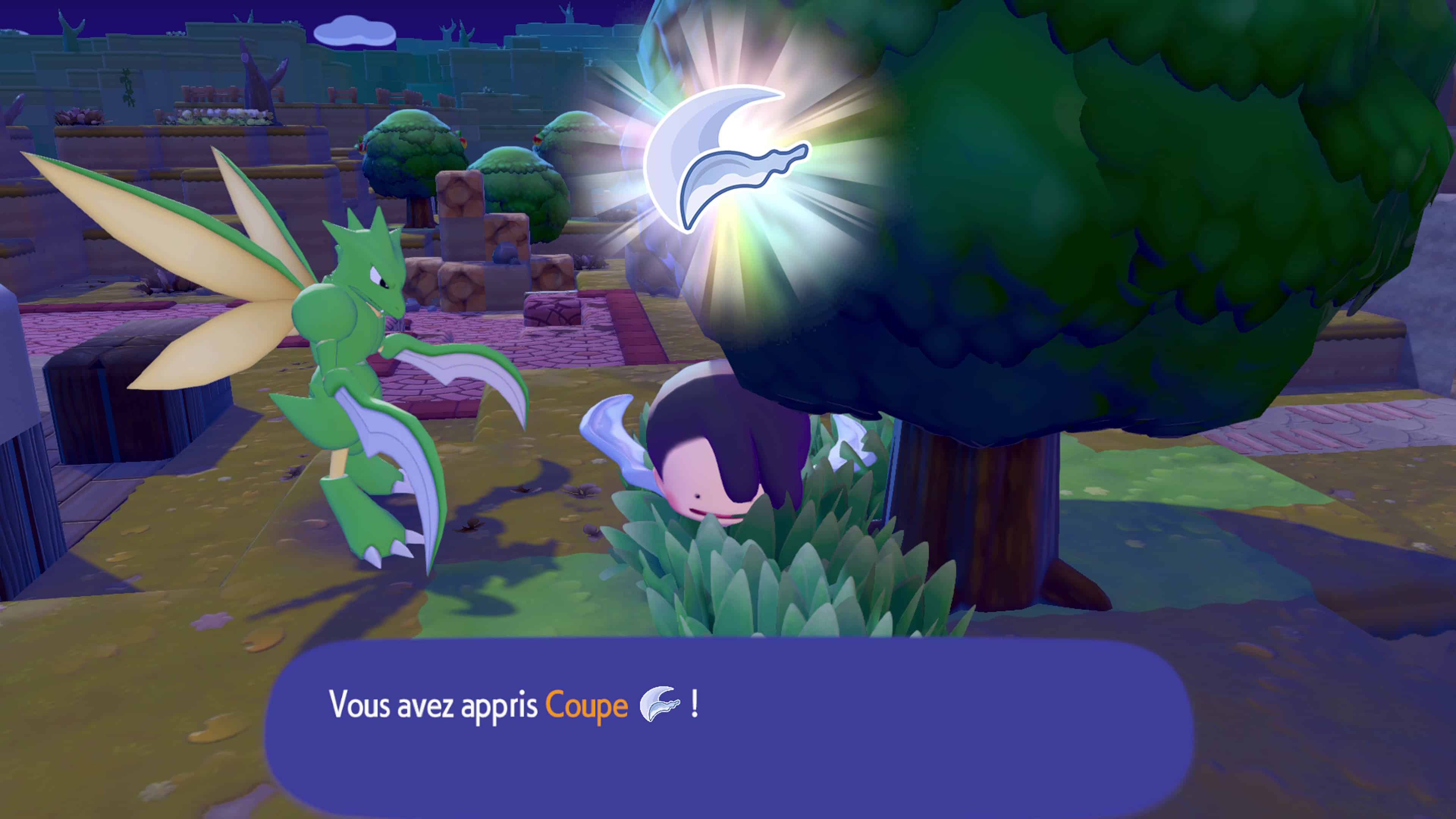Comme les autres capacités, Coupe vous est enseigné par un autre Pokémon : Insécateur. Pour le trouver, il va d’abord falloir créer son habitat. Pour cela, il vous suffit simplement d’utiliser feuillage et de faire émerger quatre hautes herbes en dessous d’un arbre. Peu de temps après ça, vous verrez l’une des hautes herbes gigoter. Il suffit ensuite d’interagir pour faire jaillir le Pokémon.