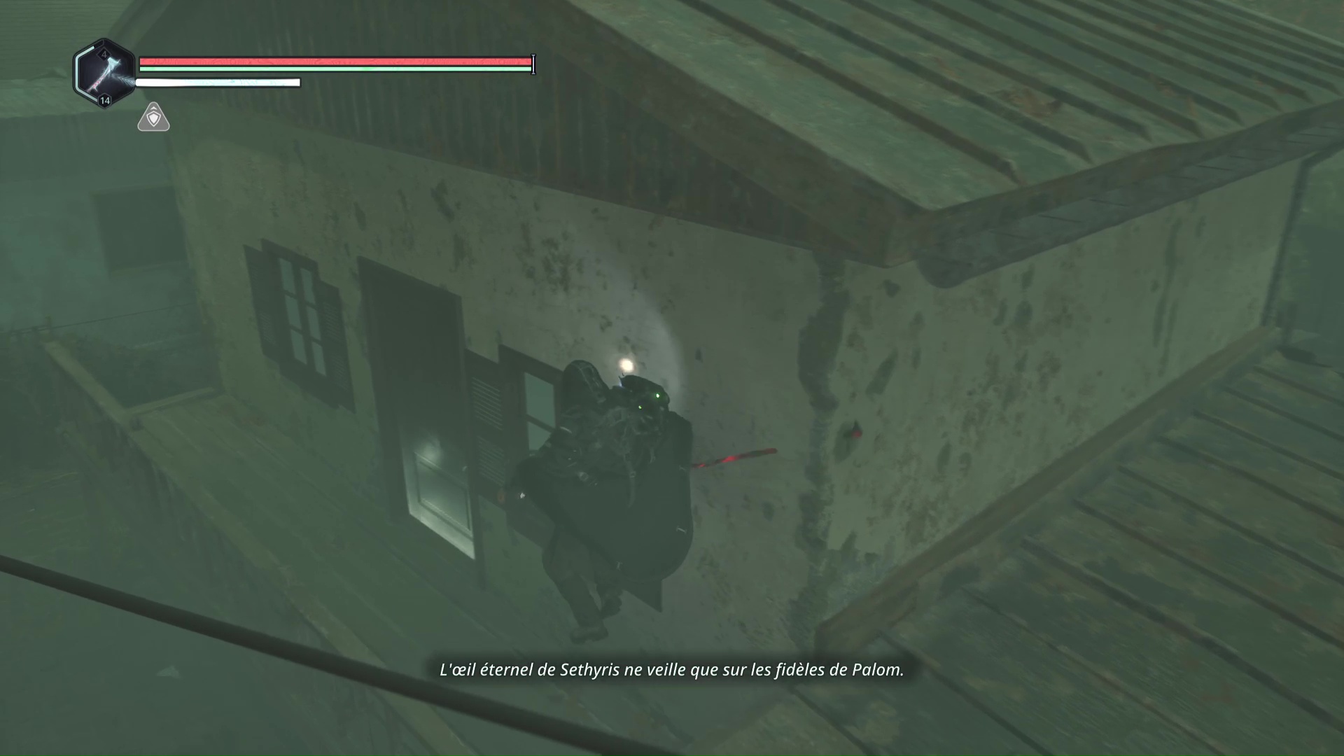 Le frère est retranché au sommet de l’église et peut être rejoint par les échafaudages depuis l’arrière de l’église. Lui parler n’est pas obligatoire mais il faut de toute façon passer par les échafaudages pour récupérer les Clés – Grue, indispensables pour la suite. Depuis le toit, laissez-vous tomber et passez par les échelles pour rejoindre le point brillant doré sur un cadavre, dans une zone inaccessible autrement. Il s’agit des clés.