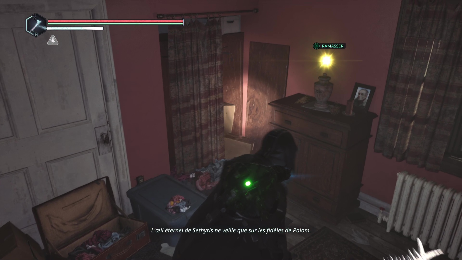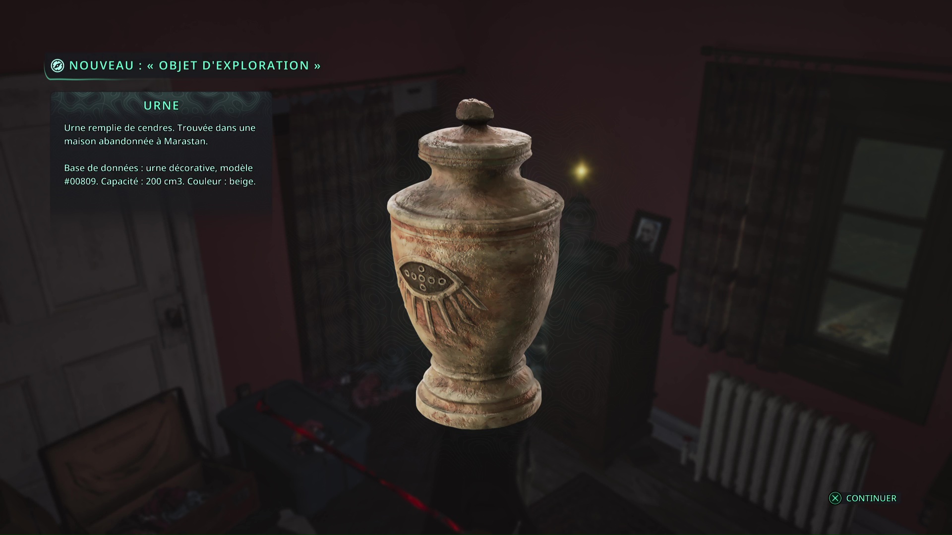 Ouvrez la porte, pénétrez à l’intérieur de la chambre et récupérez l’urne ainsi que la Lettre- Partir d’ici en face de vous.
