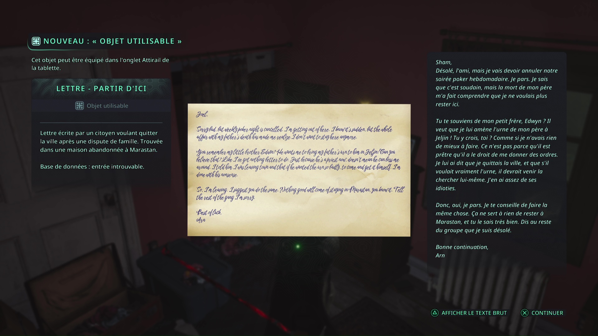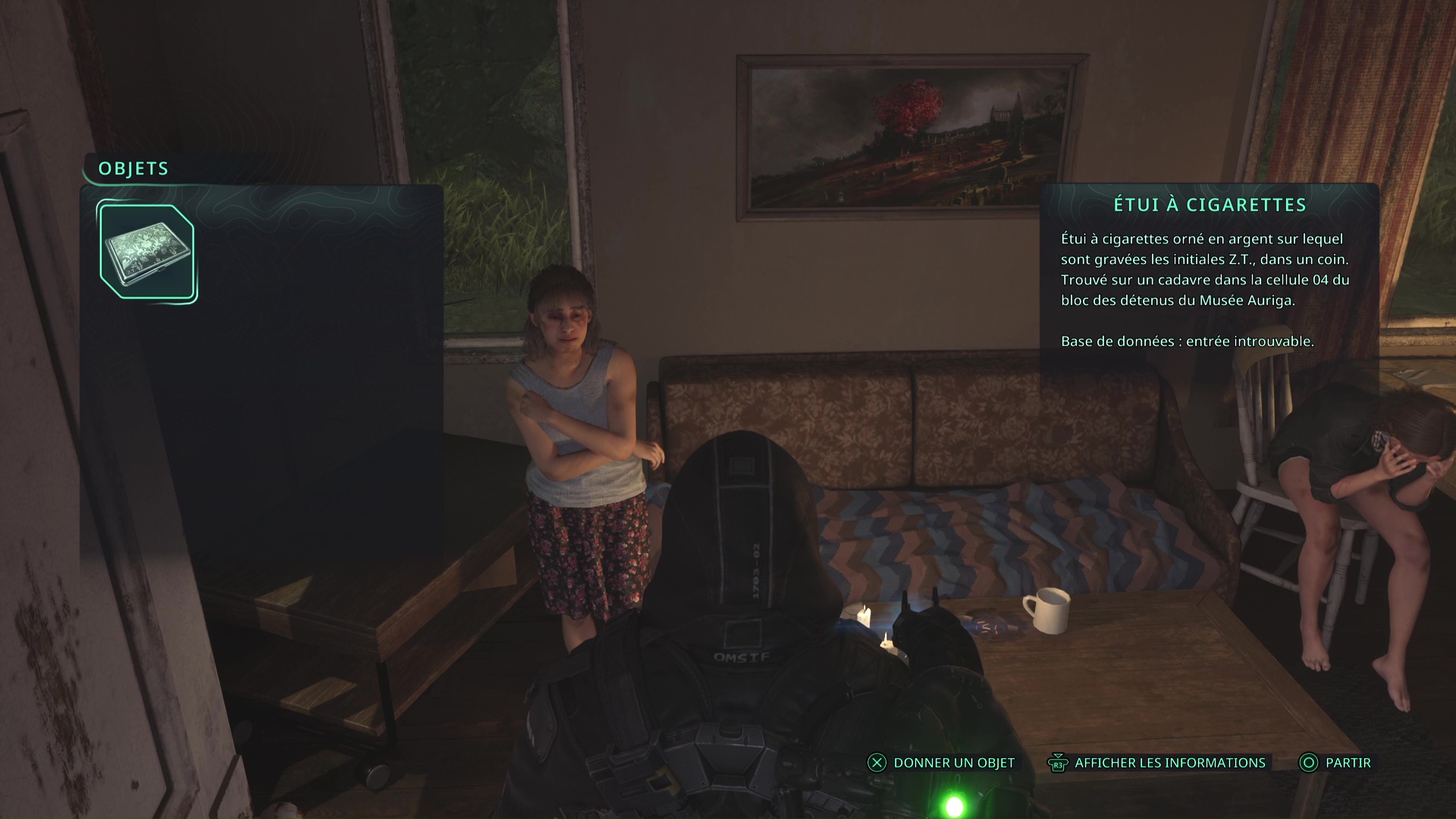 En ce qui concerne l’Etui à cigarettes, rendez-vous à Marastan, à la maison bleue près de la route. Si vous avez complété la bonne action « Les limbes de l’enfer ». La maison sera déverrouillée et les survivantes de la grange seront à l’intérieur. Montrez l’étui à Elzina Tibor, et elle apprendra ainsi le destin funeste de Ziad.