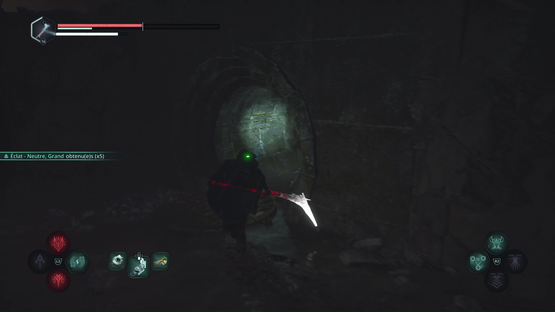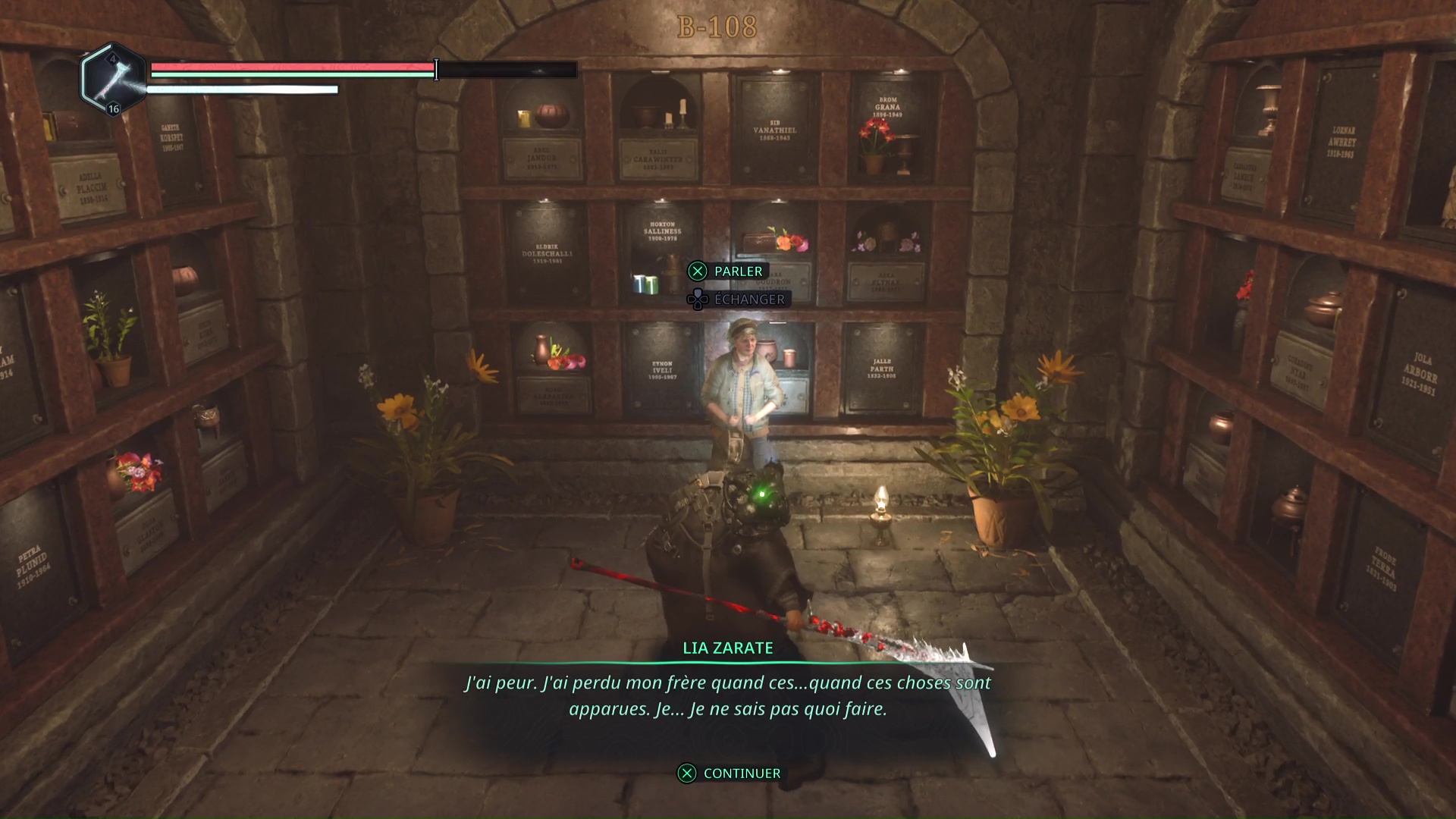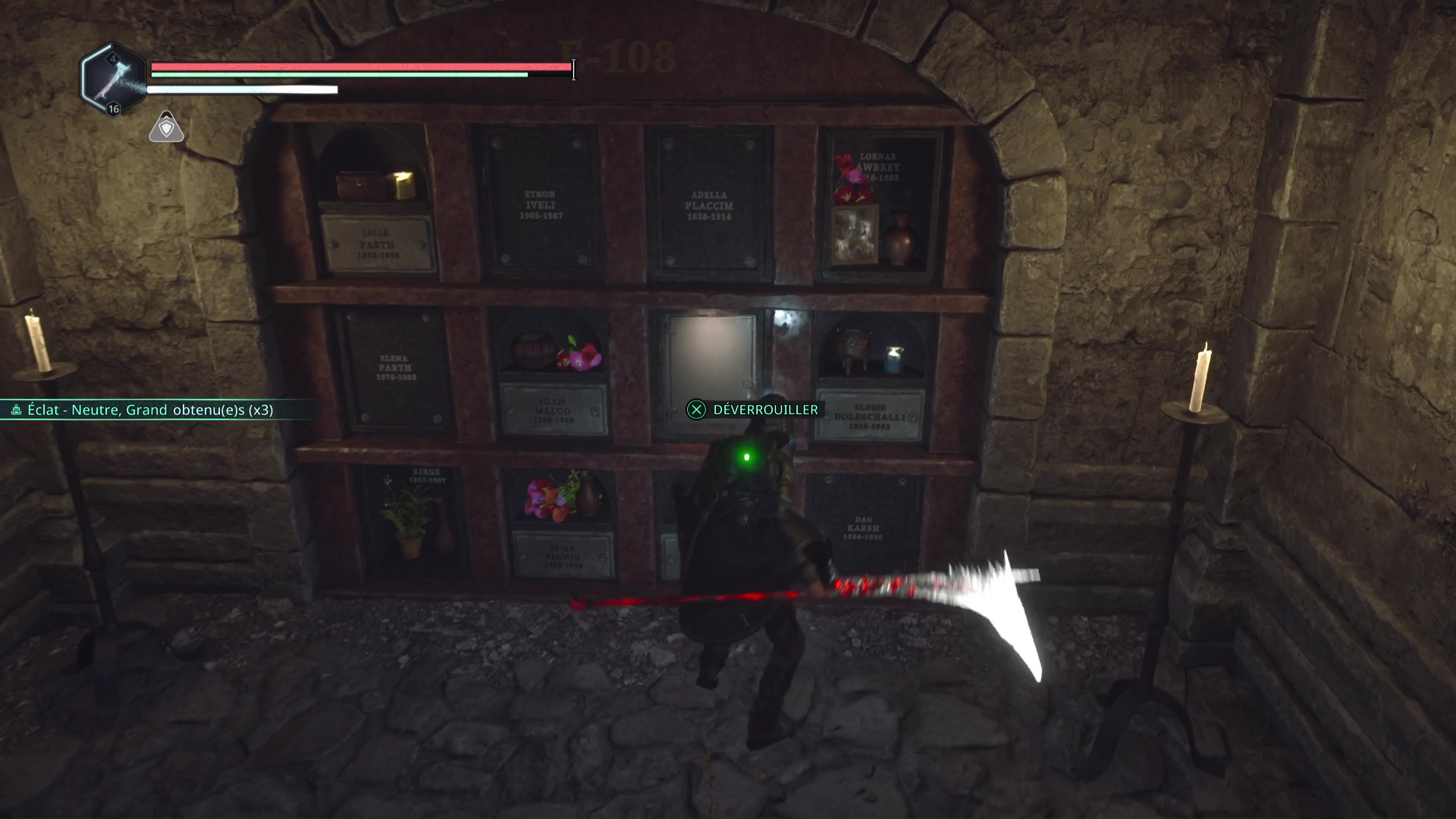 Direction le columbarium donc, que vous trouverez en vous dirigeant sur la partie gauche du niveau, lorsque l’on fait face à l’église. Progressez jusq’à traverser un grillage. Au lieu d’aller tout droit et de rejoindre le campement du site de fouilles, tournez la tête à droite pour entrer dans le columbarium. Eliminez l’Hollow Walker et regardez sur votre gauche pour être tranquille.