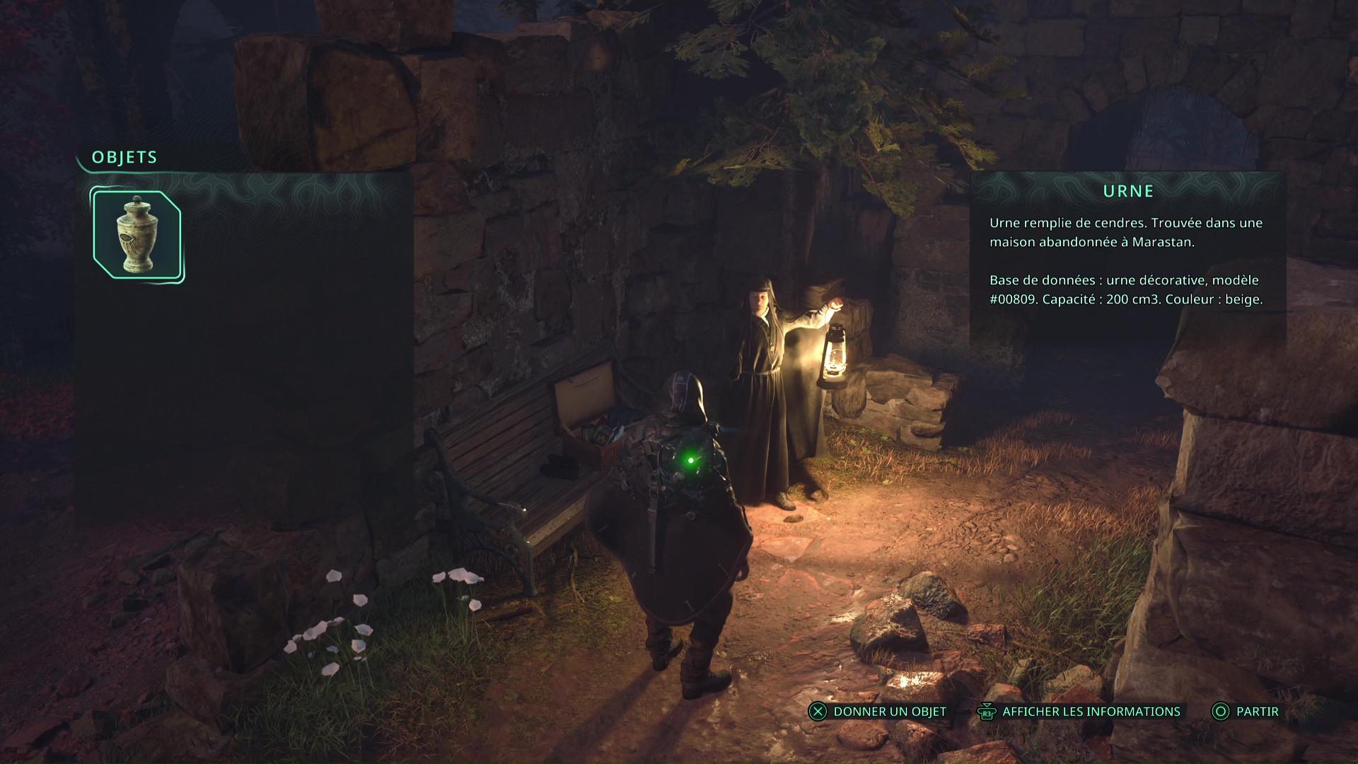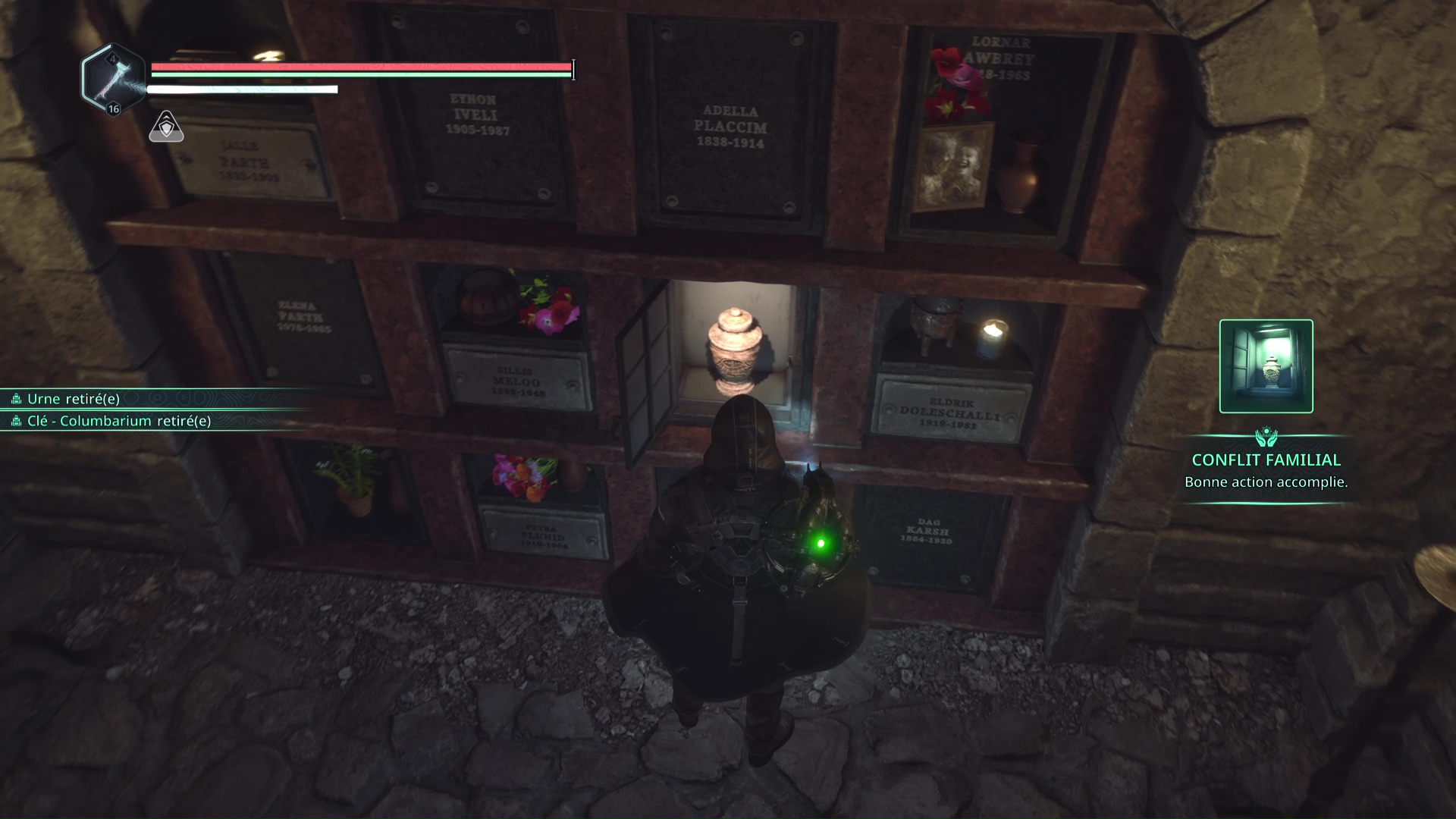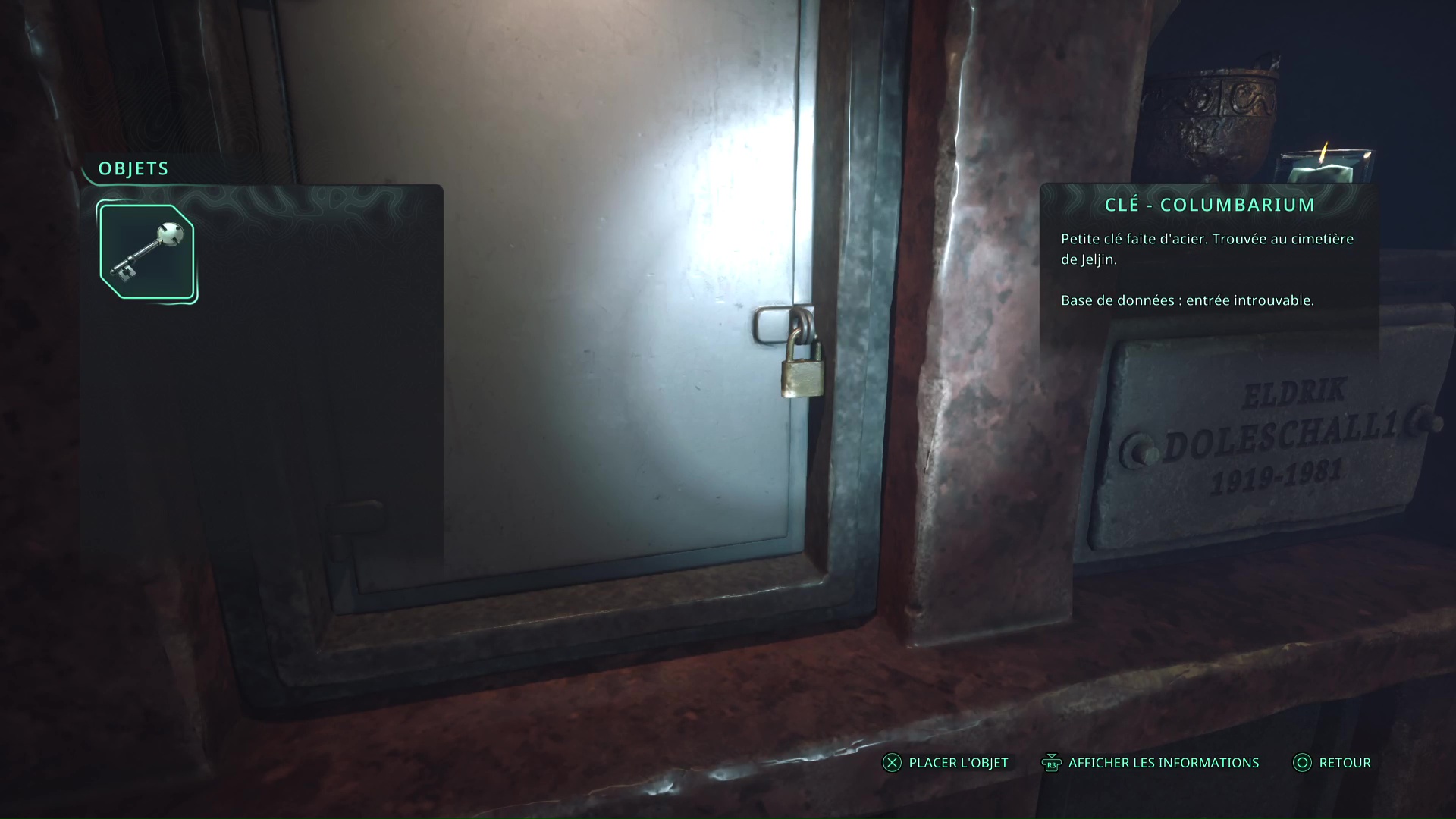 Tournez ensuite votre tête pour apercevoir un petit coffre. Déverrouillez-le grâce à la Clé – Columbarium pour y déposer l’urne, ce qui aura pour effet de compléter la bonne action.