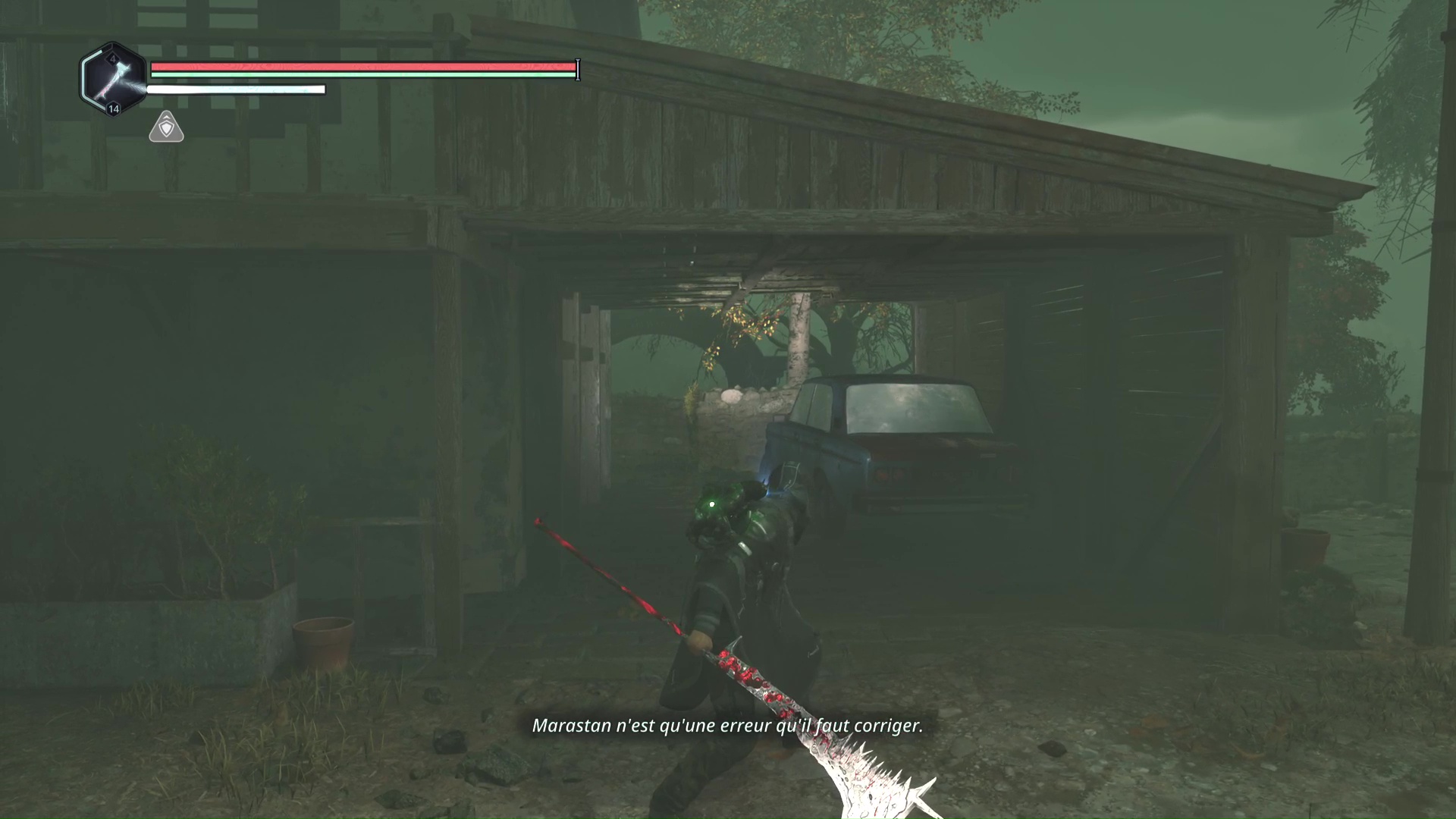 Retournez au village, entrez dans la maison grâce à la clé, et allez sur le balcon. Ramassez l’objet brillant, il s’agit des Clés – Voiture.