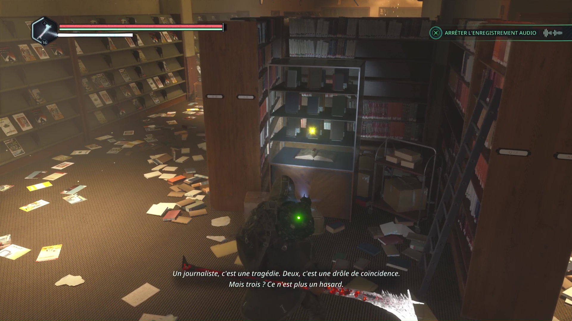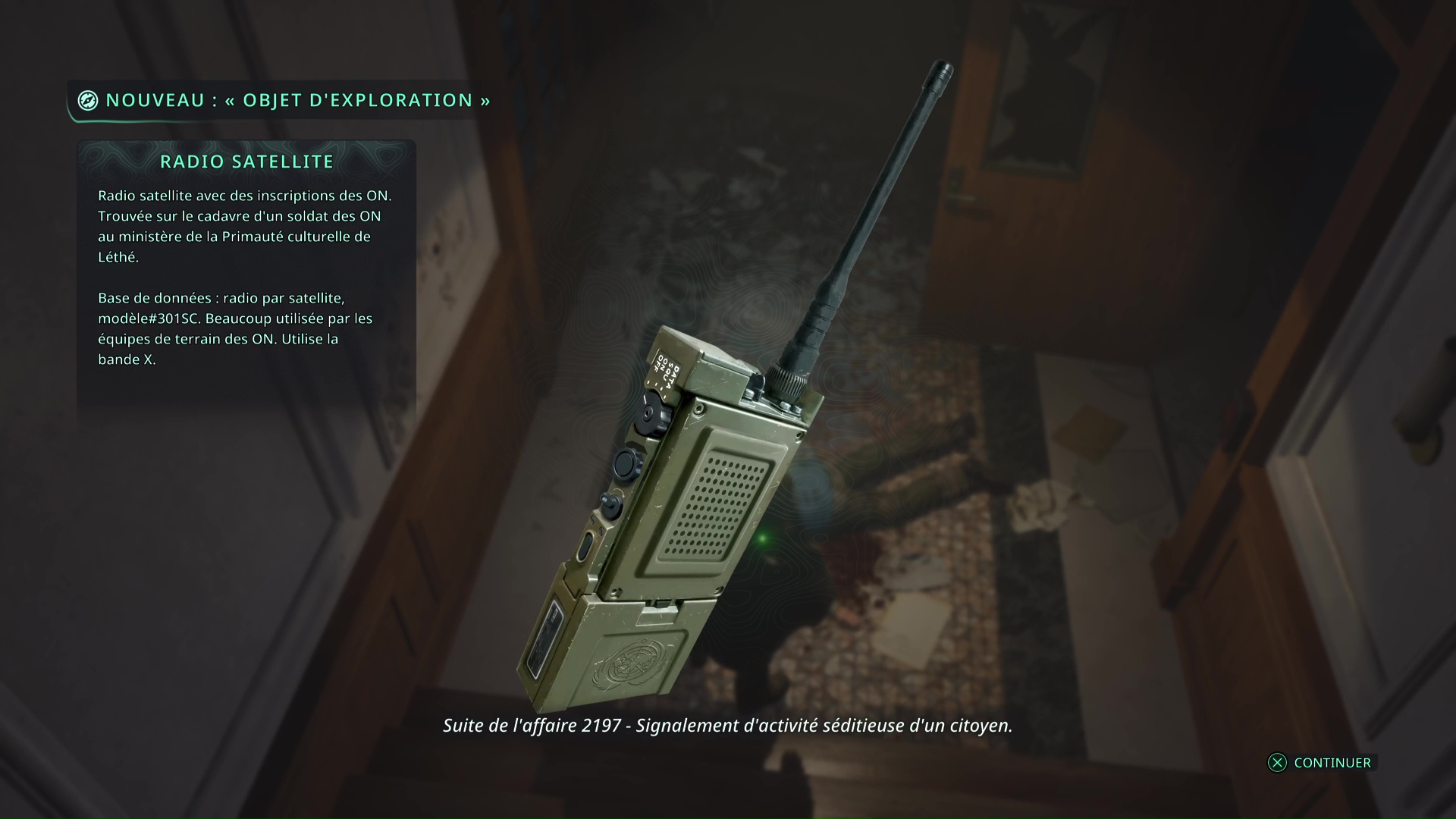 Pour la radio satellite, direction Lethé – Ministère de la Primauté culturelle. Dès votre arrivée, descendez le parking d’un étage et récupérez l’objet brillant sur le cadavre. Il s’agit d’un badge qui va vous aider pour la suite.