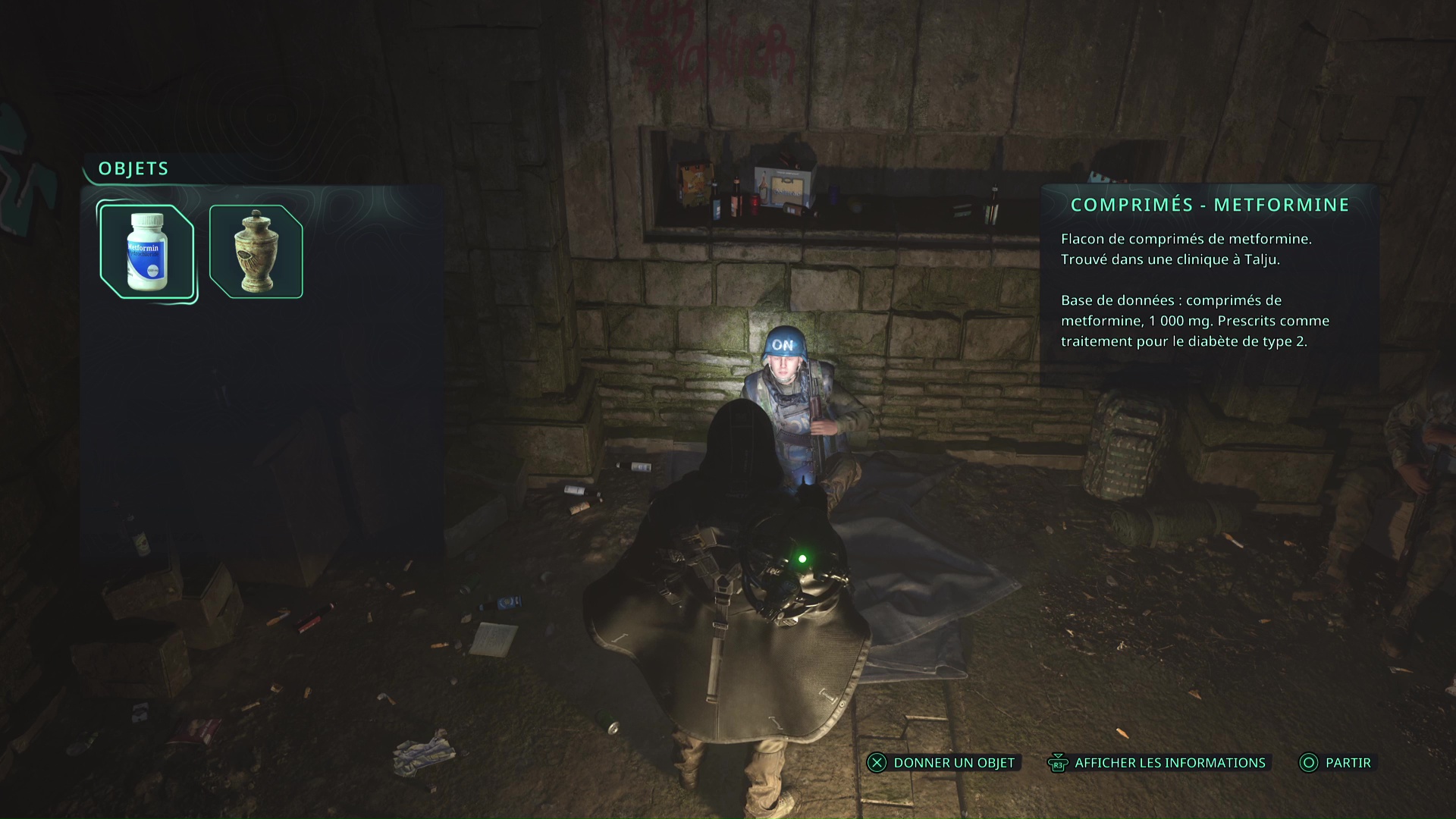 Les deux objets en votre possession, revenez auprès des deux soldats, donnez la metformine au soldat de gauche et la radio satellite au soldat de droite afin de valider la quête.